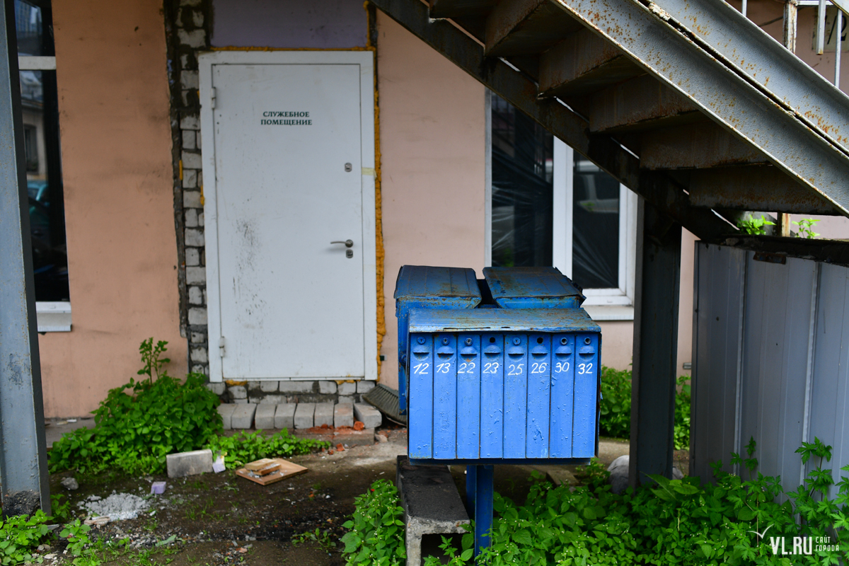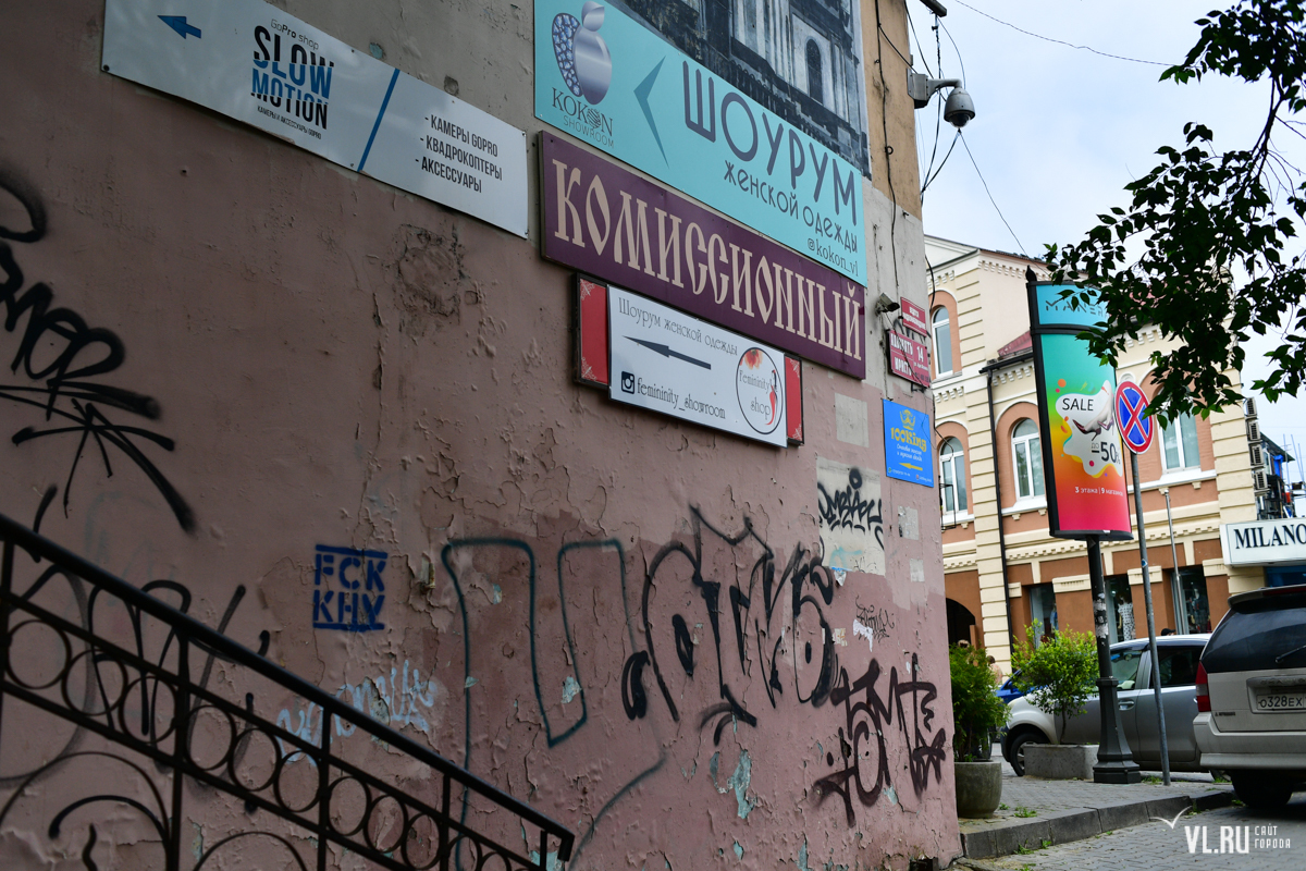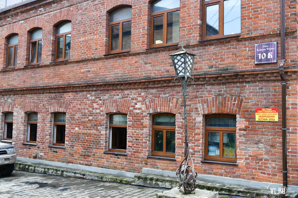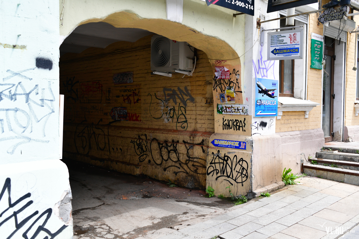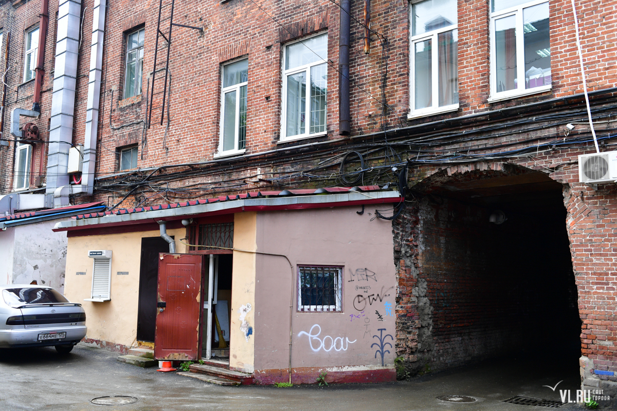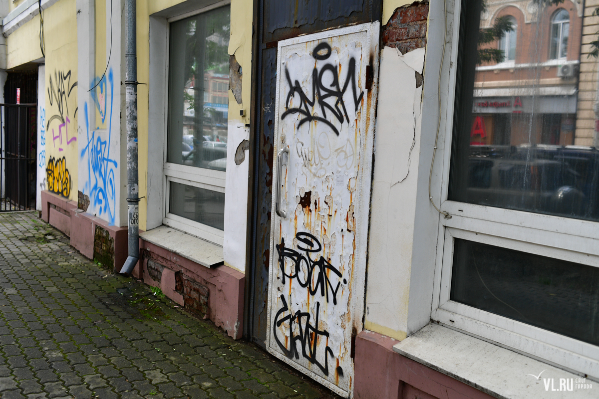 Фасад тоже нуждается в ремонте – штукатурка во многих местах осыпалась, не обошлось и без уродливых граффити на стенах и дверях. Встречаются надписи, сделанные по трафарету. Они очень напоминают экстремистские лозунги. Вы будете смеяться, но вторым собственником здания является управление Министерства внутренних дел Российской Федерации по Приморскому краю.