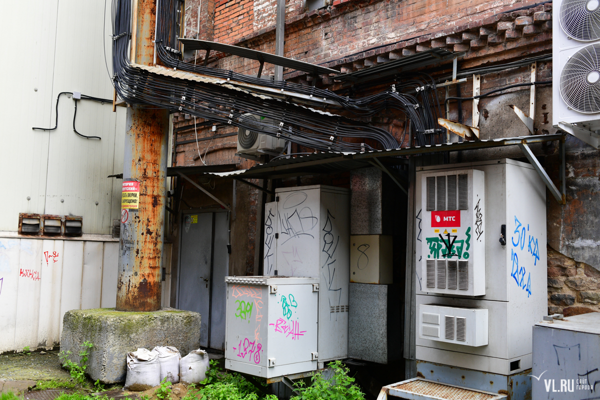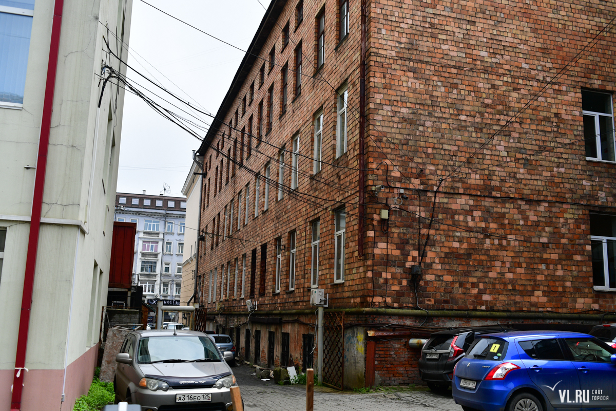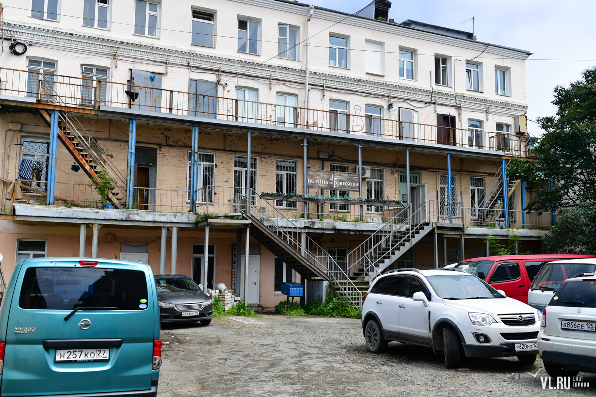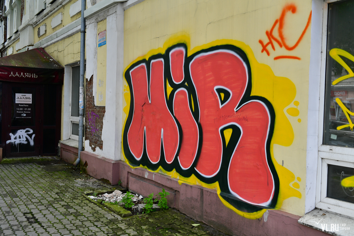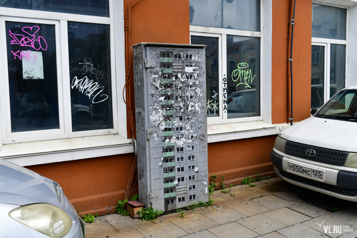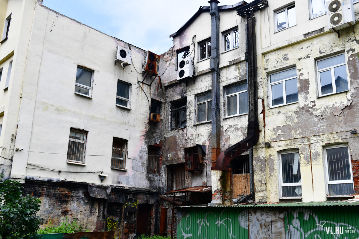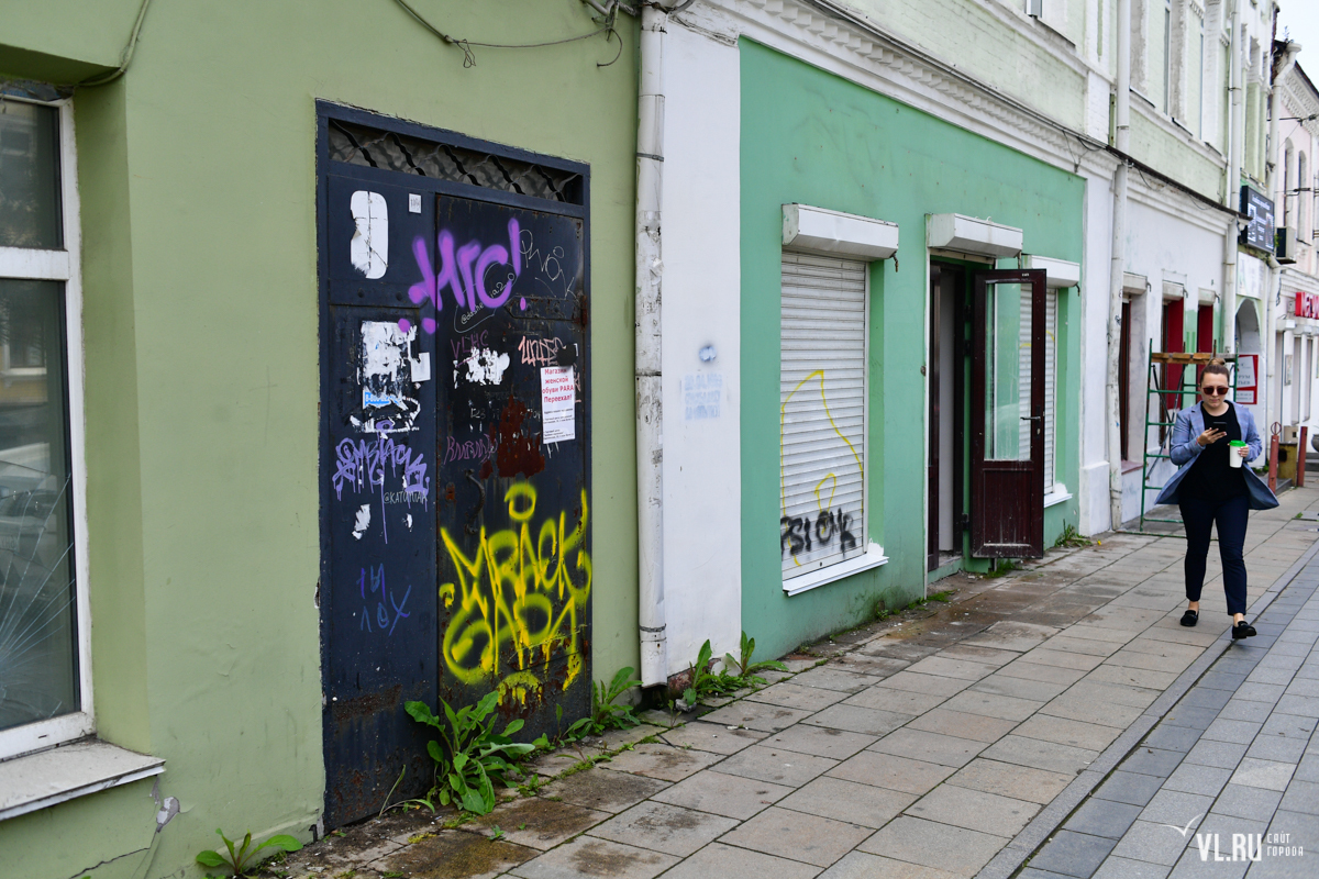 Фасад тоже нуждается в ремонте – штукатурка во многих местах осыпалась, не обошлось и без уродливых граффити на стенах и дверях. Встречаются надписи, сделанные по трафарету. Они очень напоминают экстремистские лозунги. Вы будете смеяться, но вторым собственником здания является управление Министерства внутренних дел Российской Федерации по Приморскому краю.