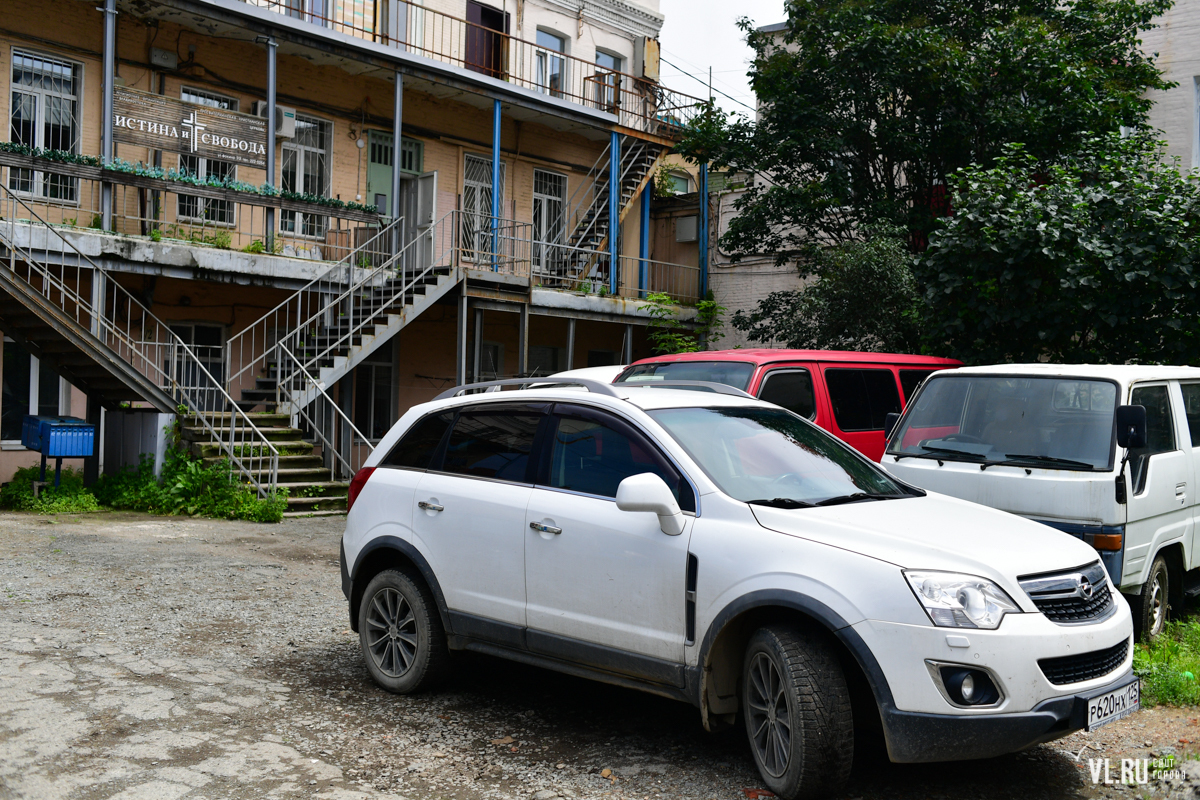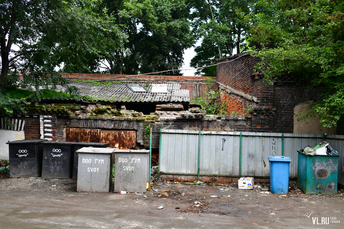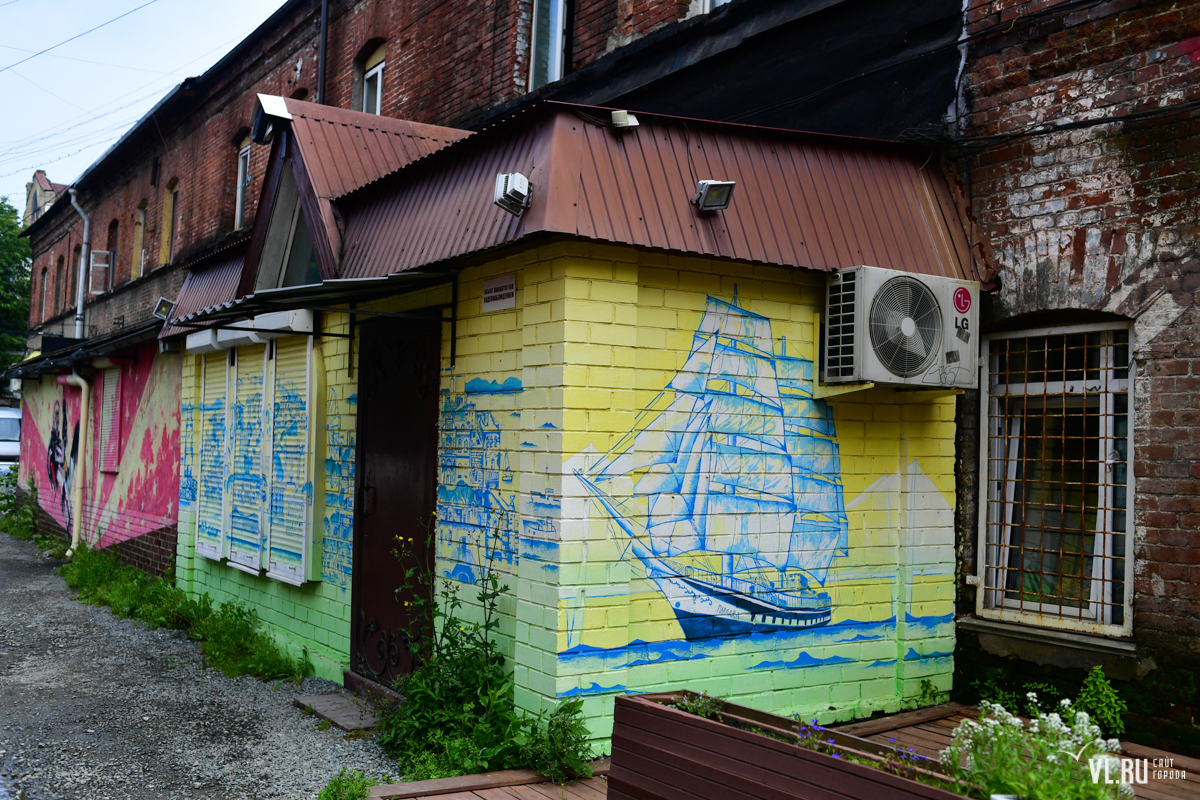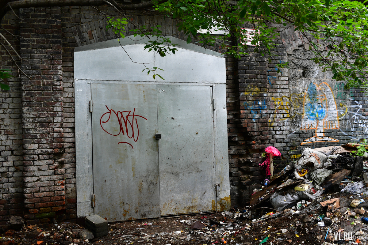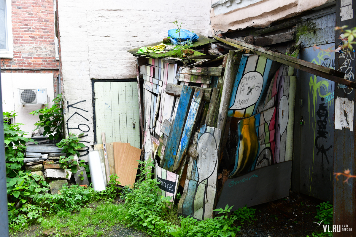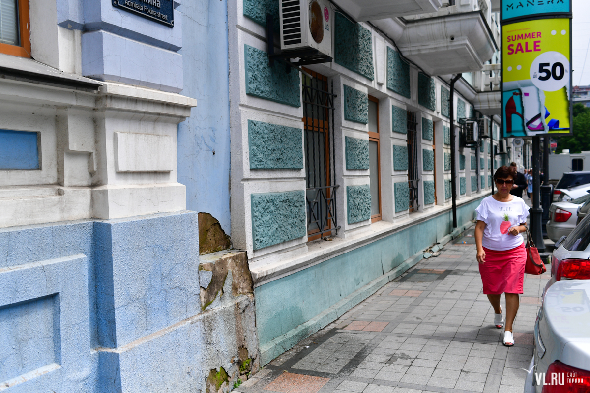 Фасад тоже нуждается в ремонте – штукатурка во многих местах осыпалась, не обошлось и без уродливых граффити на стенах и дверях. Встречаются надписи, сделанные по трафарету. Они очень напоминают экстремистские лозунги. Вы будете смеяться, но вторым собственником здания является управление Министерства внутренних дел Российской Федерации по Приморскому краю.