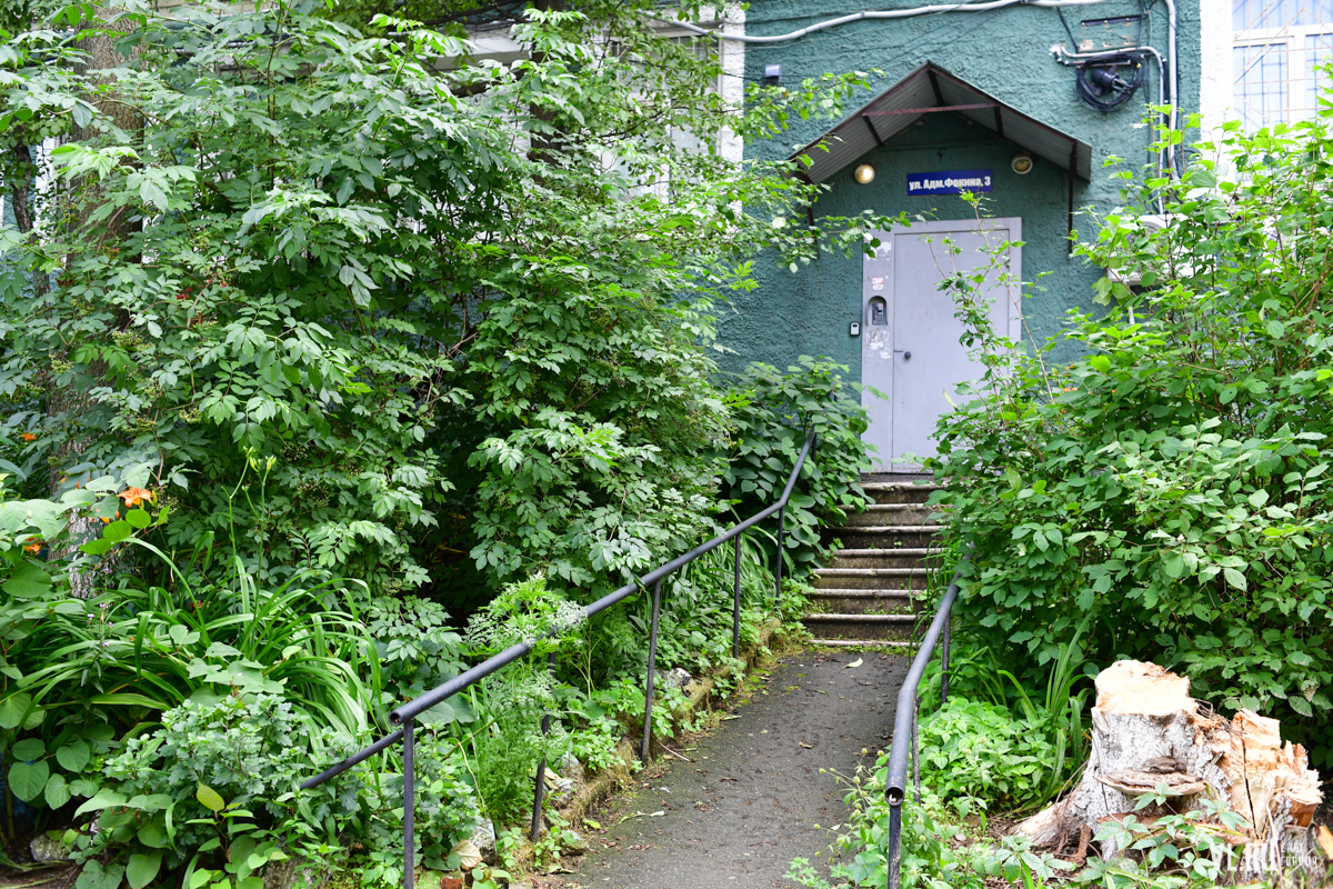 Все остальные три пути слева от Фокина ближе к Пограничной и Семеновской ведут в тупики. Проход между Фокина, 5а и 7 ведет к Фокина, 7а. Это здание примечательно своим внешним видом: для того, чтобы попасть в квартиры, нужно идти не через подъезд, как в обычном доме, а по разветвленным лестницам. Почтовые ящики на улице, здесь же и мусорка. С обратной стороны Фокина, 7 – грузовик-двухтонник, по виду явно брошенный.