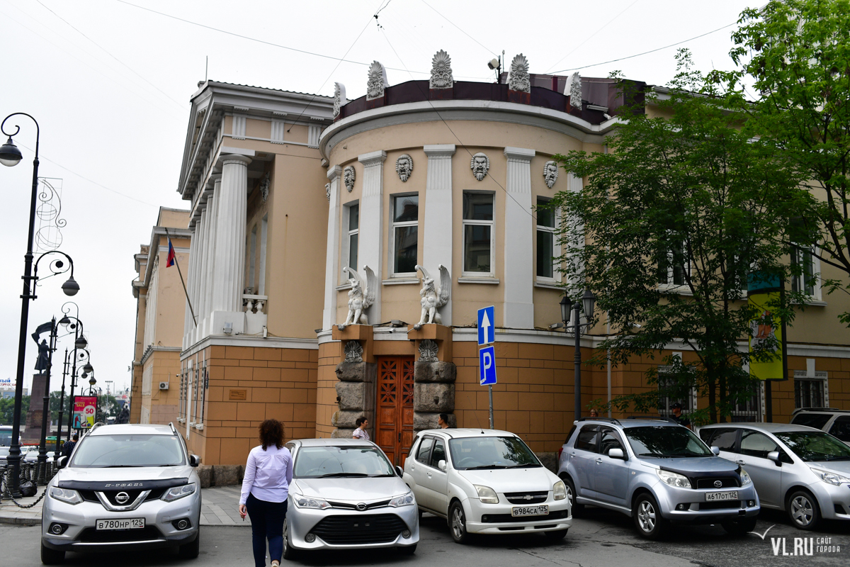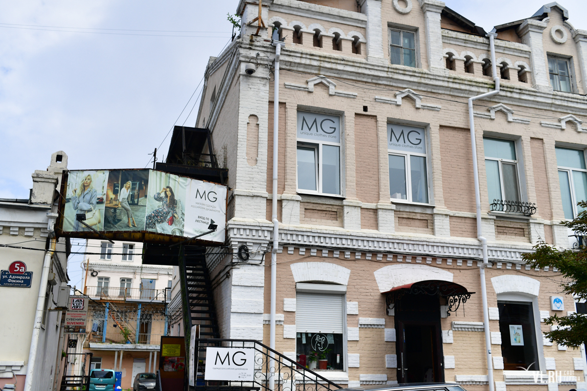 Наконец мы вновь на Фокина. И первое, что бросается в глаза, историческое здание театра-кабаре «Модерн» Александра Купера (Адмирала Фокина, 12). В 2016 году крыша этого дома сгорела, ее не восстановили до сих пор. По иронии, одним из собственников значится территориальное управление Федерального агентства по управлению государственным имуществом в Приморском крае.