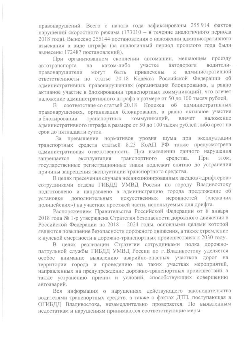 И вот еще что любопытно: ГИБДД объясняет, что дрифт подразумевает прохождение поворотов в управляемом заносе на максимально возможных скорости и углу к траектории. Дальше дословно: «При этом, как правило, водители, пускающие свое транспортное средство в управляемый занос, не превышают установленной скорости движения и не допускает выезда за пределы выделенной полосы». В ответе ГИБДД о количестве штрафов, выписанных за блокирование дороги, шум или превышение скорости, не говорится ни слова.