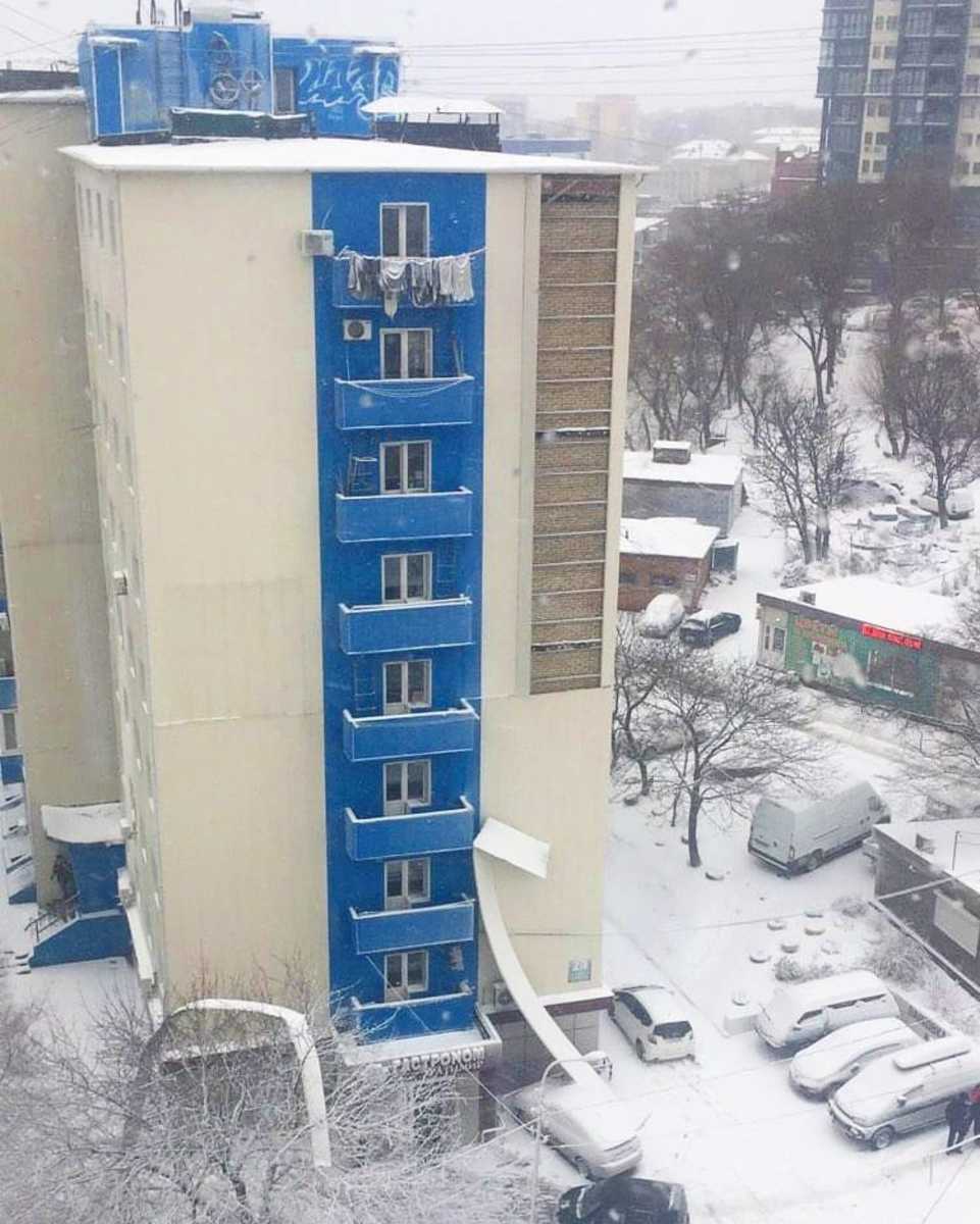 Обновление 11:18: На проспекте 100-летия Владивостока, 24 с дома сорвало обшивку, сообщает @nn_vladivostok.