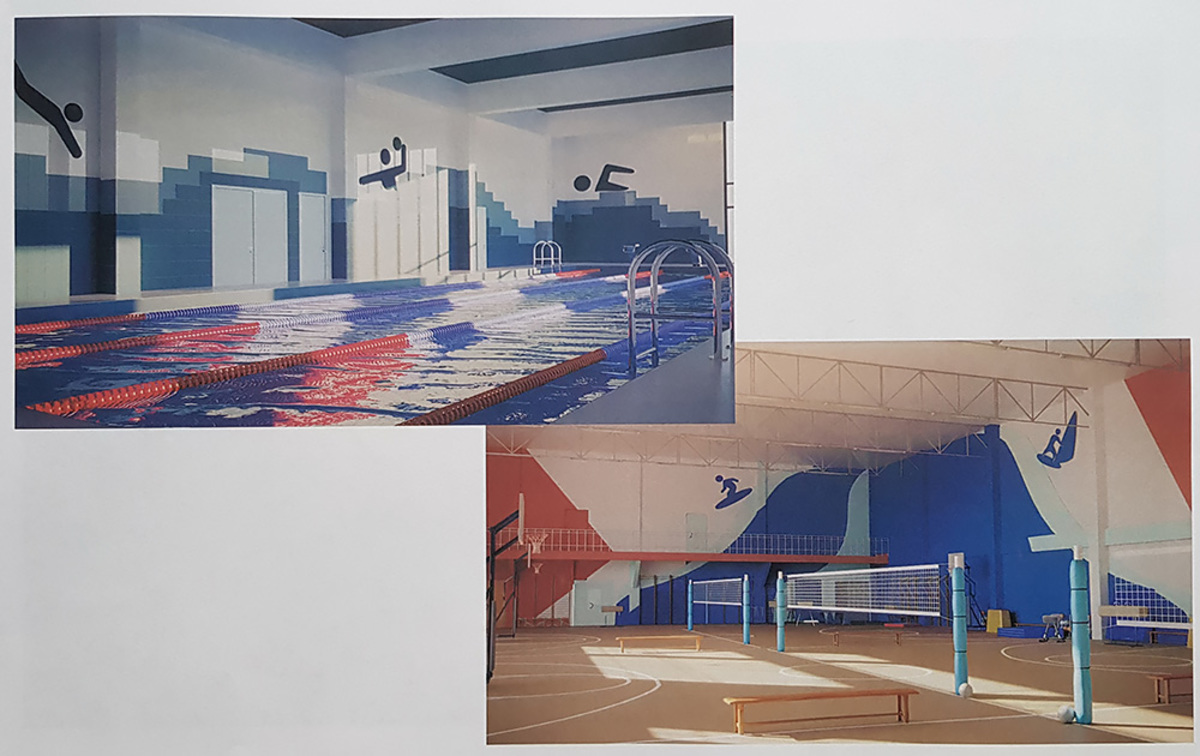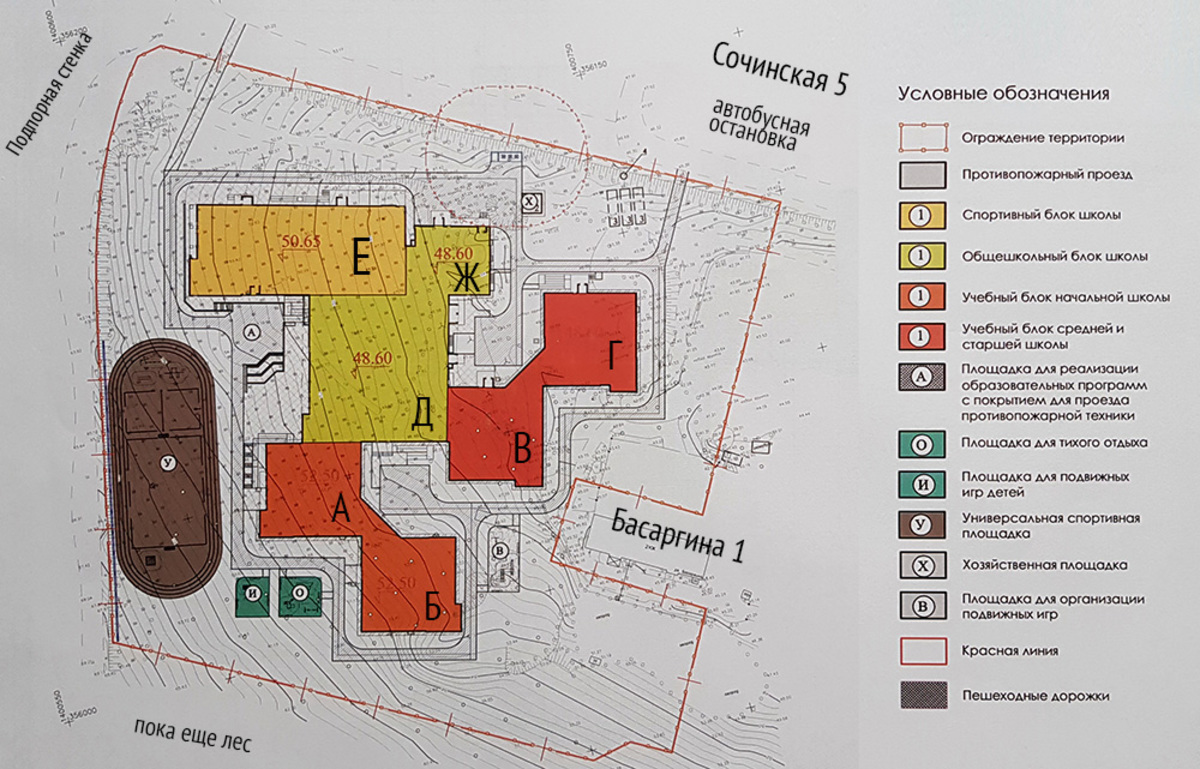 В блоке Ж также находятся производственные помещения столовой. В блоке Е на первом этаже – бассейн с двумя чашами – 25 на 8,5 метра на пять дорожек и 8,5 на 2,5 метра для младших классов. Универсальный спортивный зал 42 на 24 метра – на втором этаже блока Е. Он зонирован как для одновременных занятий трех классов, так и по видам программы физического воспитания с возможностью организации игрового поля в пределах всей площади.