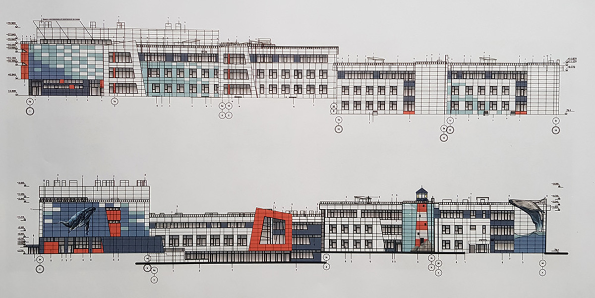 Школа будет представлять собой семь трехэтажных блоков с разделением на две функциональные группы: учебную и общешкольную. Земельный участок 25:28:030014:1304, где будет располагаться школа, имеет сложную форму рельефа с перепадом отметок с востока на запад – 20 метров, а перепад в пределах площади застройки – 9,9 метра. Поэтому все блоки здания сгруппированы ступенеобразно в двух уровнях.