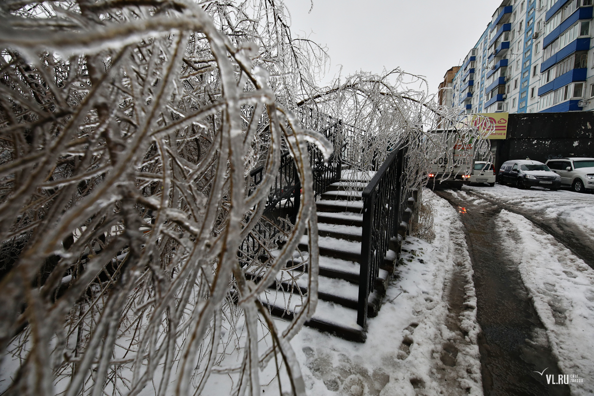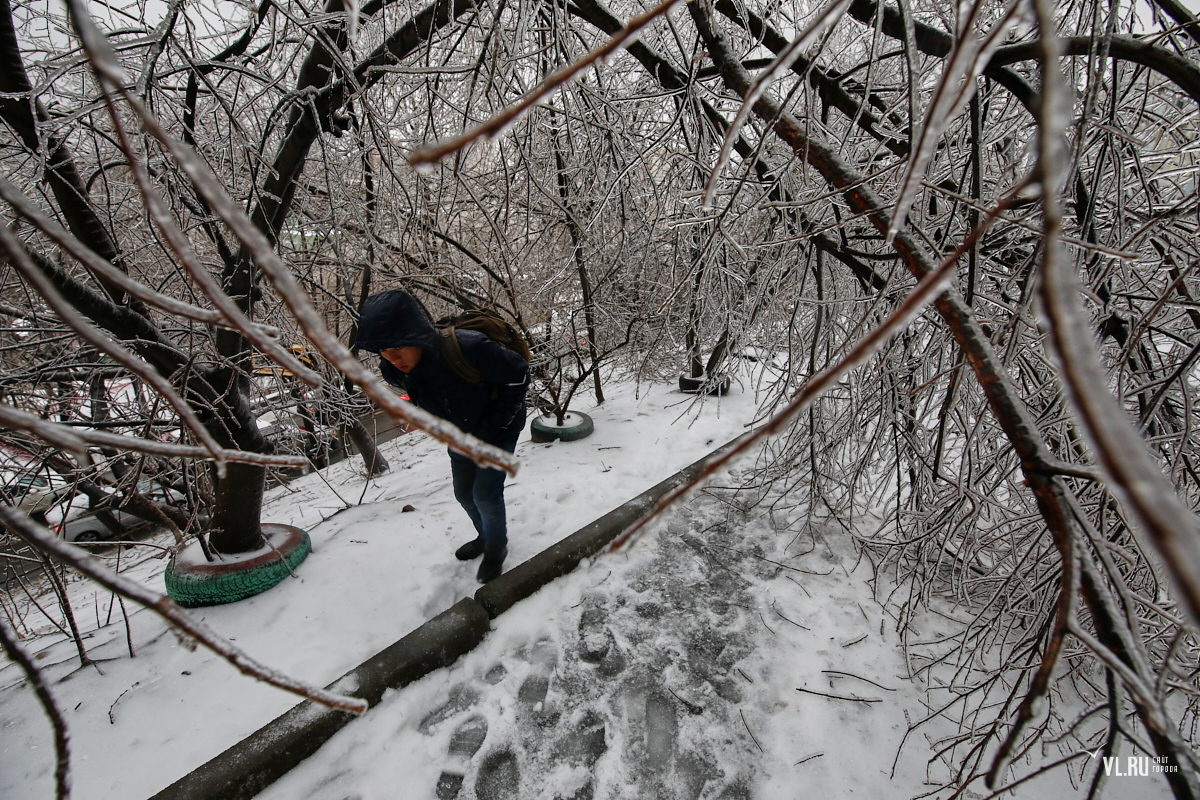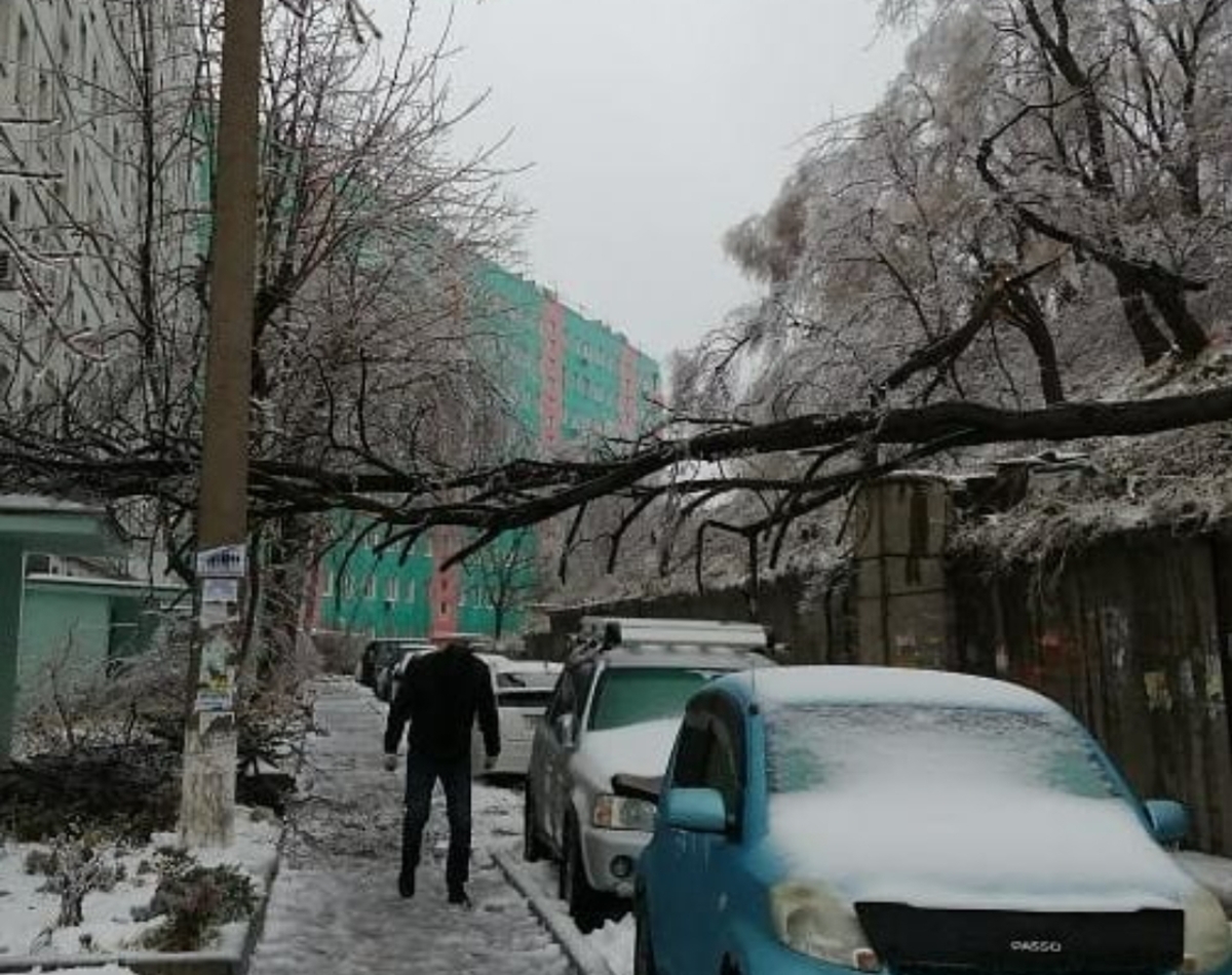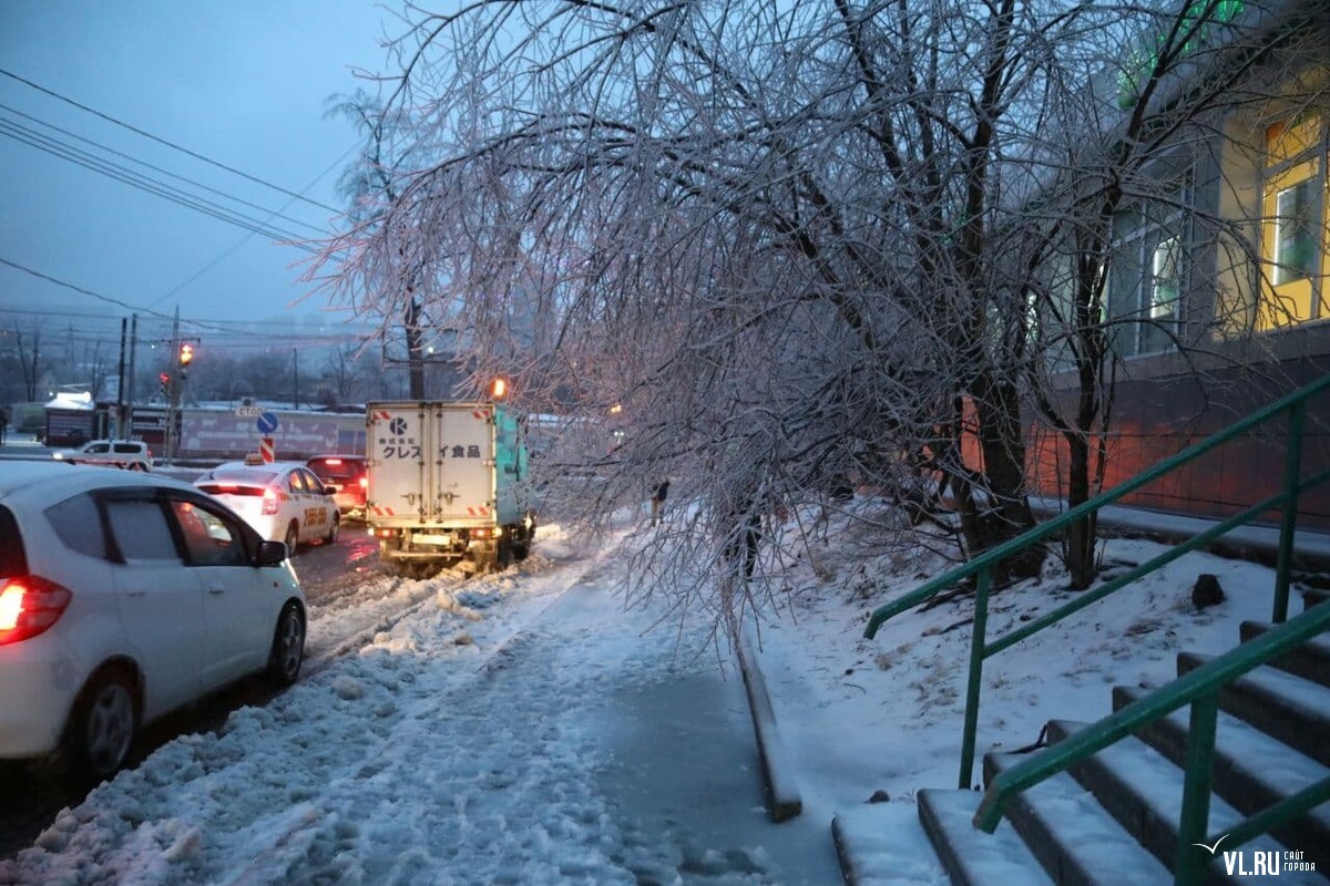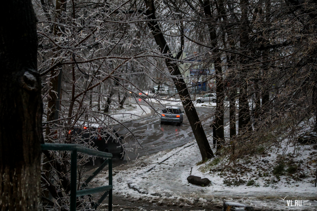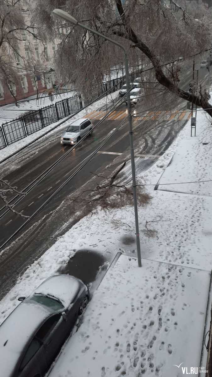Утро четверга, 19 ноября, обернулось для жителей Владивостока неудобствами, характерными для первого снегопада. Из-за спада температур и дождя со снегом дороги и тротуары покрылись коркой льда, превращая путь на работу в испытание, некоторые деревья во дворах и возле главных транспортных артерий замёрзли и начали ломаться, а городские трамваи перестали курсировать.