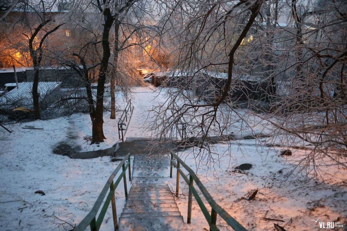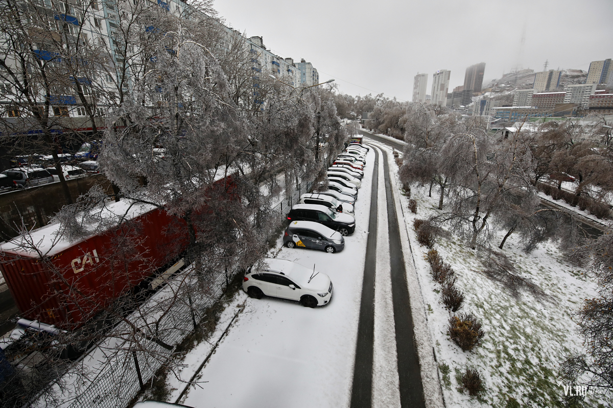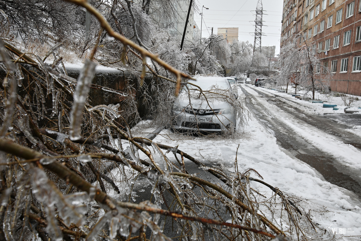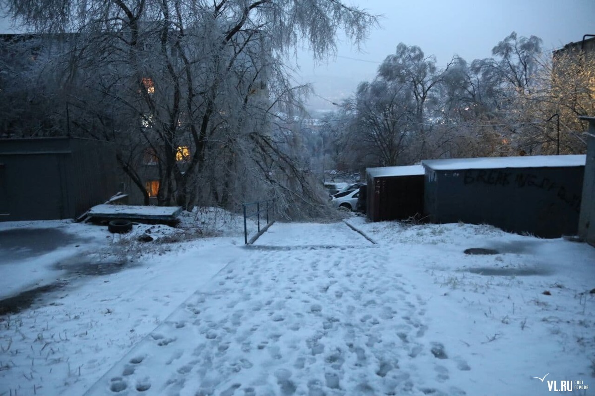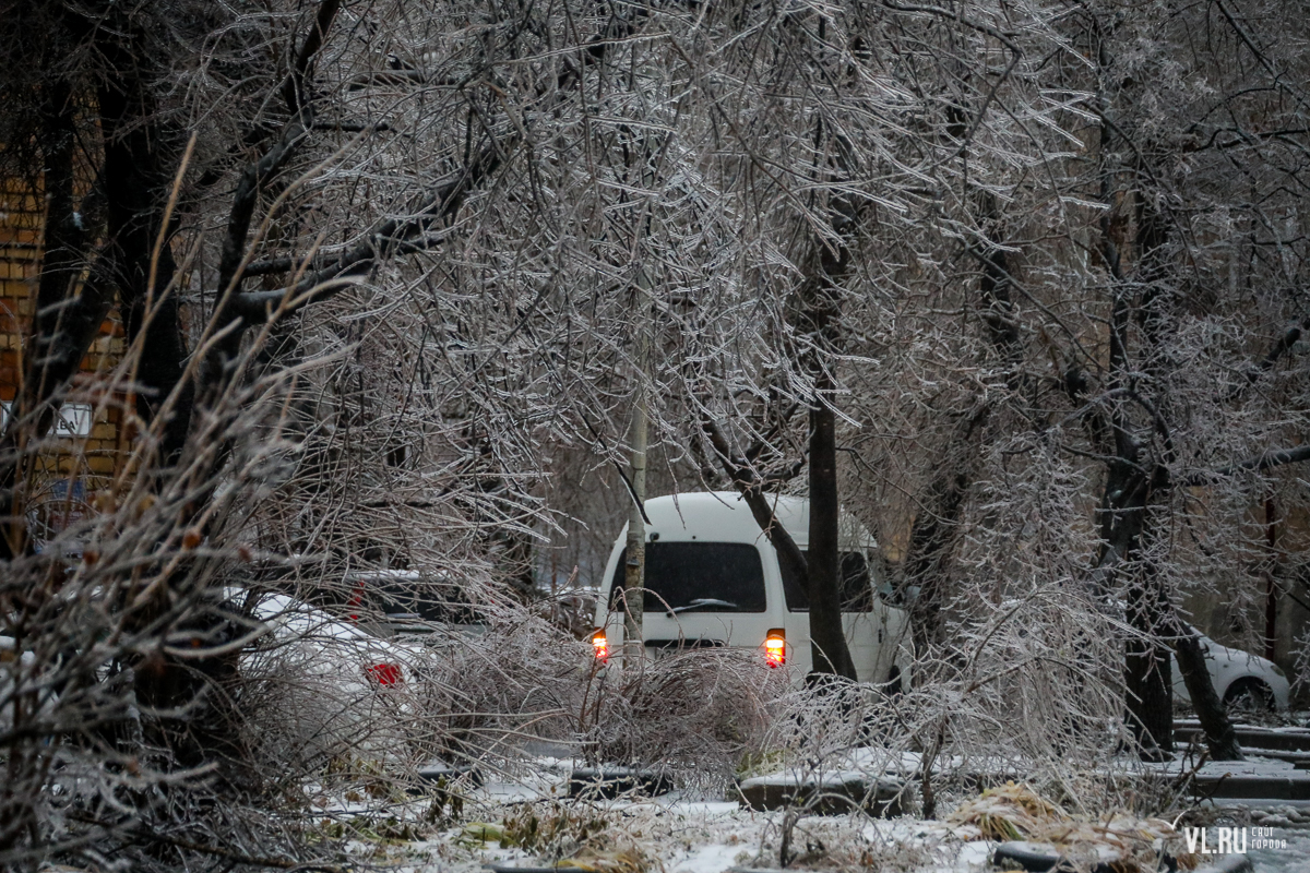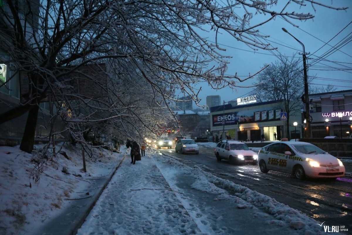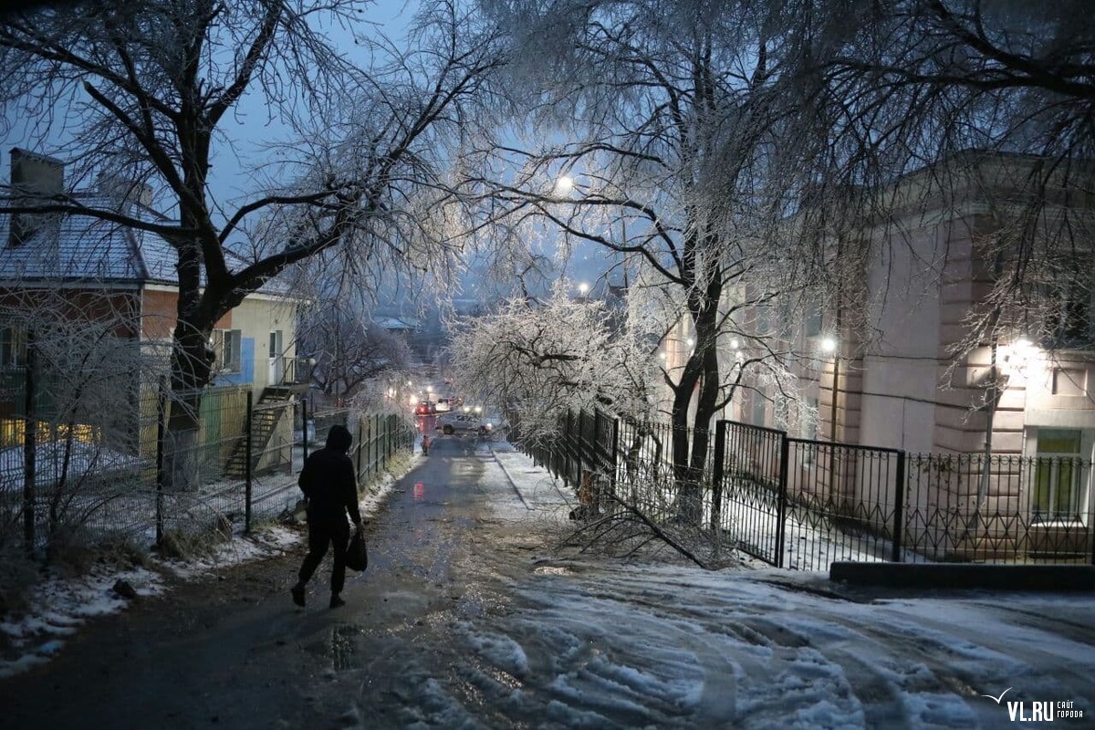 Утро четверга, 19 ноября, обернулось для жителей Владивостока неудобствами, характерными для первого снегопада. Из-за спада температур и дождя со снегом дороги и тротуары покрылись коркой льда, превращая путь на работу в испытание, некоторые деревья во дворах и возле главных транспортных артерий замёрзли и начали ломаться, а городские трамваи перестали курсировать.