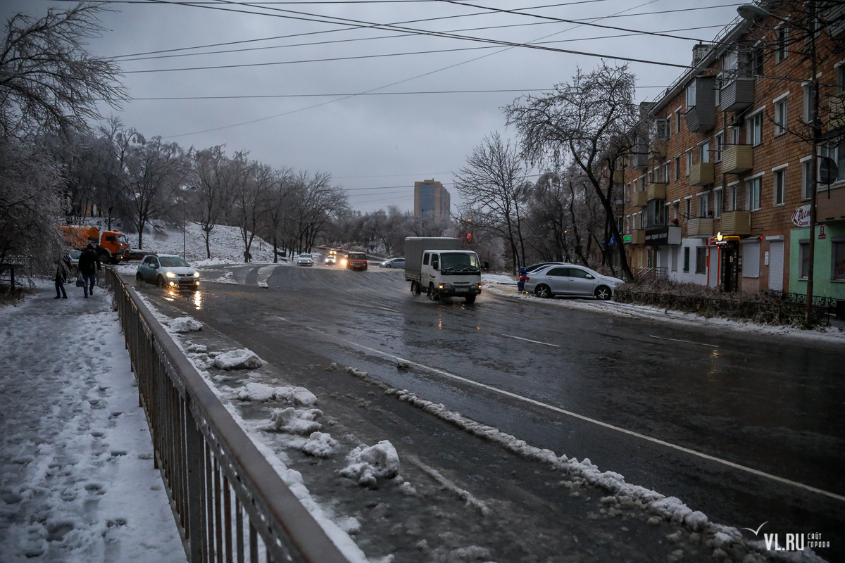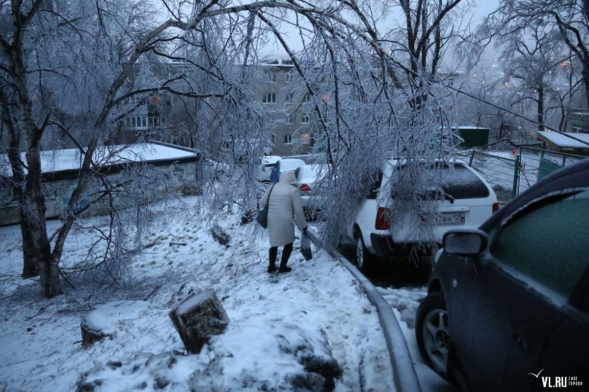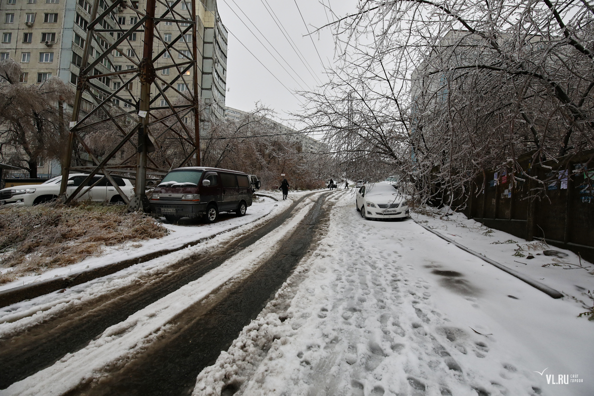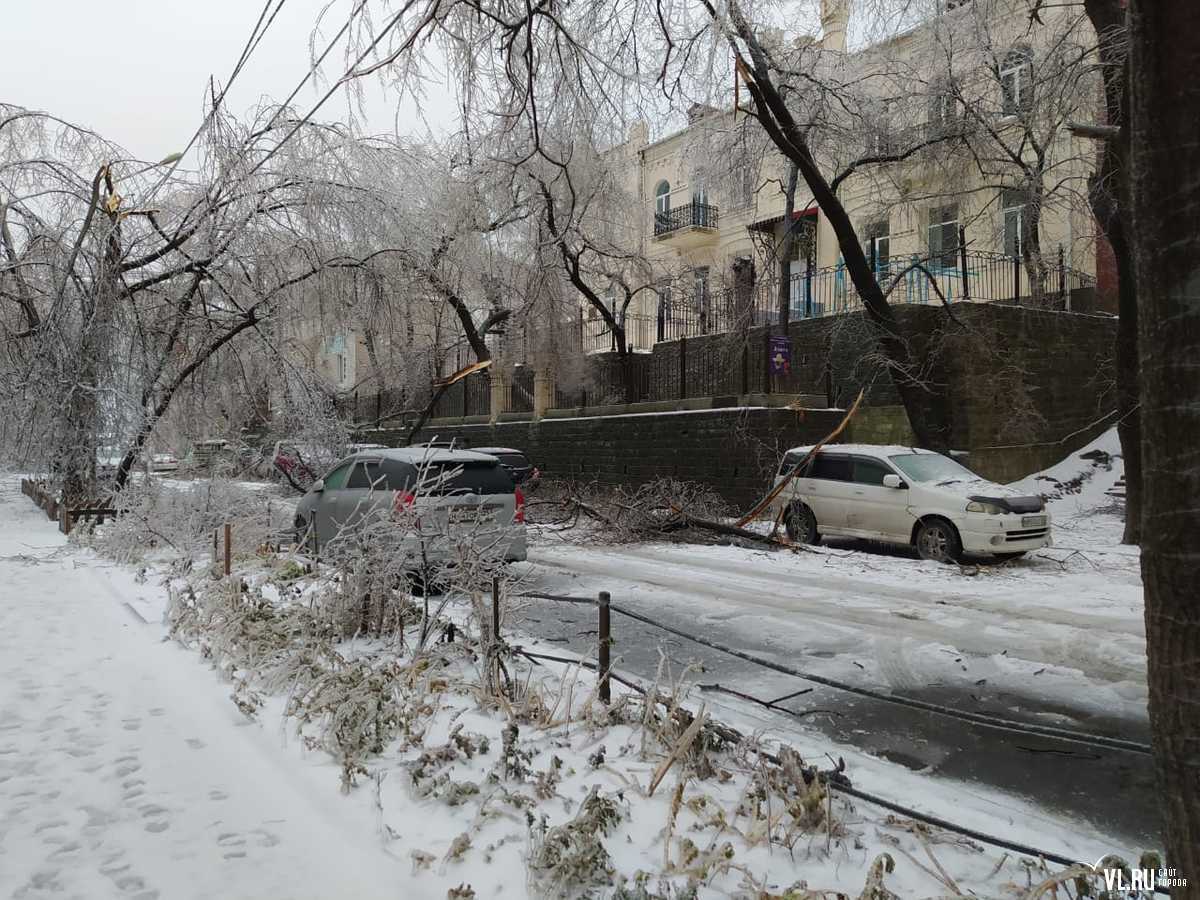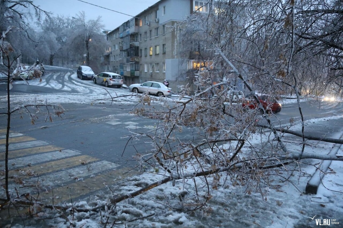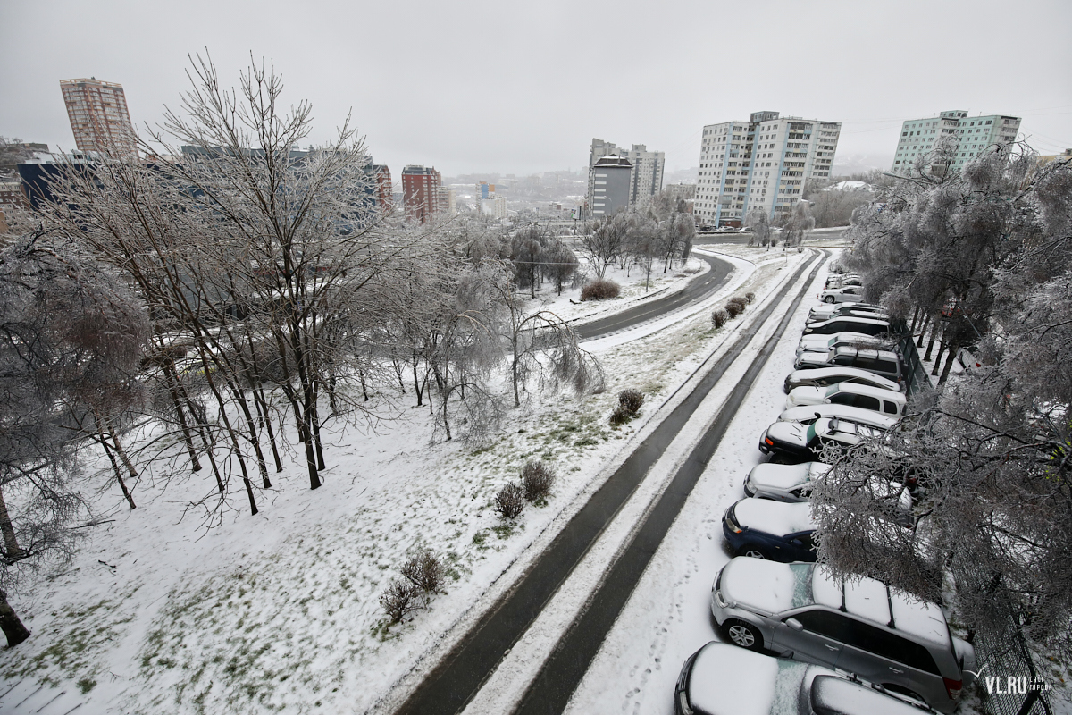 Утро четверга, 19 ноября, обернулось для жителей Владивостока неудобствами, характерными для первого снегопада. Из-за спада температур и дождя со снегом дороги и тротуары покрылись коркой льда, превращая путь на работу в испытание, некоторые деревья во дворах и возле главных транспортных артерий замёрзли и начали ломаться, а городские трамваи перестали курсировать.