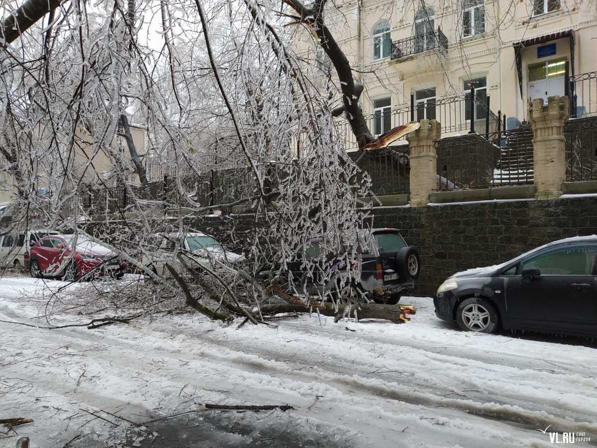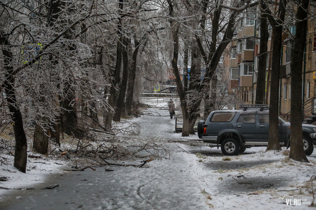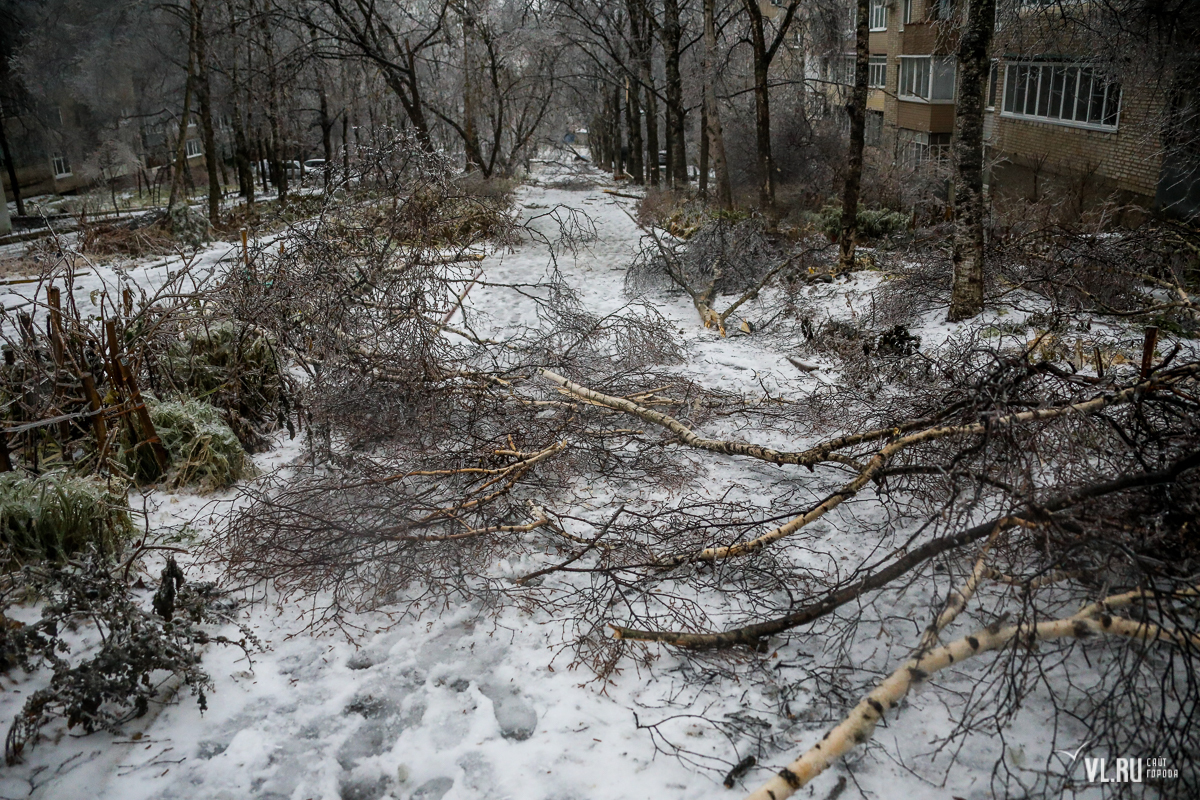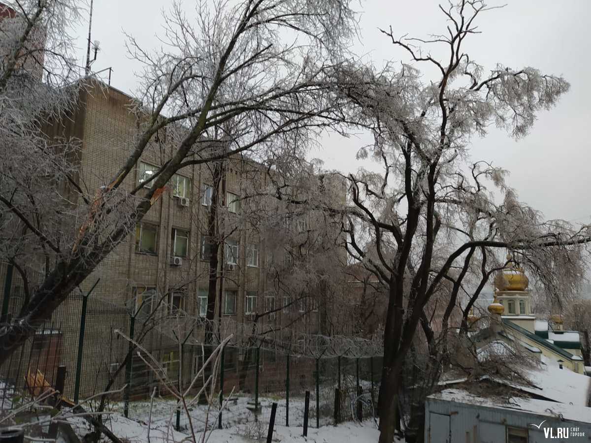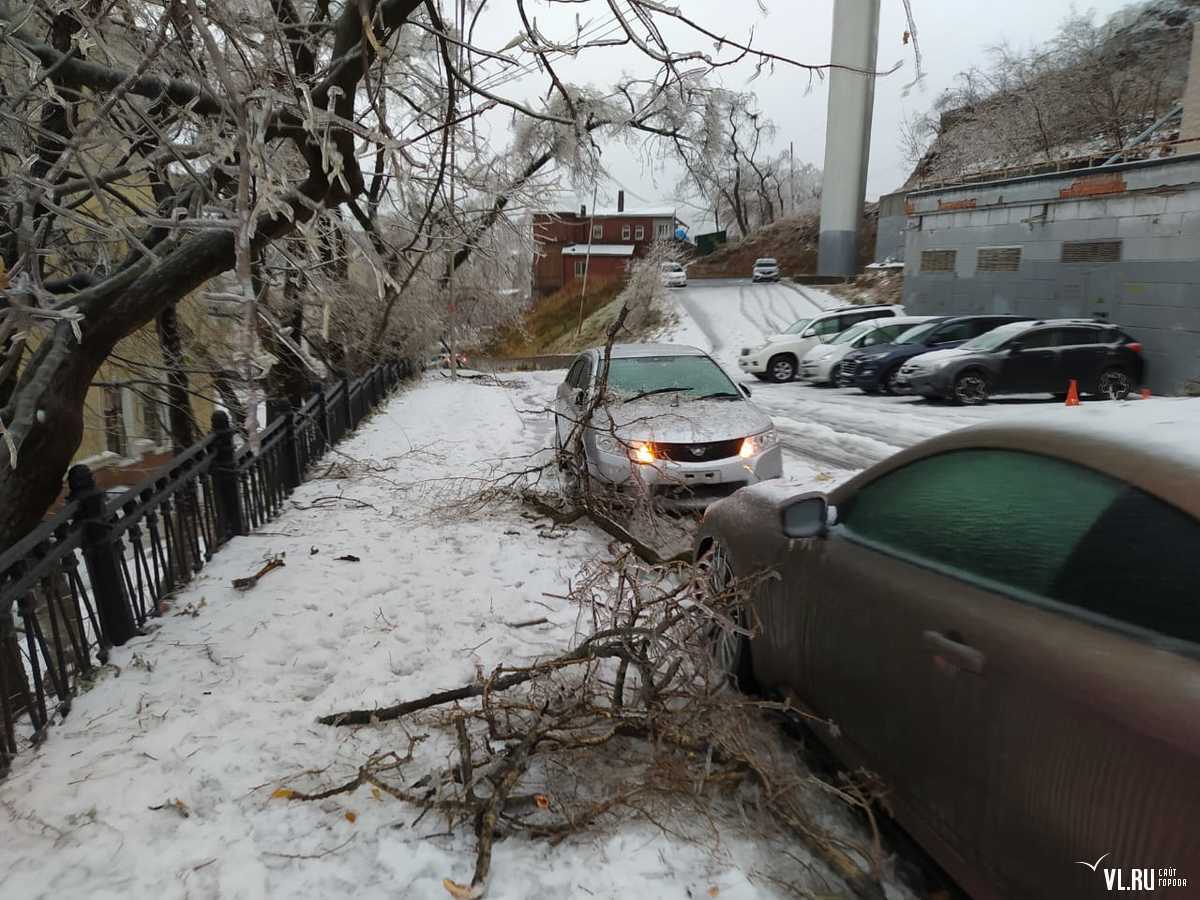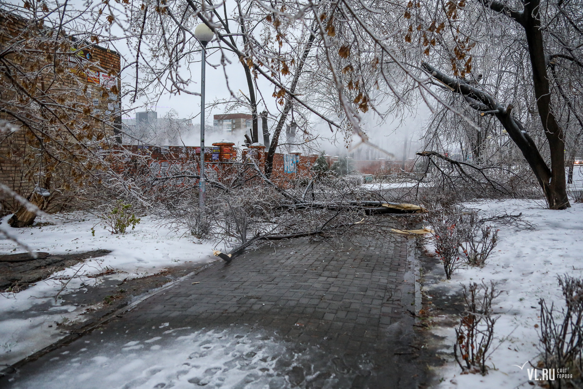Утро четверга, 19 ноября, обернулось для жителей Владивостока неудобствами, характерными для первого снегопада. Из-за спада температур и дождя со снегом дороги и тротуары покрылись коркой льда, превращая путь на работу в испытание, некоторые деревья во дворах и возле главных транспортных артерий замёрзли и начали ломаться, а городские трамваи перестали курсировать.