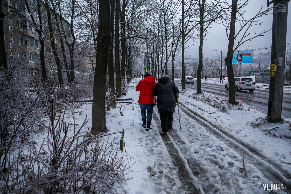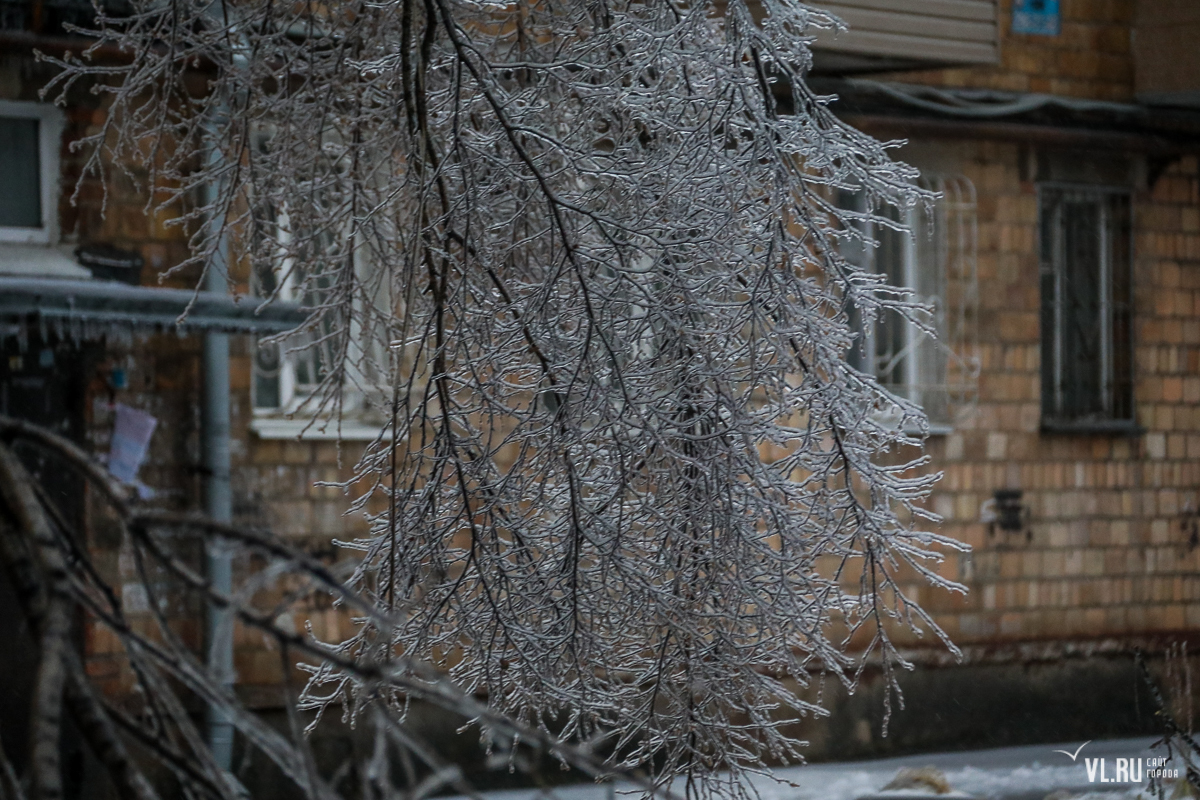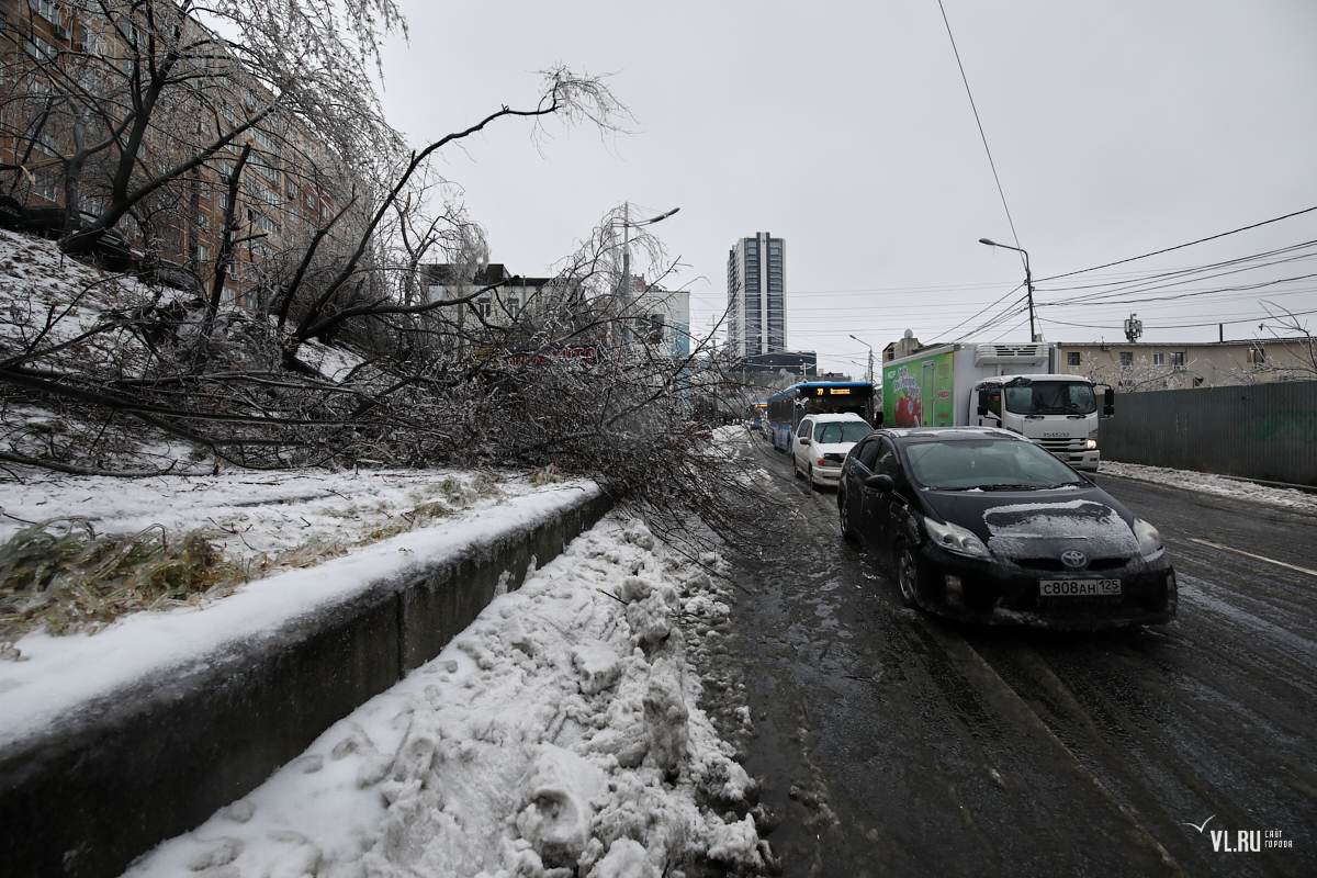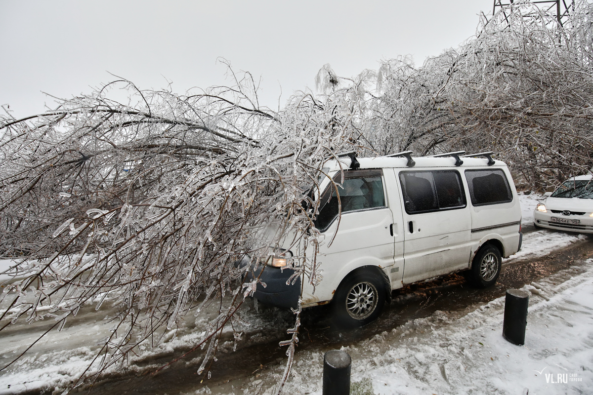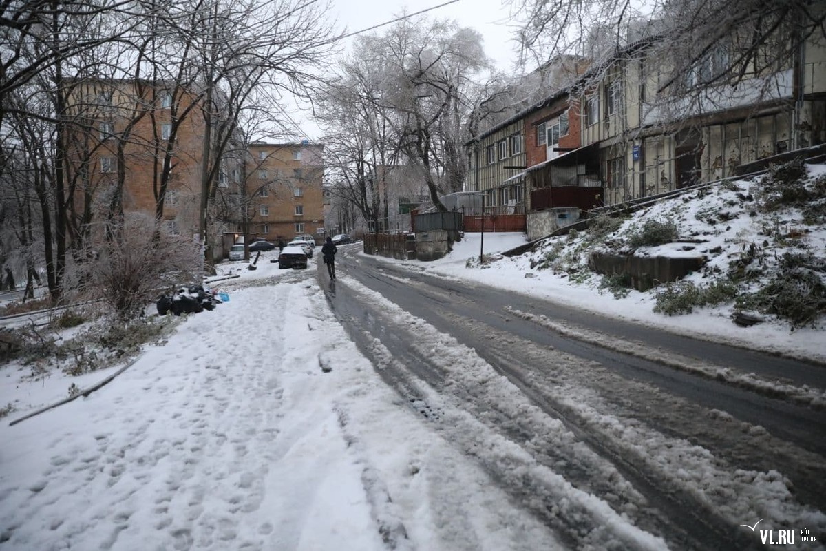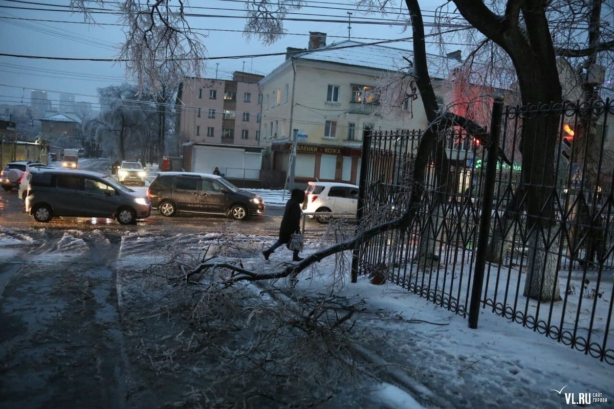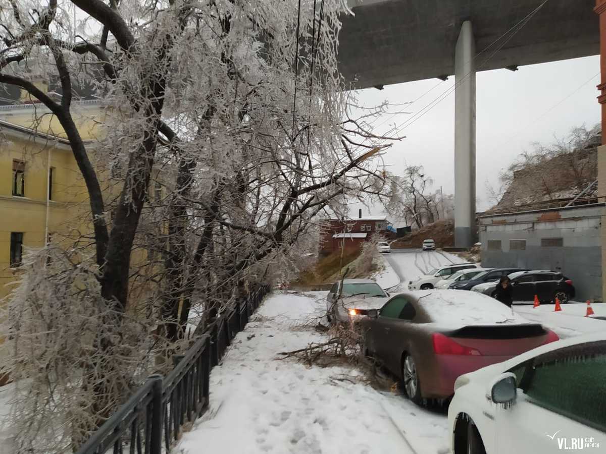 Утро четверга, 19 ноября, обернулось для жителей Владивостока неудобствами, характерными для первого снегопада. Из-за спада температур и дождя со снегом дороги и тротуары покрылись коркой льда, превращая путь на работу в испытание, некоторые деревья во дворах и возле главных транспортных артерий замёрзли и начали ломаться, а городские трамваи перестали курсировать.