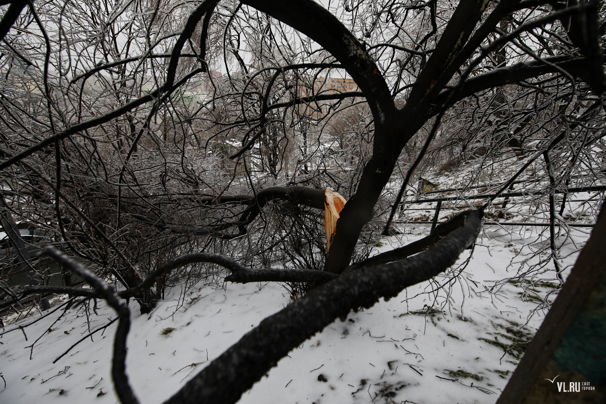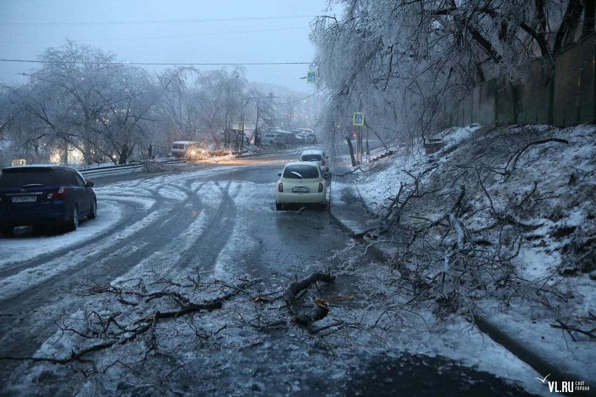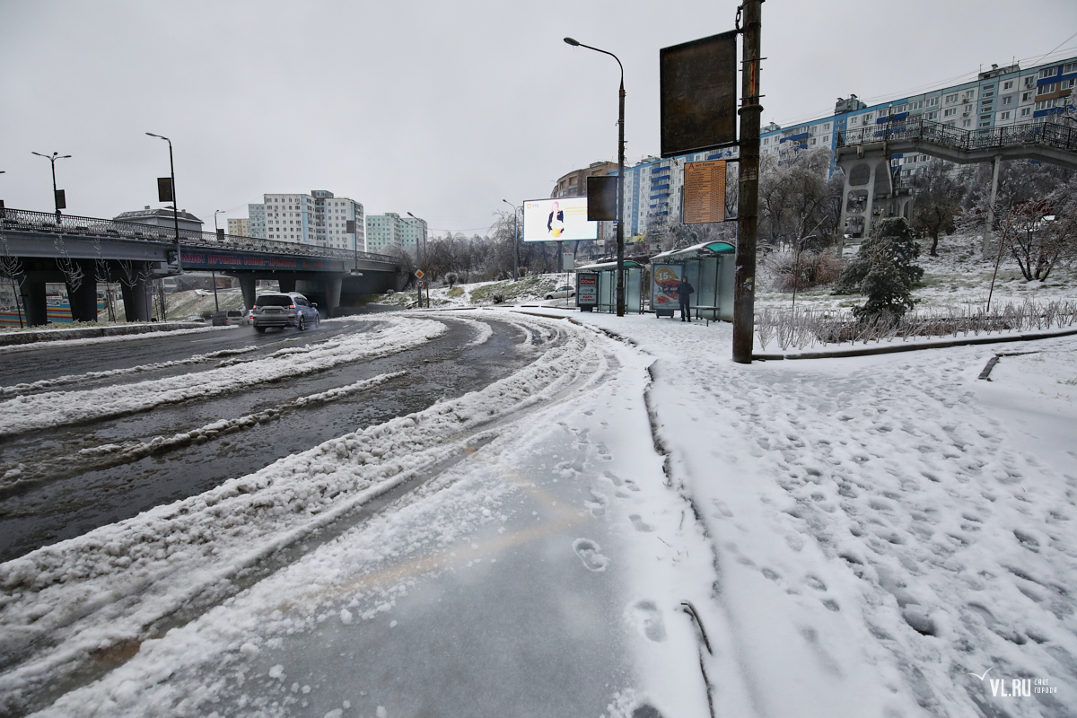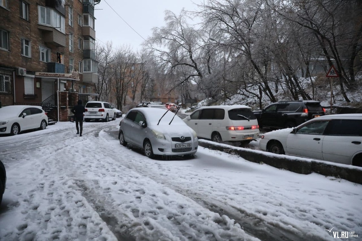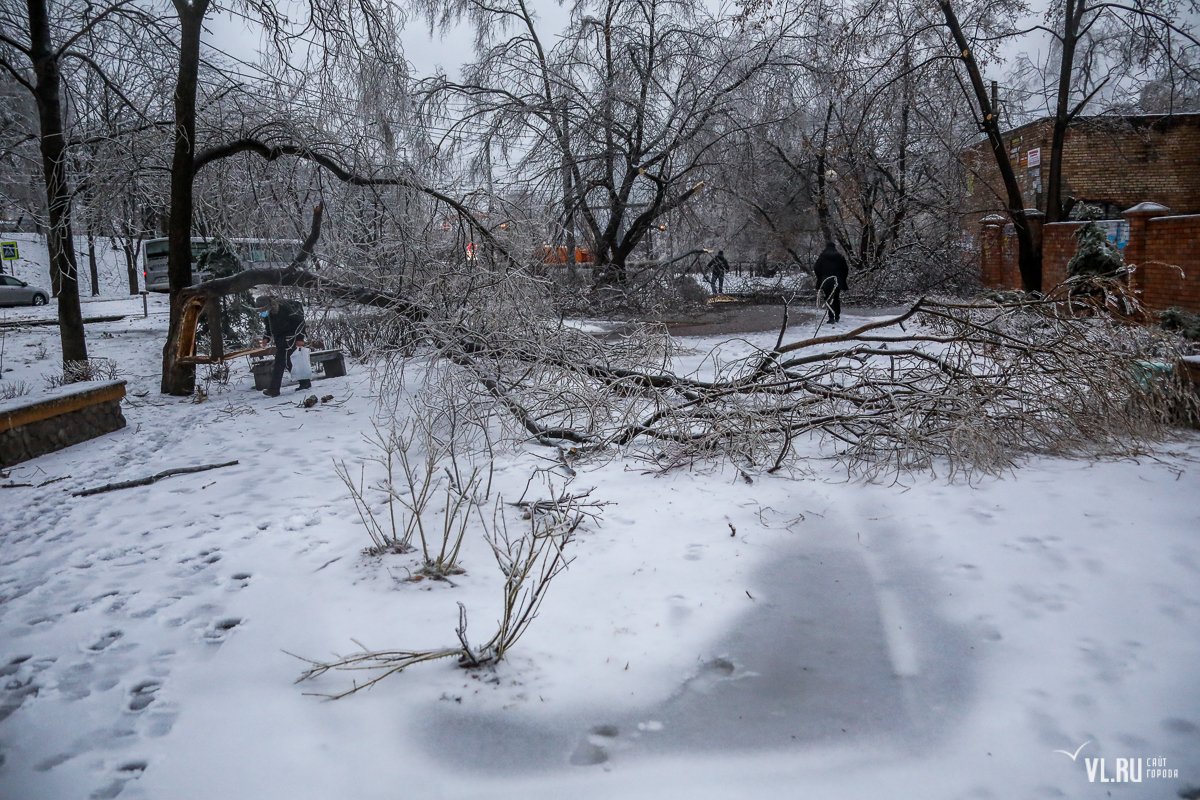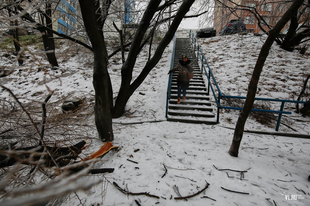 Утро четверга, 19 ноября, обернулось для жителей Владивостока неудобствами, характерными для первого снегопада. Из-за спада температур и дождя со снегом дороги и тротуары покрылись коркой льда, превращая путь на работу в испытание, некоторые деревья во дворах и возле главных транспортных артерий замёрзли и начали ломаться, а городские трамваи перестали курсировать.