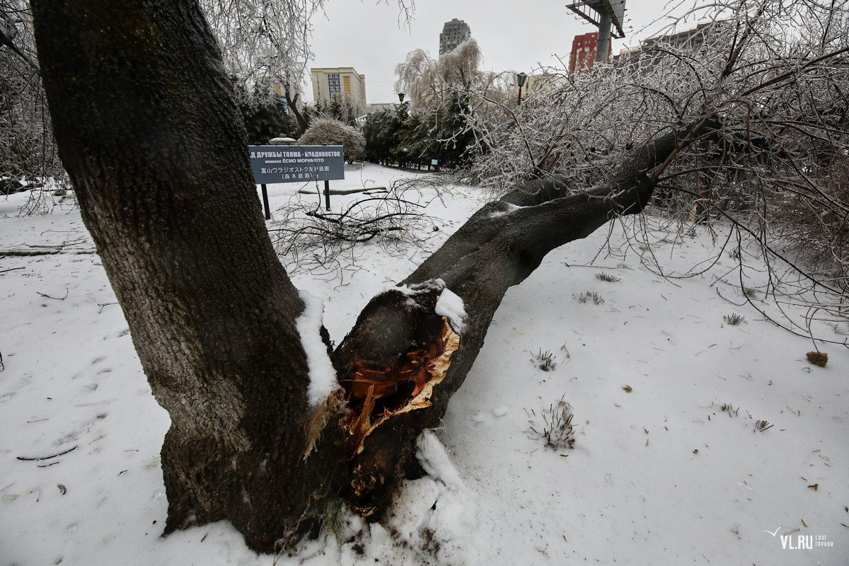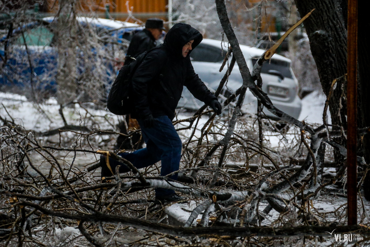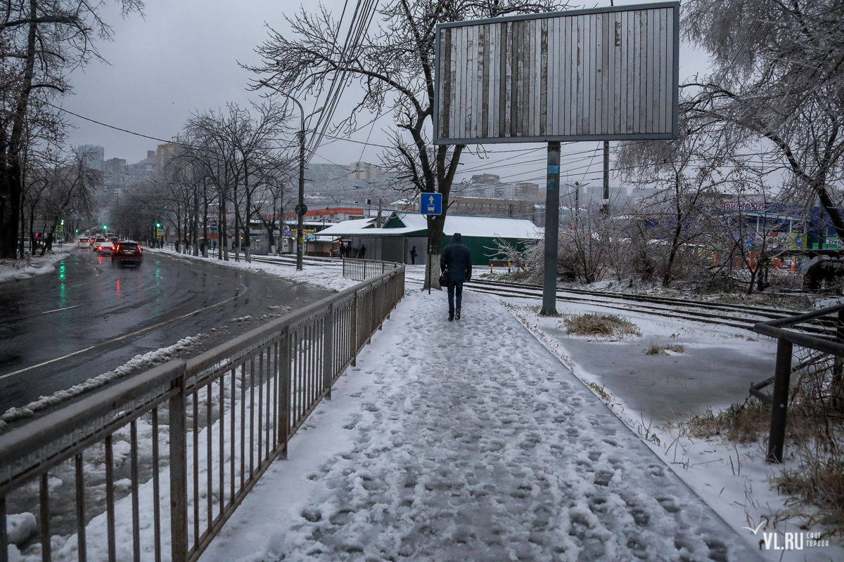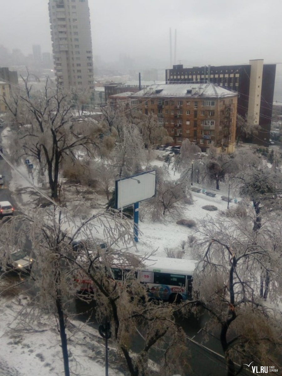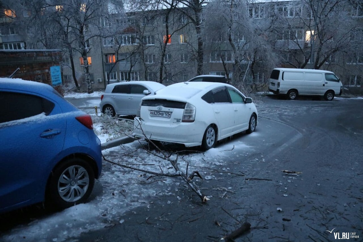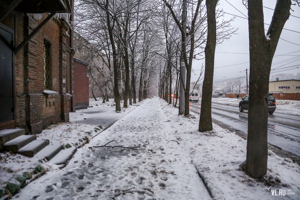 Утро четверга, 19 ноября, обернулось для жителей Владивостока неудобствами, характерными для первого снегопада. Из-за спада температур и дождя со снегом дороги и тротуары покрылись коркой льда, превращая путь на работу в испытание, некоторые деревья во дворах и возле главных транспортных артерий замёрзли и начали ломаться, а городские трамваи перестали курсировать.