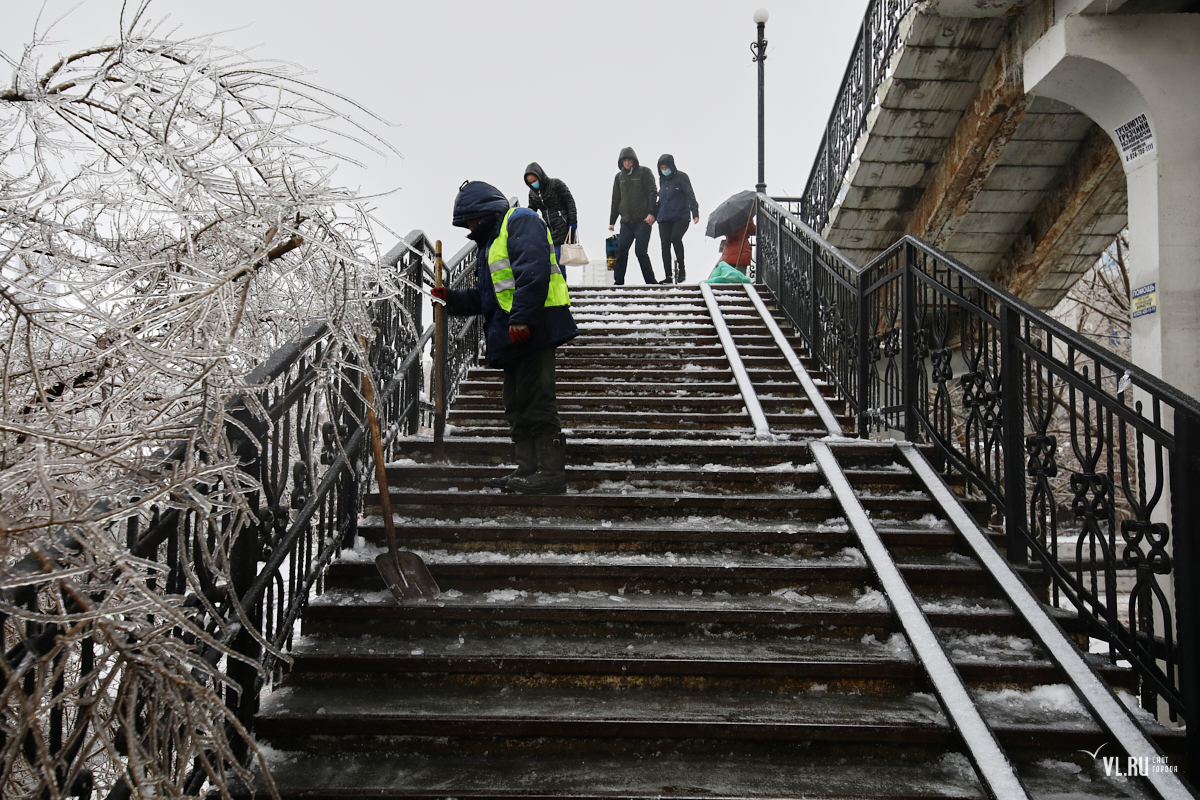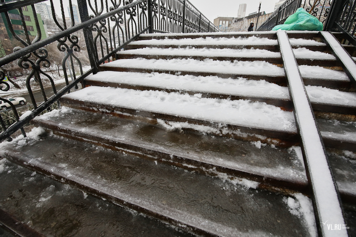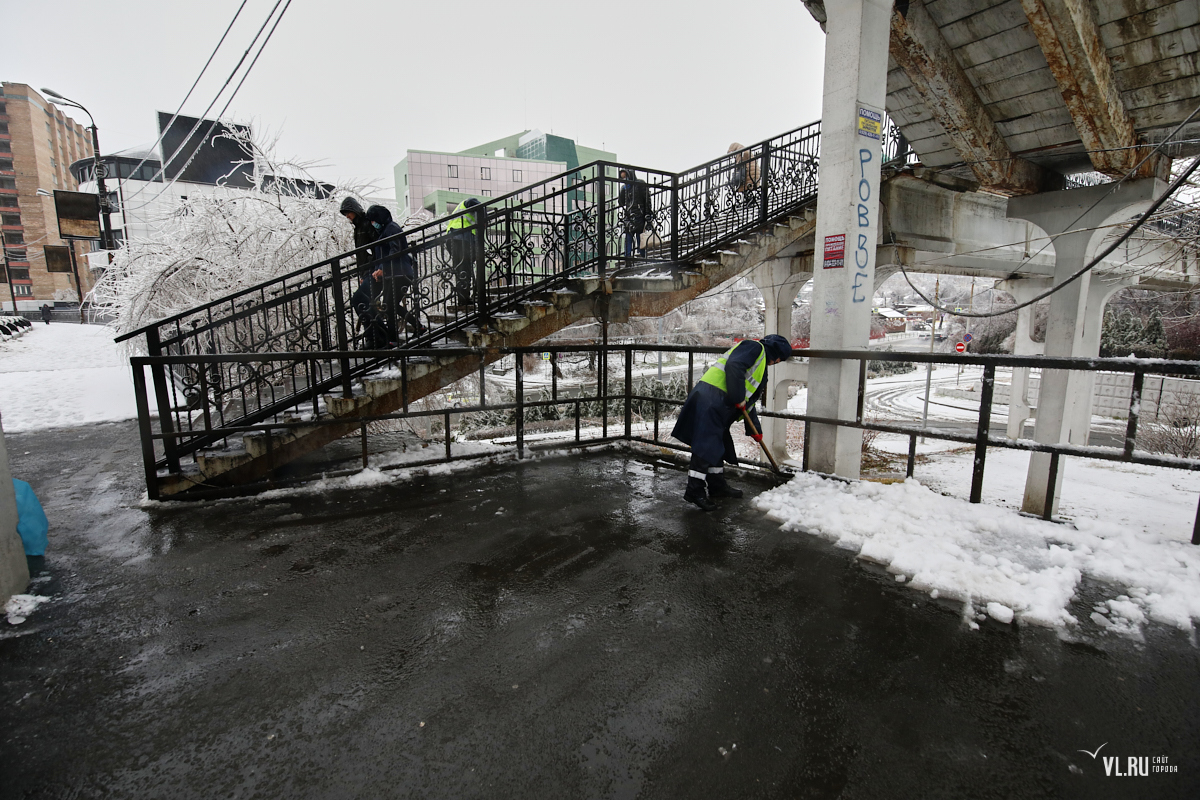 По информации мэрии, всю минувшую ночь на улицах Владивостока работала специализированная техника: велась просыпка сложных участков дорог и спусков, где из-за перепада температур и перехода дождя в снег образовывалась наледь. С 4 часов утра дорожные рабочие приступили к обработке переходов, в 6 часов утра более 130 человек вышли на пешеходные зоны и лестницы. Они вручную убирают снег и обрабатывают обледеневшие участки спецсредствами.