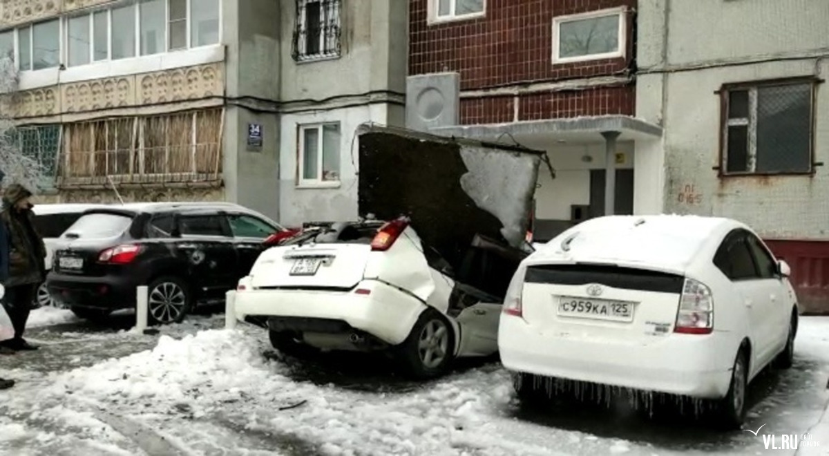 13:02: Может, козырёк, а может, плита дома № 34 по улице Нейбута упала на крышу припаркованного автомобиля. Водитель успел выйти из машины за минуту до случившегося.