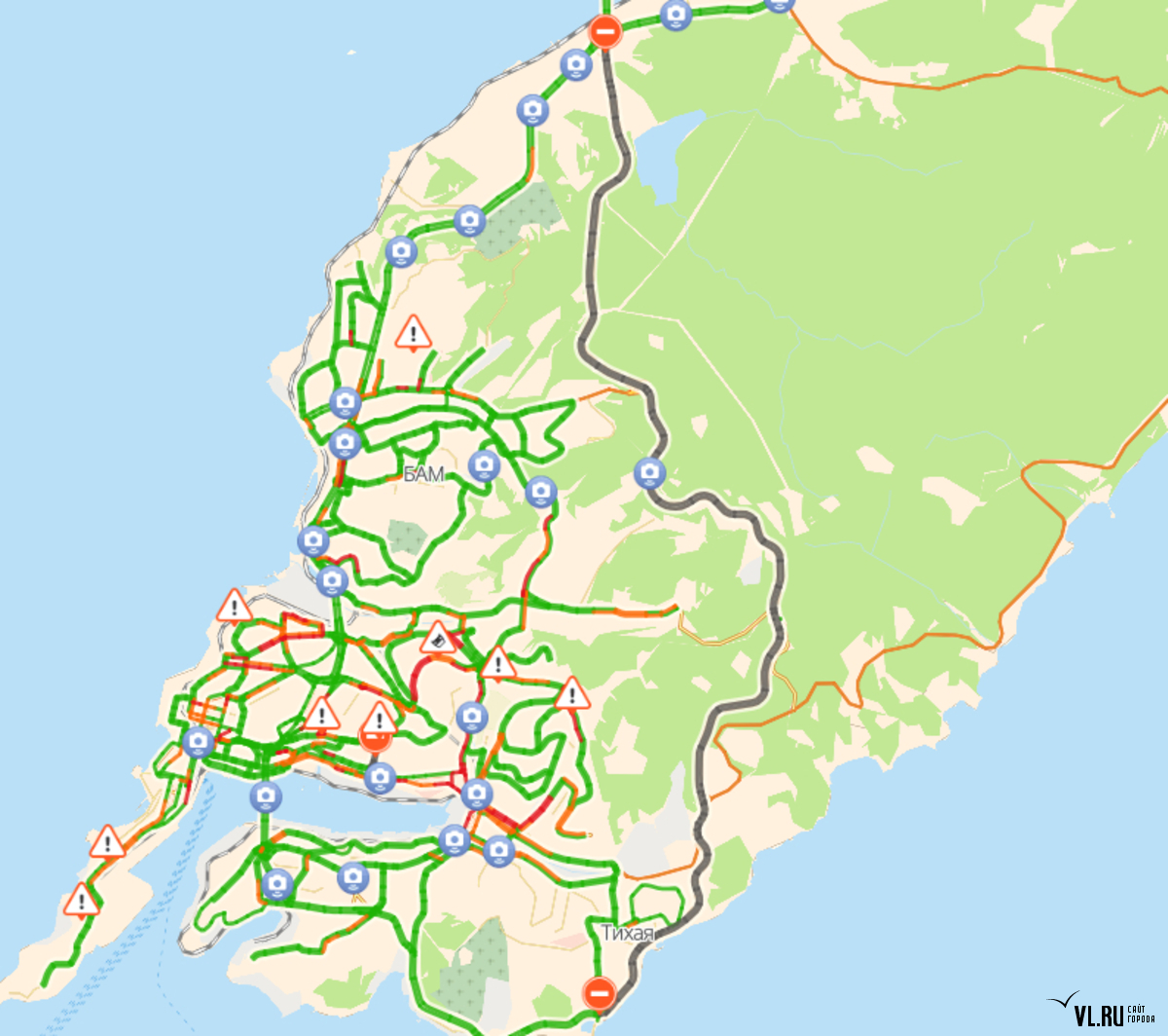 По данным сервиса «Карты ВЛ» на 08:30, на автодорогах есть небольшие заторы. Замедлено движение со стороны Второй Речки до Моргородка, от Окатовой до Золотого моста в сторону центра и c Луговой до остановки «Гайдамак».