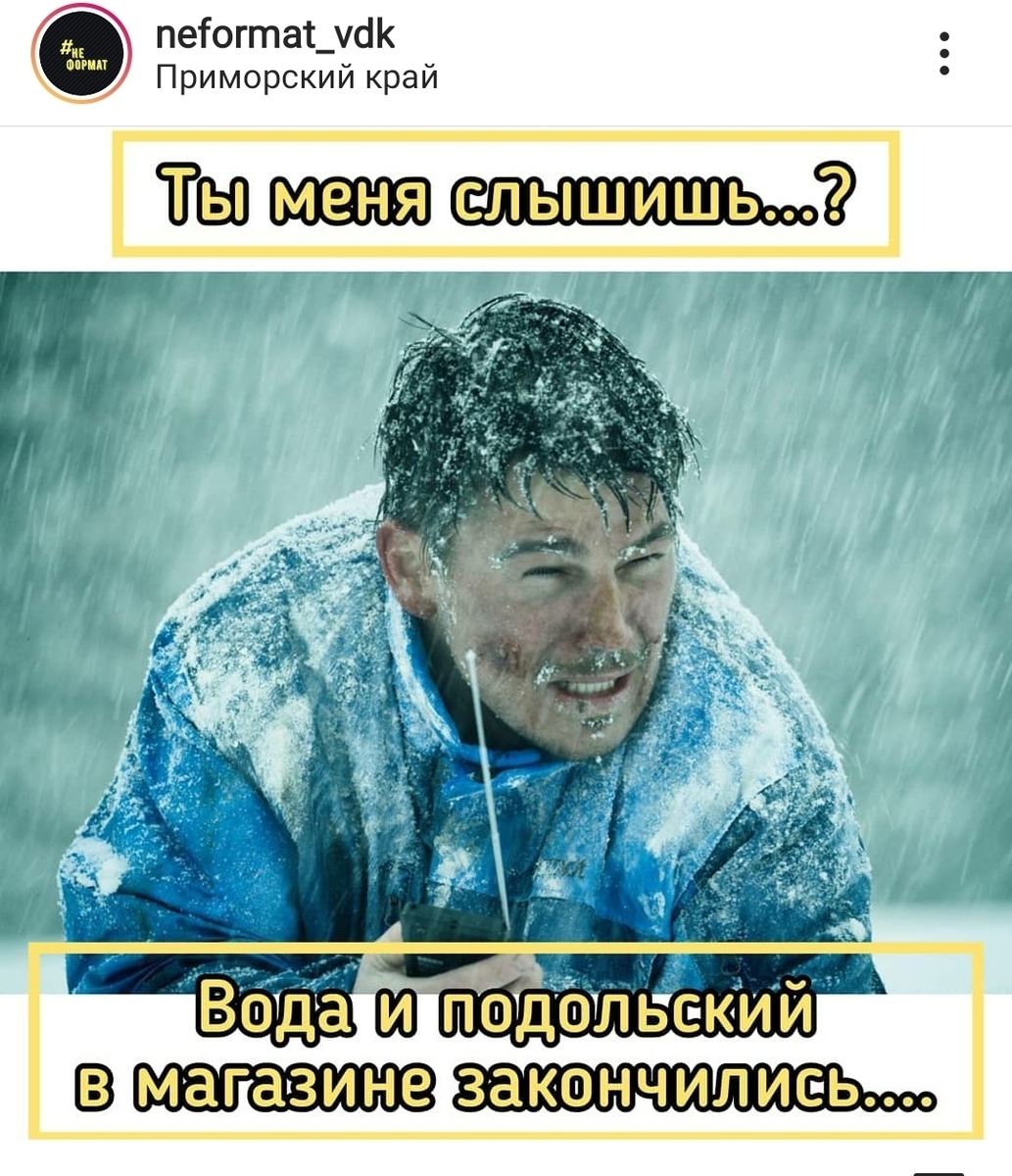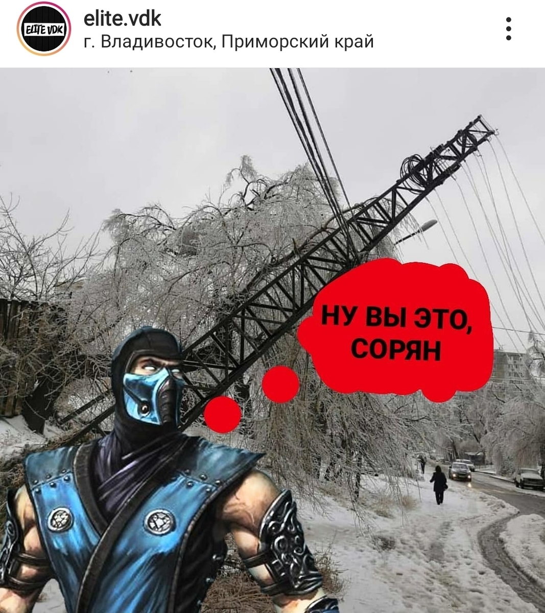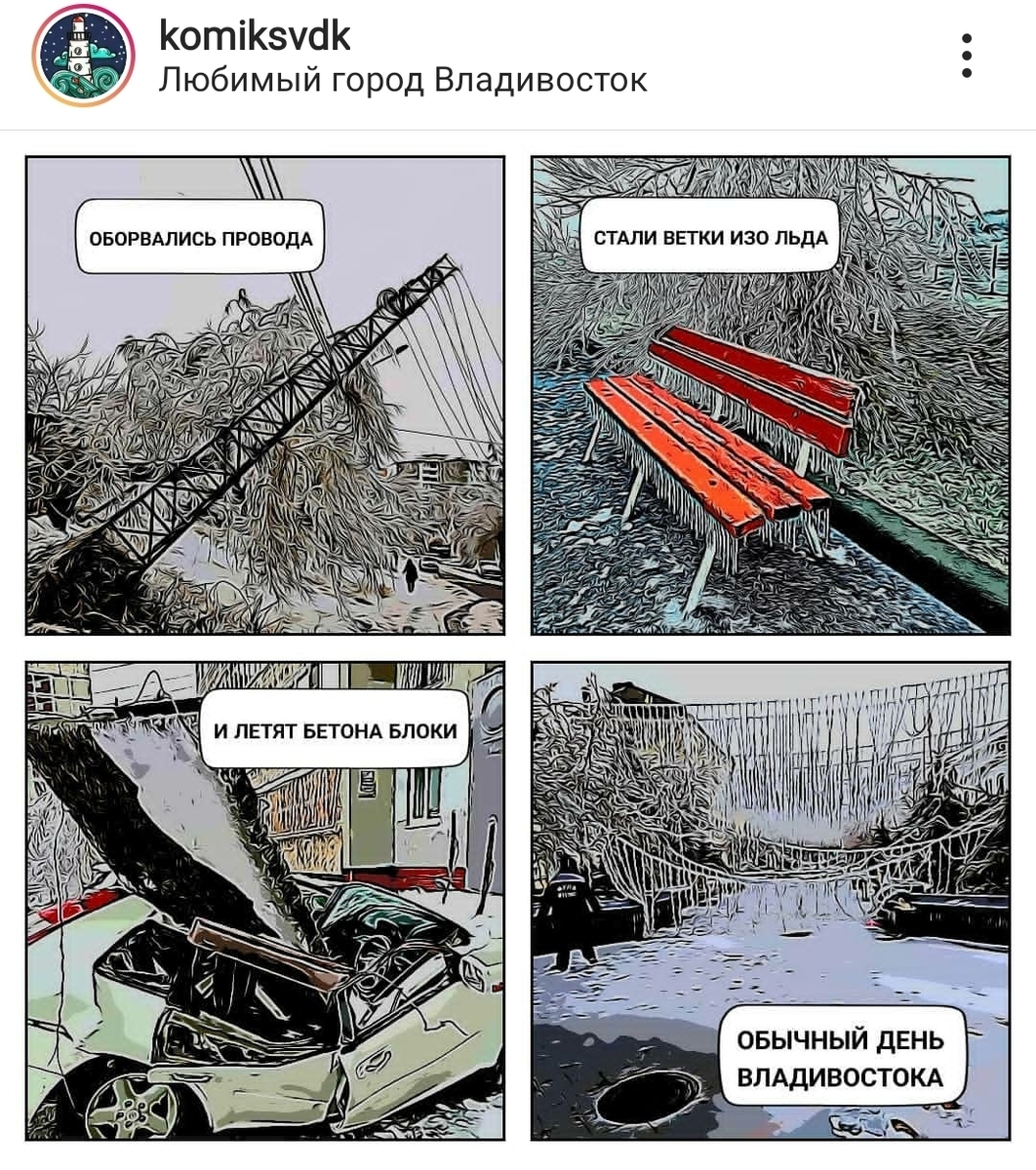 В ночь с 18 на 19 ноября во Владивостоке начался дождь, который к 20 ноября перешёл в снег. Ветви деревьев, машины, провода покрылись толстым слоем льда. Тысячи жителей города остались без света, воды, отопления или электричества. Многие – без всего сразу. Однако те, у кого осталось электричество и интернет, не унывают и делают мемы.