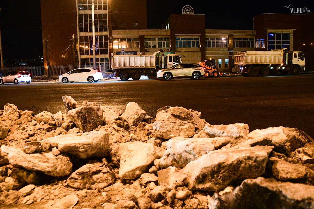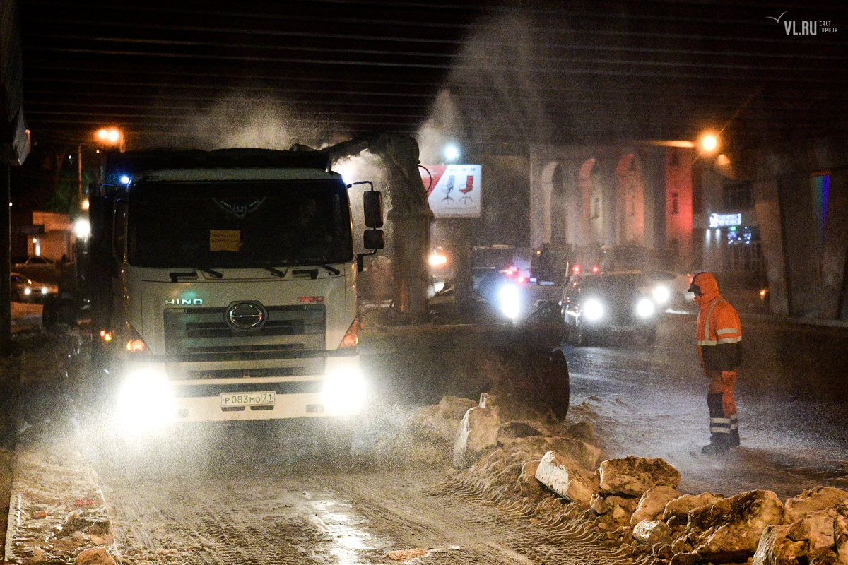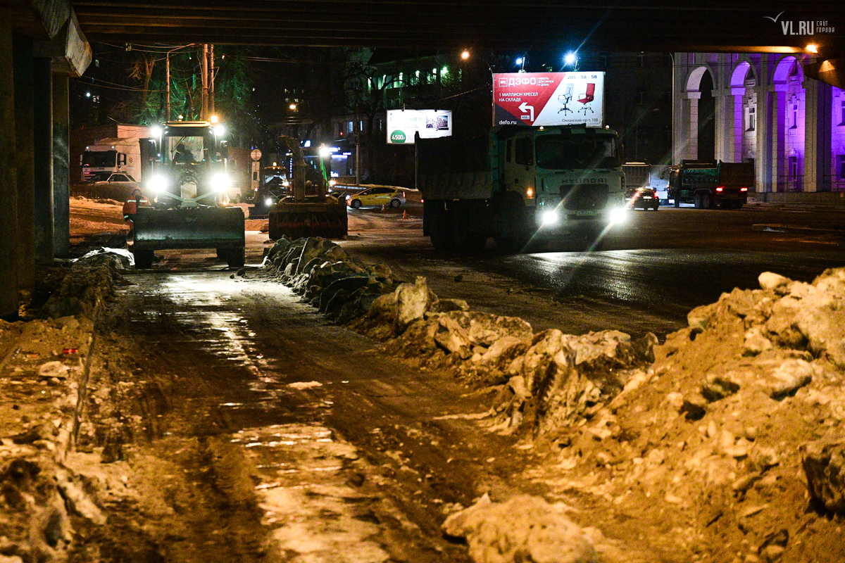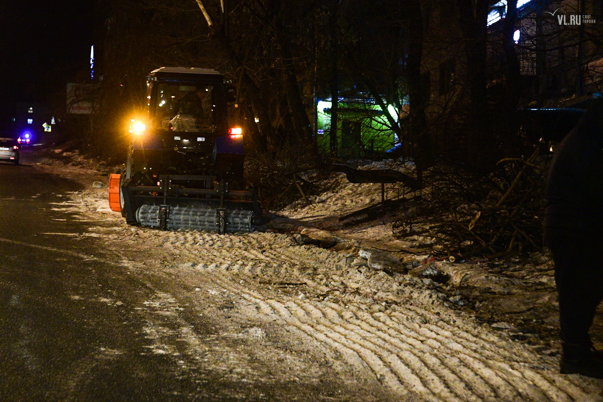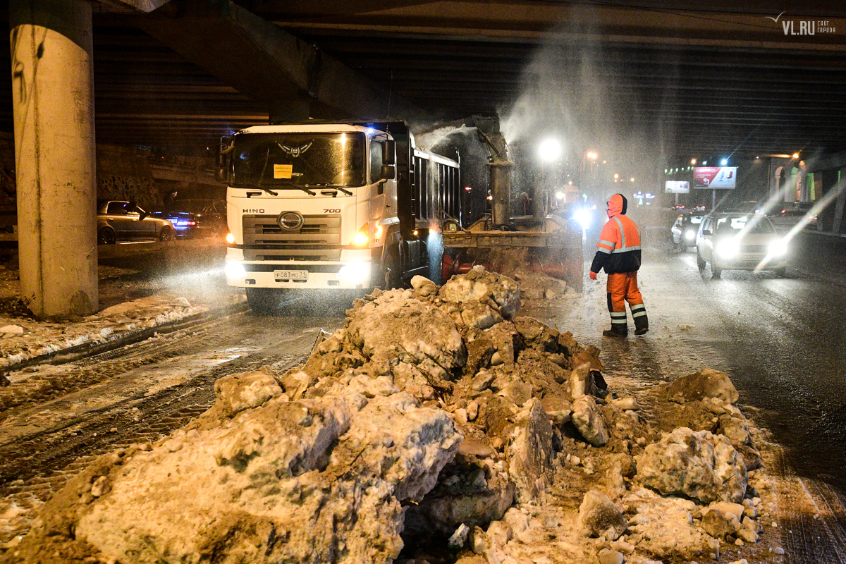 Продолжается очистка дорог Владивостока после ледяного дождя. Несколько ночей подряд городские службы пытаются вывезти снег и лёд с обочин, но по-прежнему им мешают стоящие у тротуаров машины. В центре города сегодня работать было проще – там почти никто не парковался.