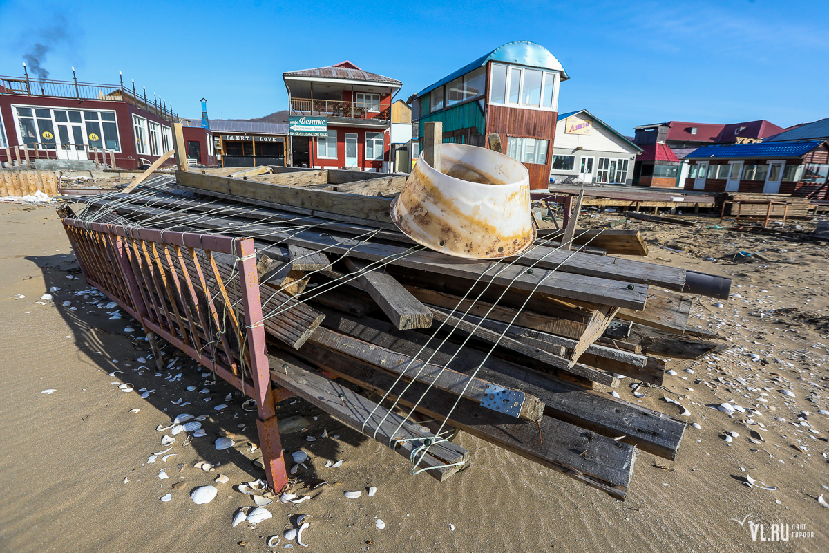 Второй пляж, где вдоль моря расположено много кафе, находится в ужасном состоянии. Все беседки и деревянные настилы, на которых летом стояли столы, исчезли. Их остатки демонтируют рабочие. В некоторых местах видны только сваи в песке и части деревянных конструкций. Отдельные сооружения ещё не полностью разобраны.