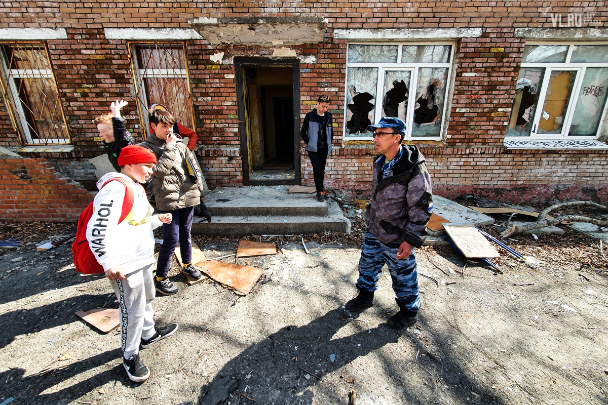 Жители окрестных домов прислали VL.ru видео, как беззаботный охранник сидит посреди разрухи и думает о чём-то своём или вечном, пока по одному из деревьев на крышу детского сада забирается группа подростков. Этого же охранника встретил на объекте сегодня корреспондент VL.ru – в своей комнатке он выпивал с неизвестной женщиной.