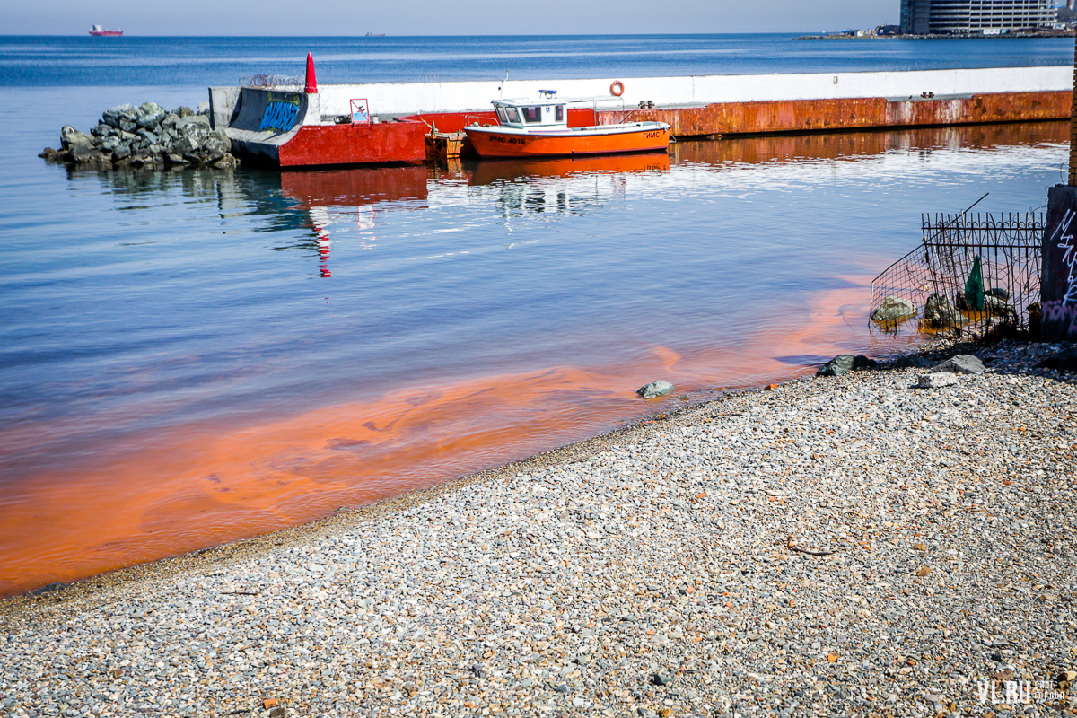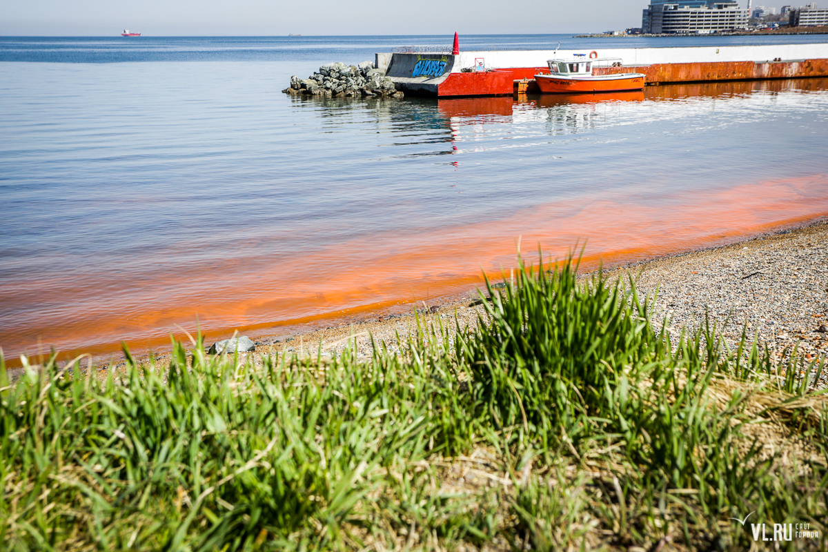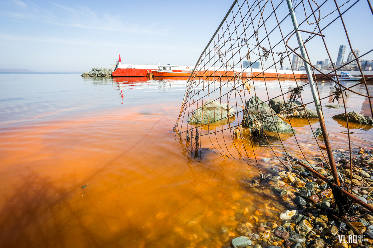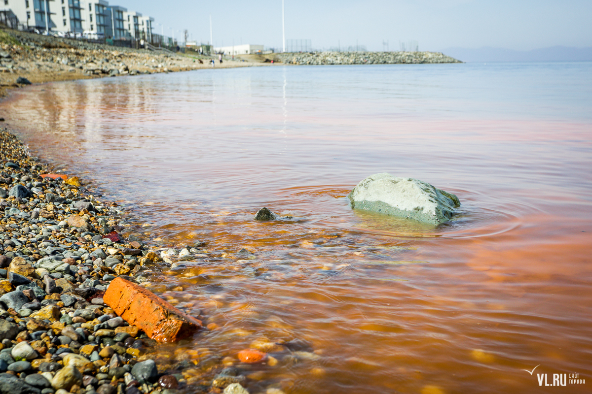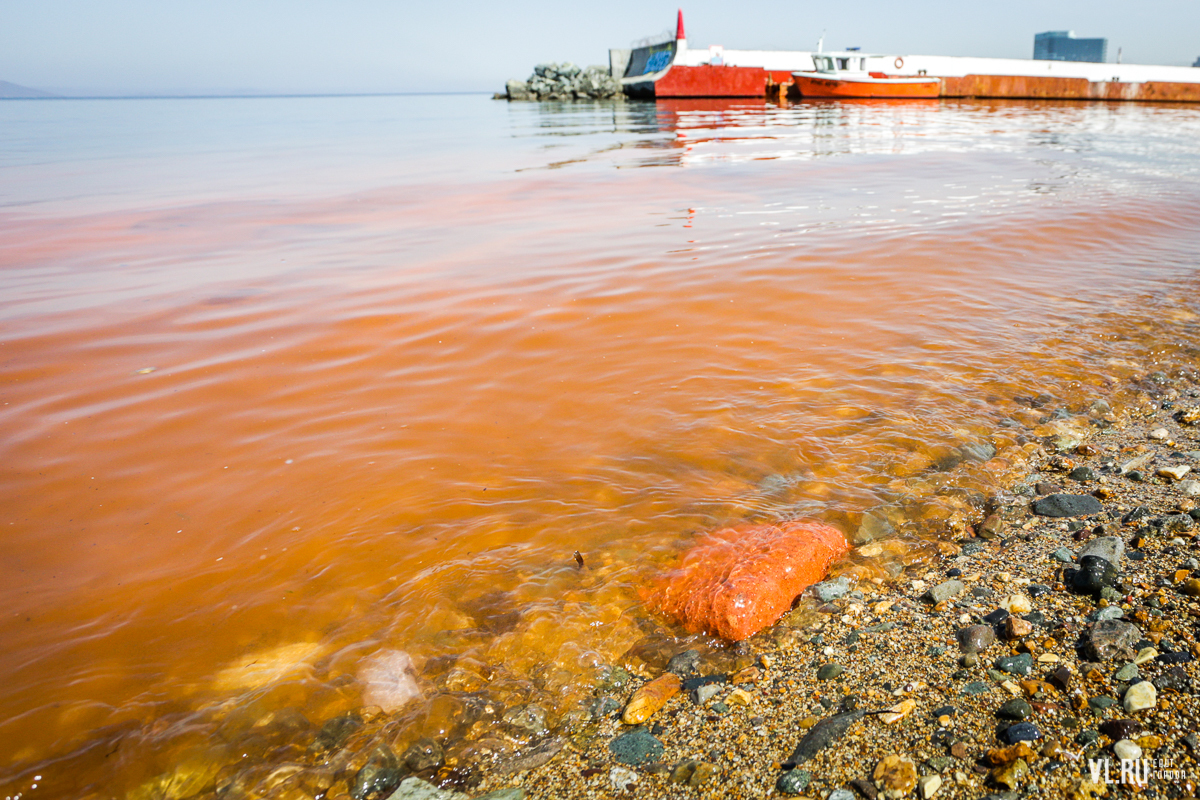 Как убедился фотограф VL.ru, оранжевые разводы видны до сих пор. Их можно наблюдать вдоль побережья всего пляжа МГУ им. адмирала Г. И. Невельского. Самая большая концентрация заметна у базы ГИМС.
