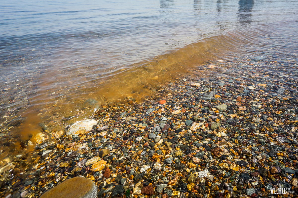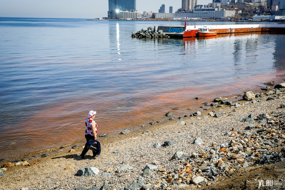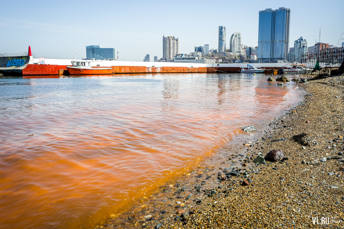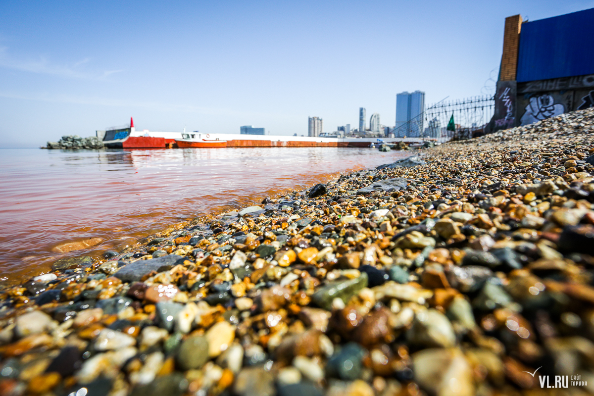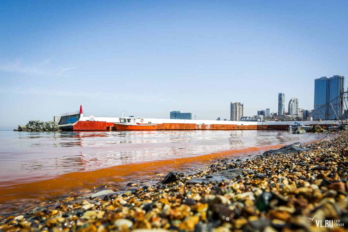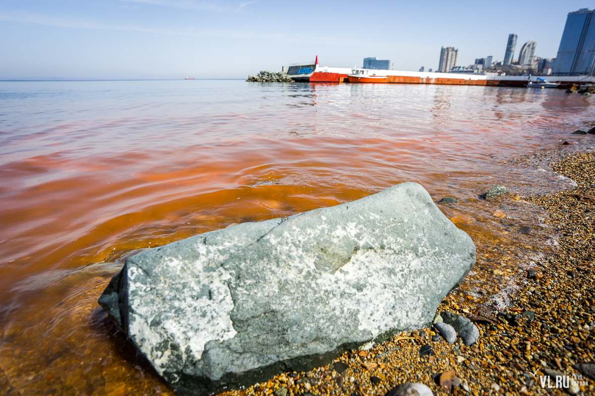Как убедился фотограф VL.ru, оранжевые разводы видны до сих пор. Их можно наблюдать вдоль побережья всего пляжа МГУ им. адмирала Г. И. Невельского. Самая большая концентрация заметна у базы ГИМС.