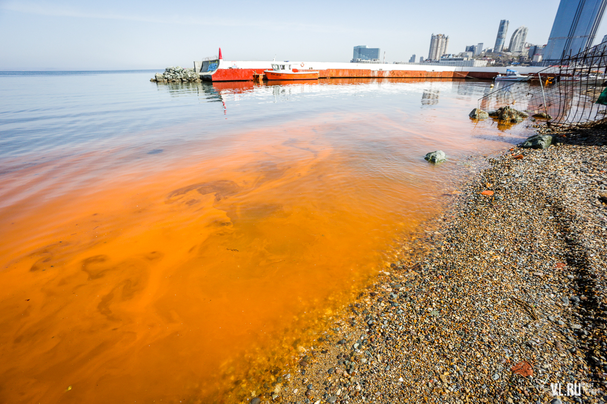 О появлении оранжевой полосы в прибрежной акватории утром редакции VL.ru сообщили местные жители. Обывателей насторожил бросающийся в глаза яркий цвет пятна на поверхности моря, которое не рассеивалось волнами и не имело какого-либо запаха.