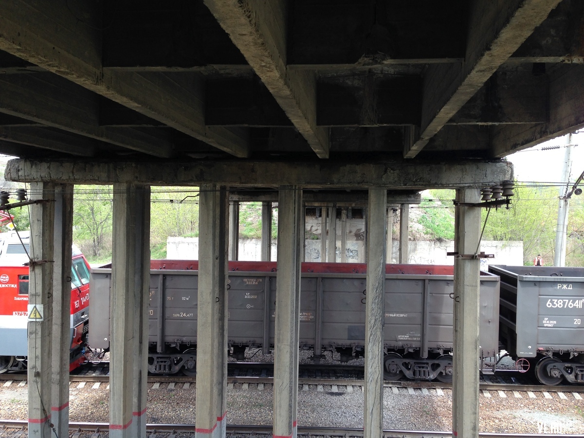Также обнажается арматура на опорах № 3 и 4. Ситуацию осложняет то, что путепровод находится над ж/д путями и контактной сетью электропоездов.