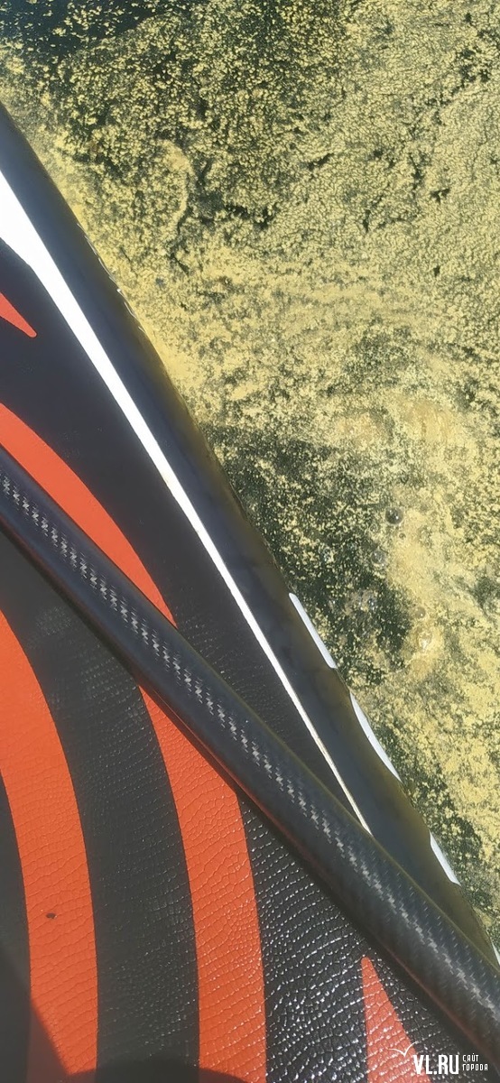«Сегодня наблюдал на поверхности пролива Босфор Восточный жёлтые частицы. Прошёл от полуострова Басаргина до острова Скрыплева и далее до мыса Ахлёстышева. На протяжении всего пути вода в той или иной степени загрязнена», – рассказал VL.ru Евгений, который выходил в море на сапе.