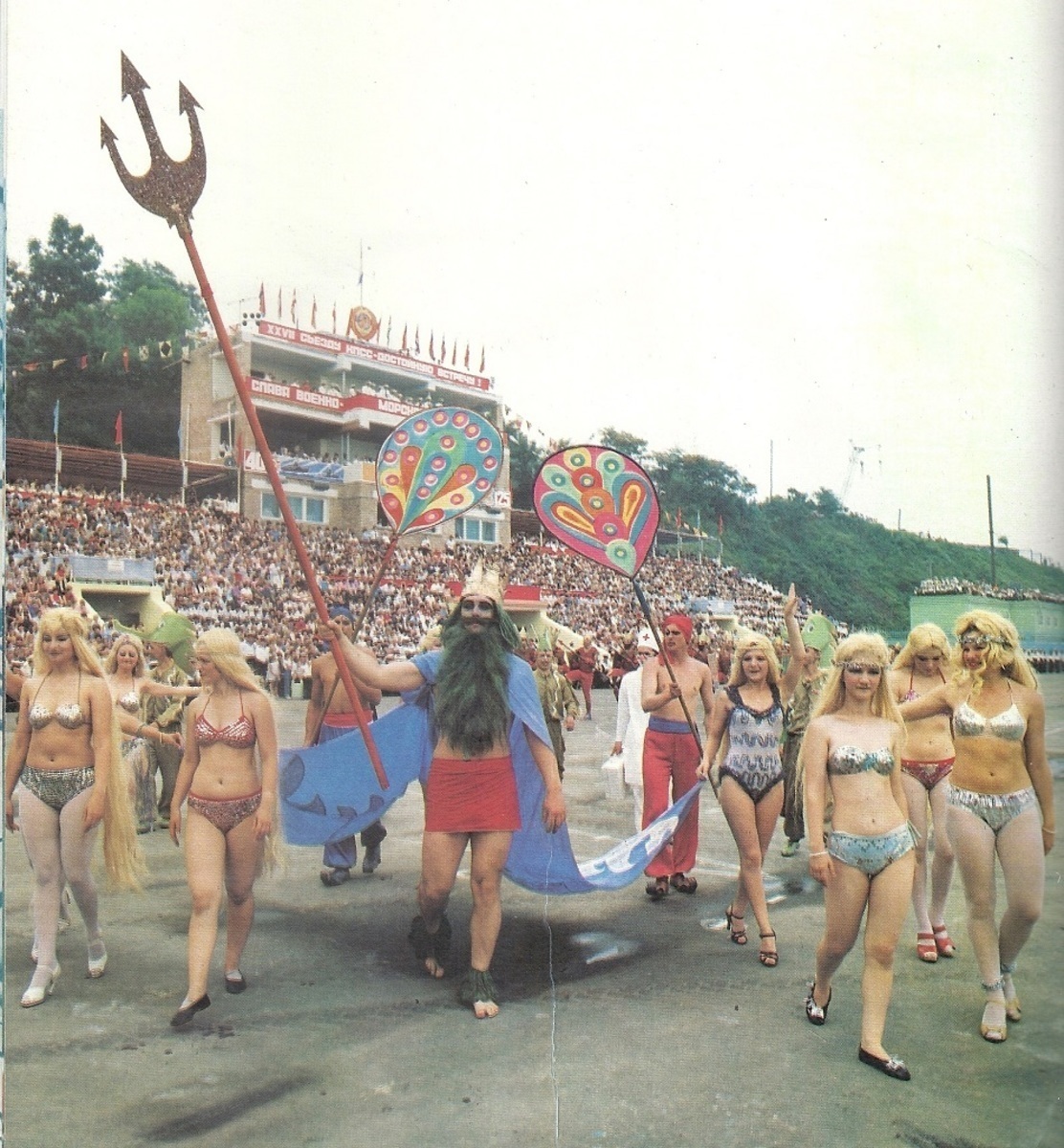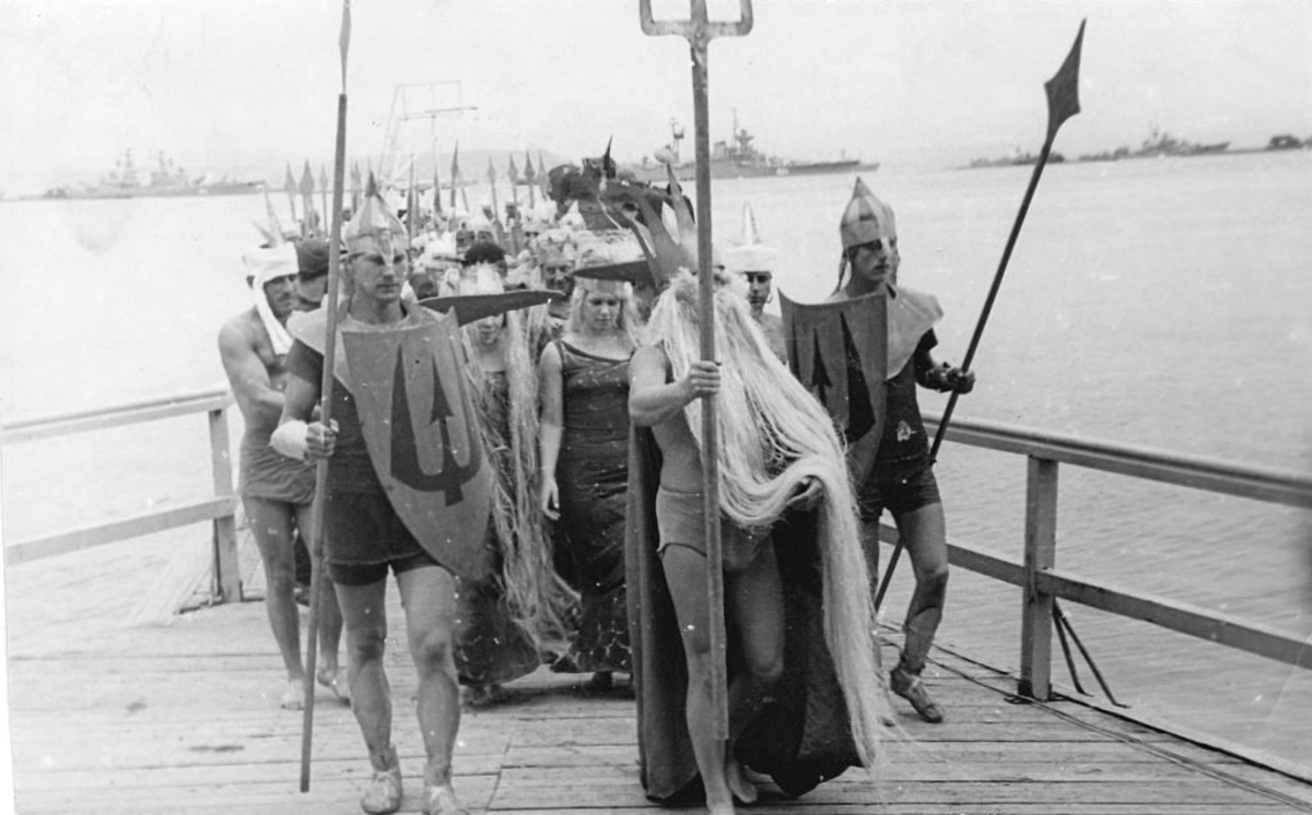 В 1969 году на праздник военных моряков владыка морей был уже представлен под новым именем – Нептун. Тогда его доставляли к сцене с подводной лодки. Свита состояла не только из стражей с копьями, но и красавиц-русалок. Верные слуги ждали Нептуна на пирсе водной станции ТОФ. В последующие годы русалок и копьеносцев дополнили бегающие перед трибунами весёлые черти, образы которых использовались на различных представлениях ещё в царской России. С введением новых героев было принято решение разыгрывать целые спектакли, а потому ежегодно в День ВМФ программа выступлений стала обновляться.