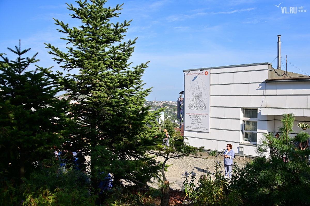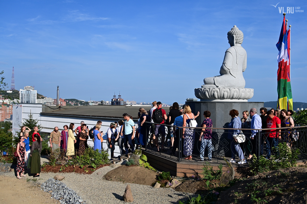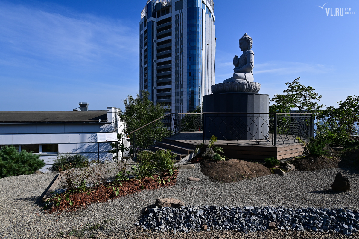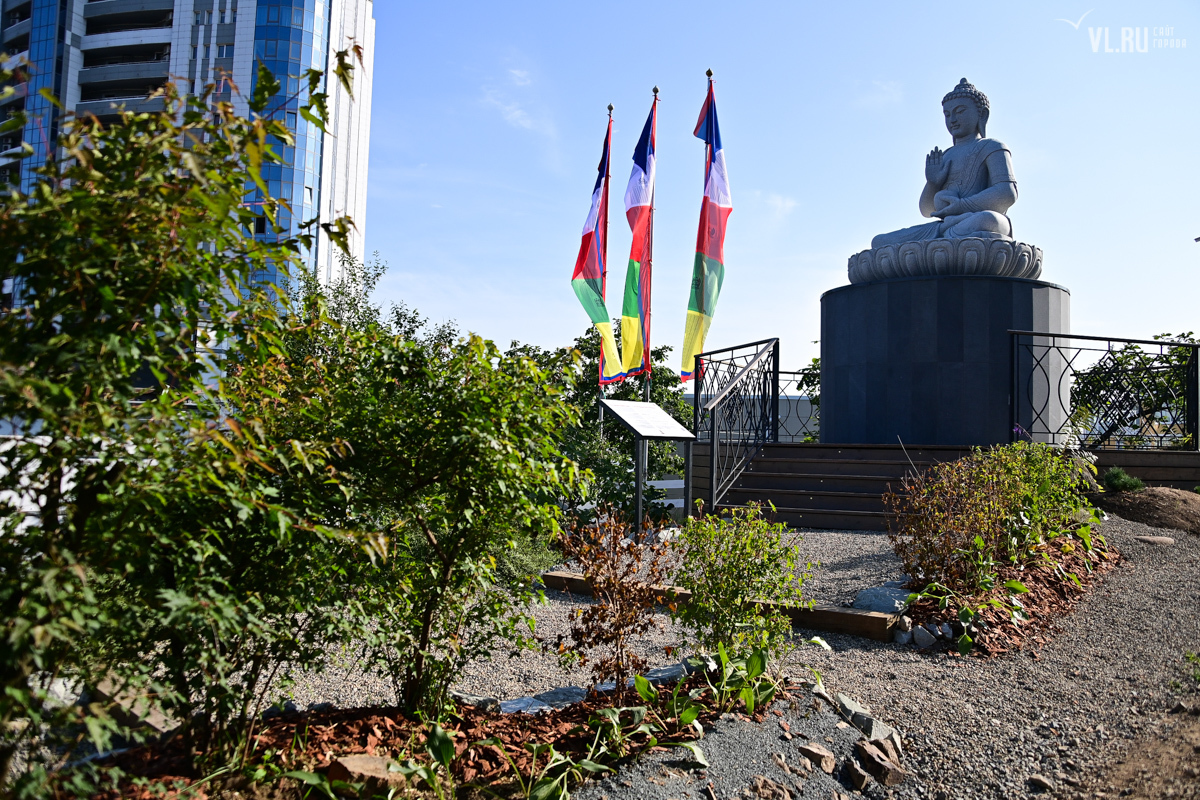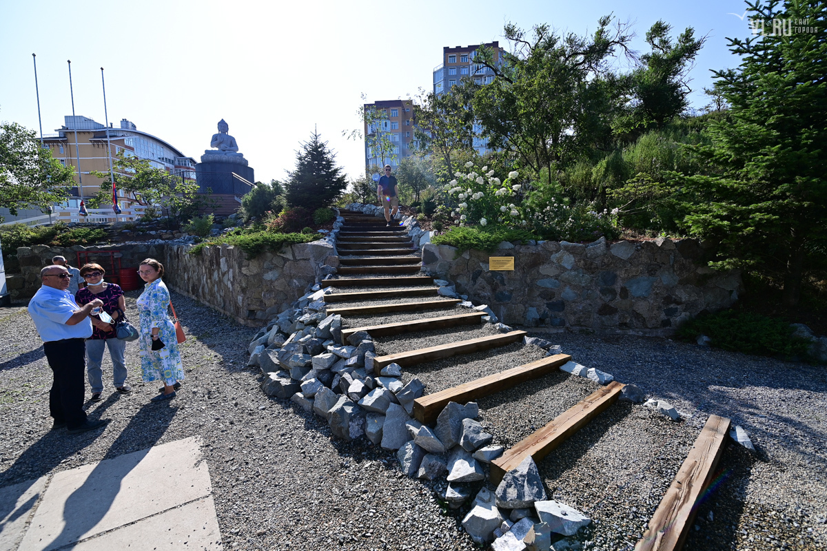 В среду, 18 августа, около здания крупнейшего буддийского центра Владивостока на Орлиной сопке (Державина, 3) торжественно открылся новый сквер. К установленной в феврале прошлого года статуе Будды Амогхасиддхи теперь можно подняться по новой деревянной лестнице, а склон зазеленел – здесь высадили более двух десятков видов растений. Помимо этого, к зданию буддийского центра теперь можно легко и удобно подняться от Аксаковской по новой каменной лестнице. Все работы прихожане центра Алмазного пути традиции Карма Кагью выполнили своими силами и за свой счёт.