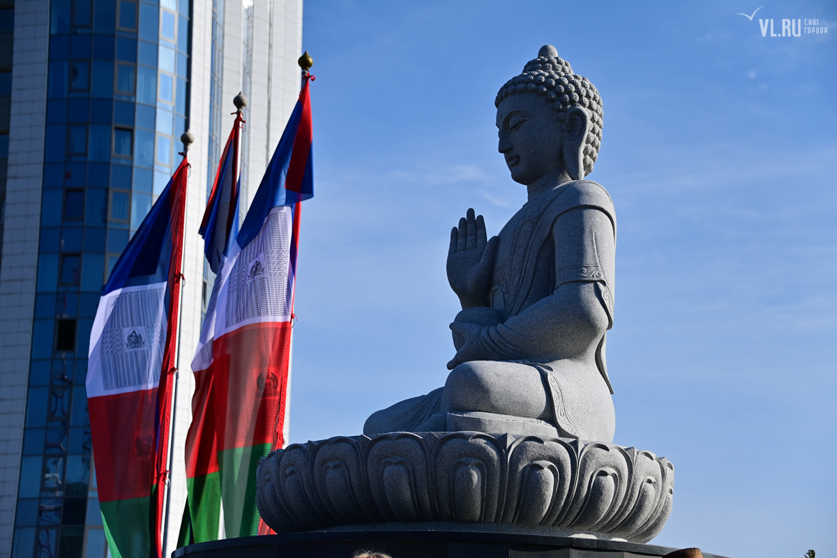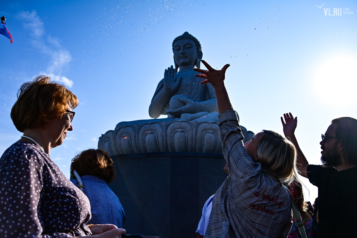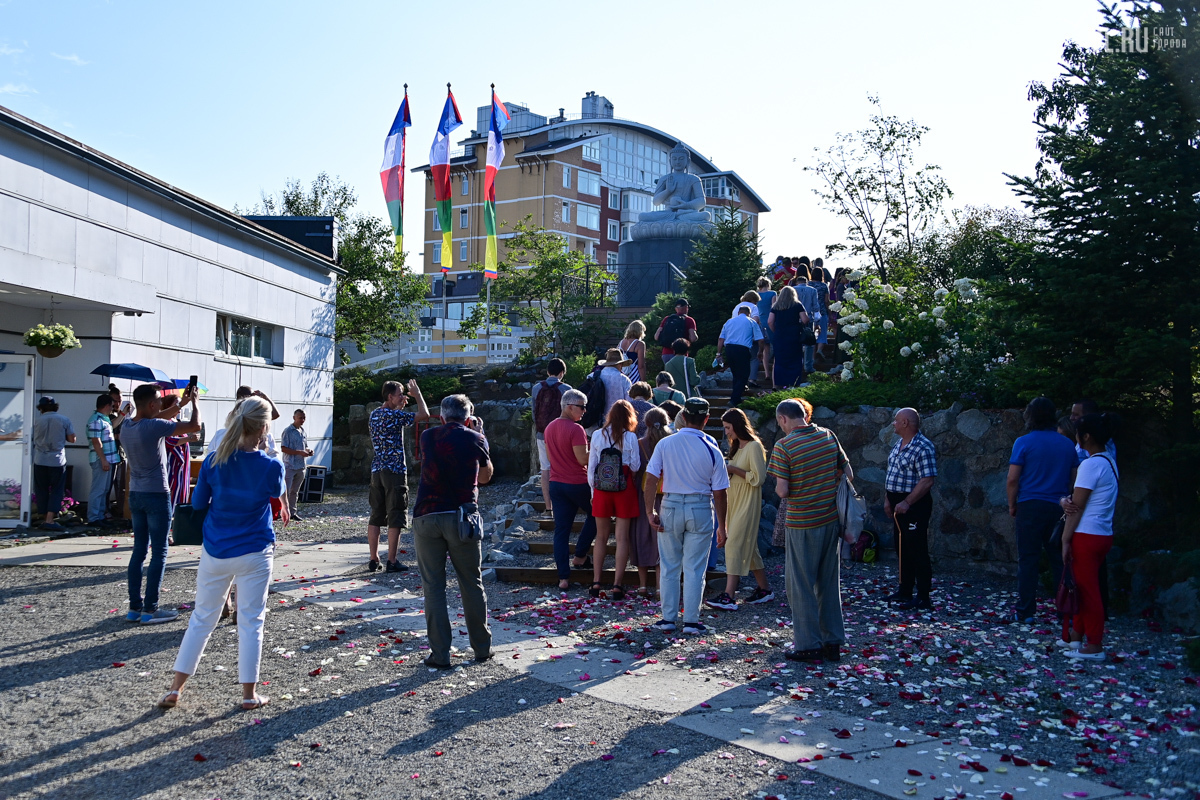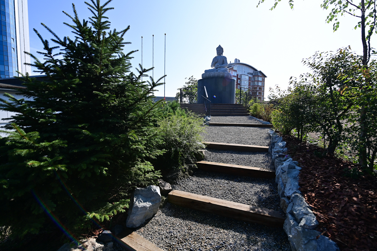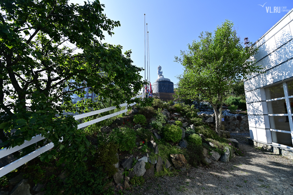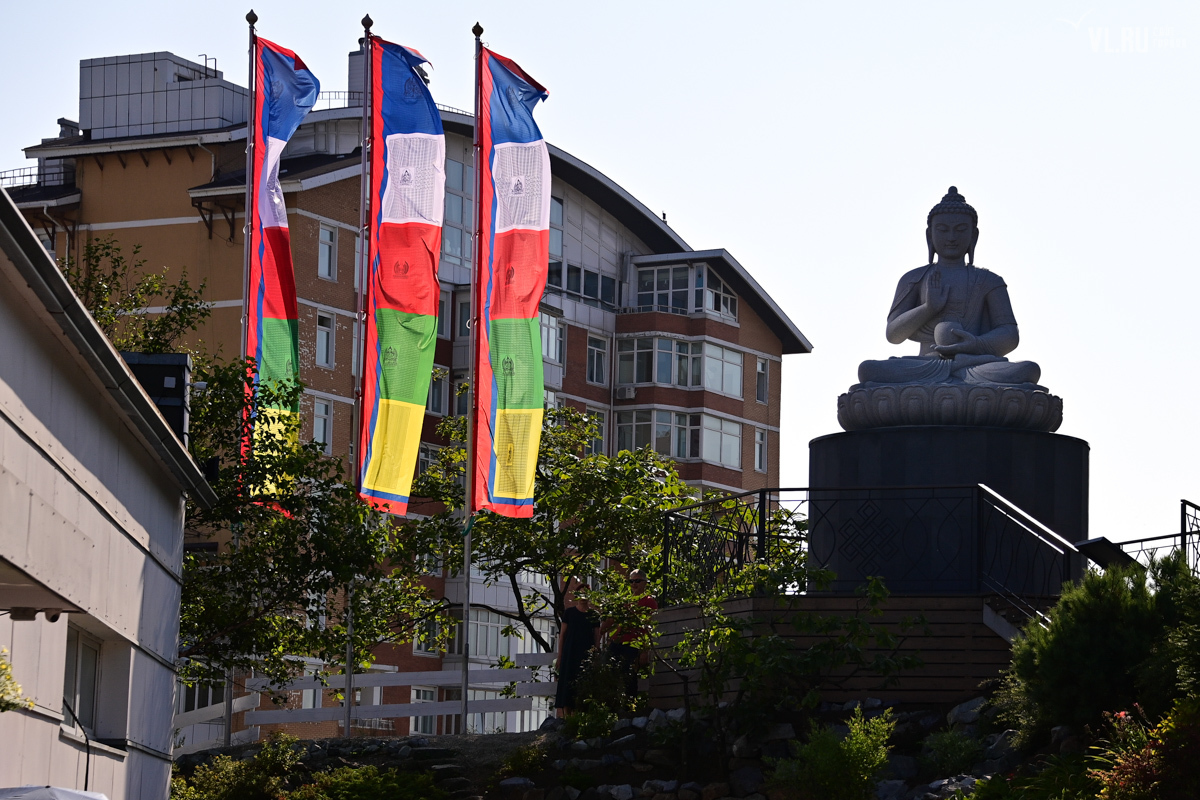 В среду, 18 августа, около здания крупнейшего буддийского центра Владивостока на Орлиной сопке (Державина, 3) торжественно открылся новый сквер. К установленной в феврале прошлого года статуе Будды Амогхасиддхи теперь можно подняться по новой деревянной лестнице, а склон зазеленел – здесь высадили более двух десятков видов растений. Помимо этого, к зданию буддийского центра теперь можно легко и удобно подняться от Аксаковской по новой каменной лестнице. Все работы прихожане центра Алмазного пути традиции Карма Кагью выполнили своими силами и за свой счёт.