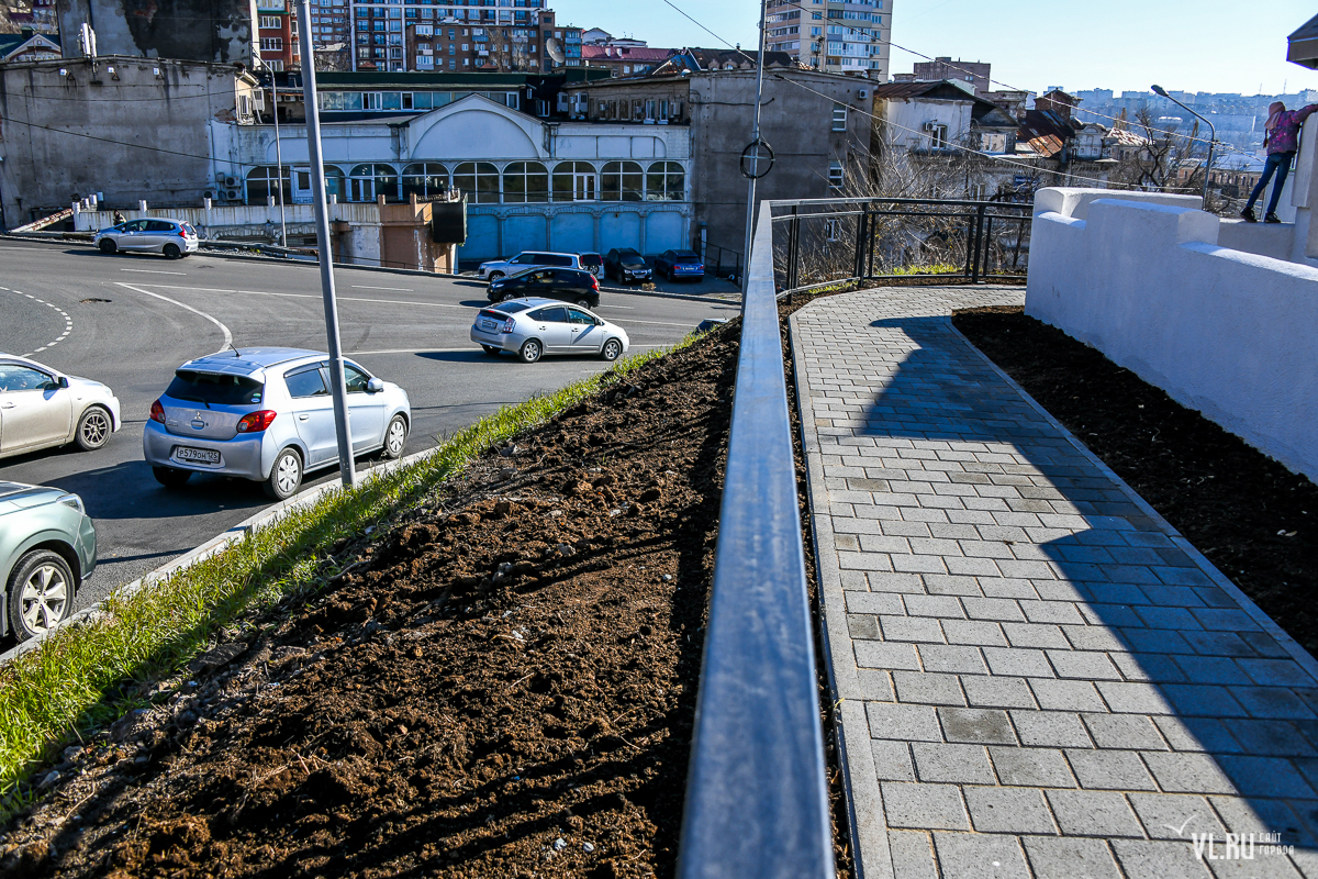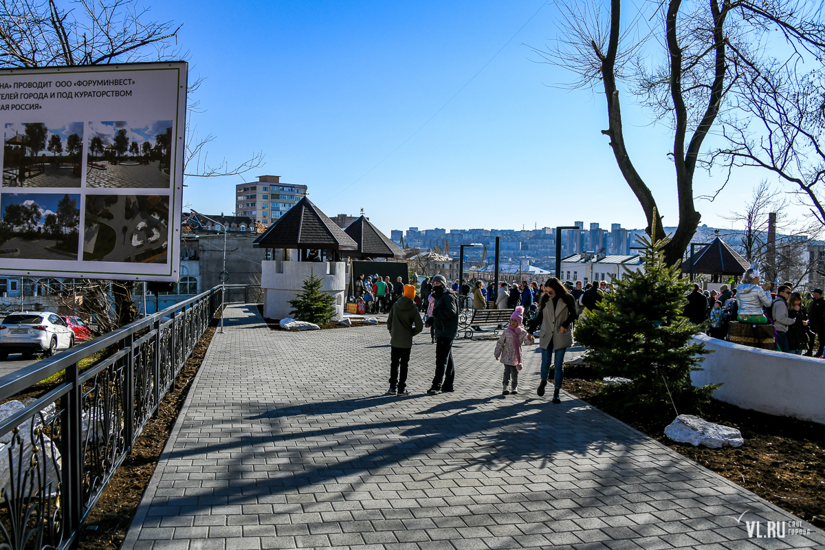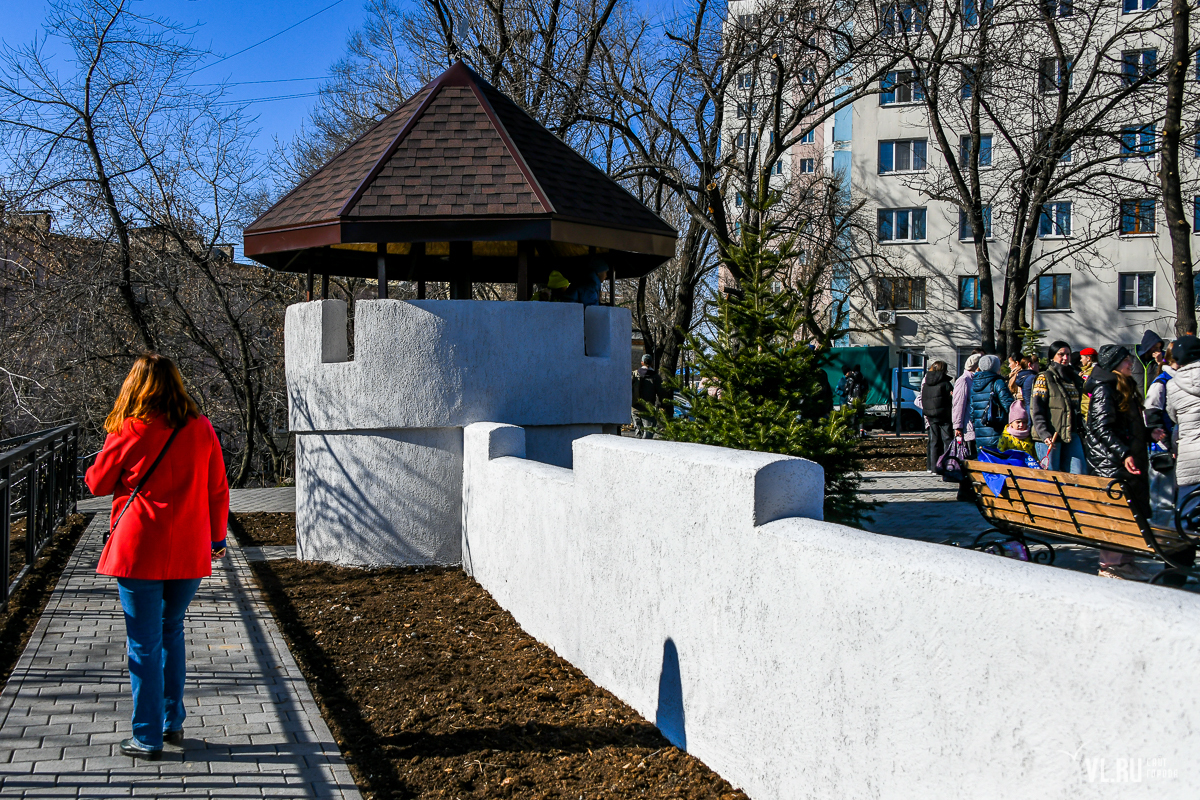 После перерезания красной ленточки корреспондент VL.ru ещё раз прогулялся по скверу. В первую очередь в глаза бросилось то, что кованые декоративные элементы на половине секций забора за башнями отсутствуют. При этом на основных секциях свежеокрашенного забора в отдельных местах уже проступает ржавчина. Также сомнительным выглядит выбор материала покрытия вокруг башен – здесь, в месте, где играют дети, лежит обычный грунт, который смоет с первым же дождём. Поскольку сквер находится на возвышенности, есть опасения, что часть земли за ограждениями тоже сползёт, она не укреплена ни подпорной стеной, ни геосеткой. Если не брать в расчёт эти недостатки, сквер выглядит красиво и современно.
