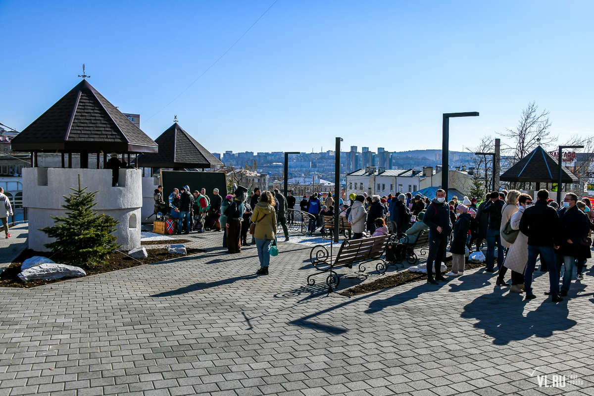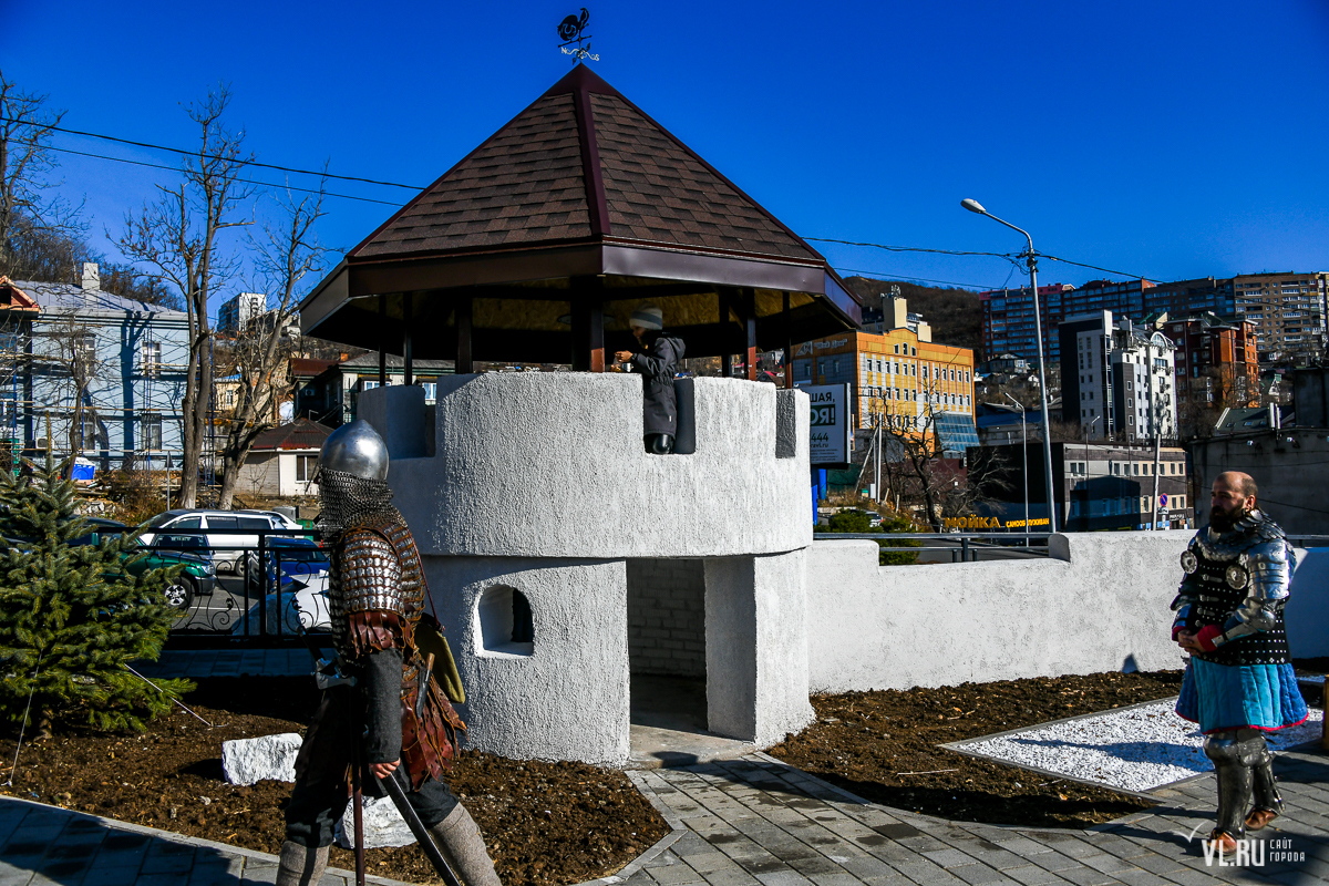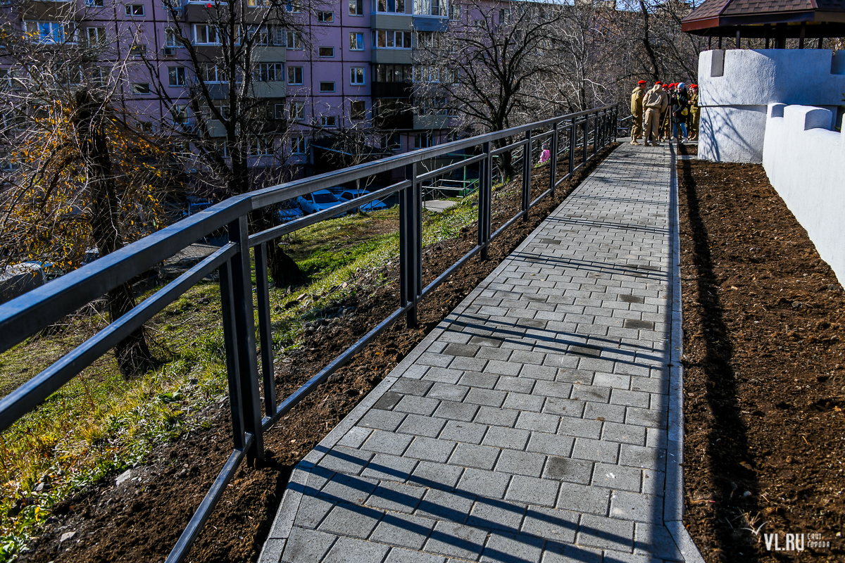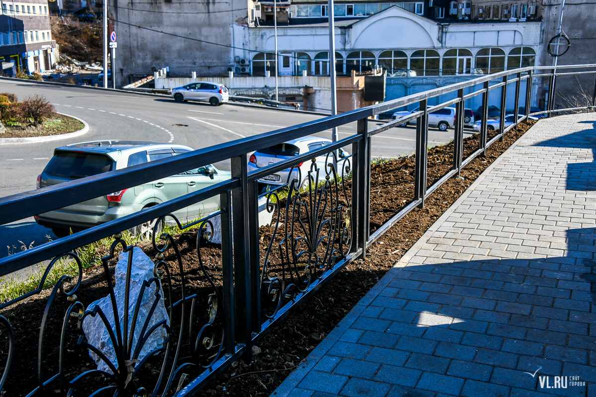 После перерезания красной ленточки корреспондент VL.ru ещё раз прогулялся по скверу. В первую очередь в глаза бросилось то, что кованые декоративные элементы на половине секций забора за башнями отсутствуют. При этом на основных секциях свежеокрашенного забора в отдельных местах уже проступает ржавчина. Также сомнительным выглядит выбор материала покрытия вокруг башен – здесь, в месте, где играют дети, лежит обычный грунт, который смоет с первым же дождём. Поскольку сквер находится на возвышенности, есть опасения, что часть земли за ограждениями тоже сползёт, она не укреплена ни подпорной стеной, ни геосеткой. Если не брать в расчёт эти недостатки, сквер выглядит красиво и современно.