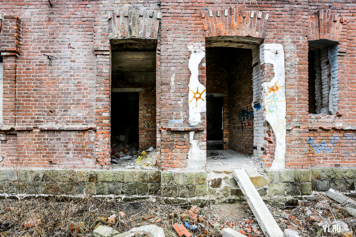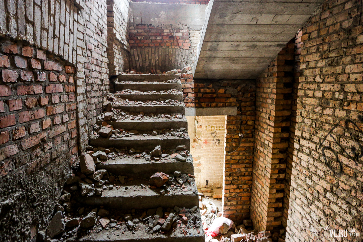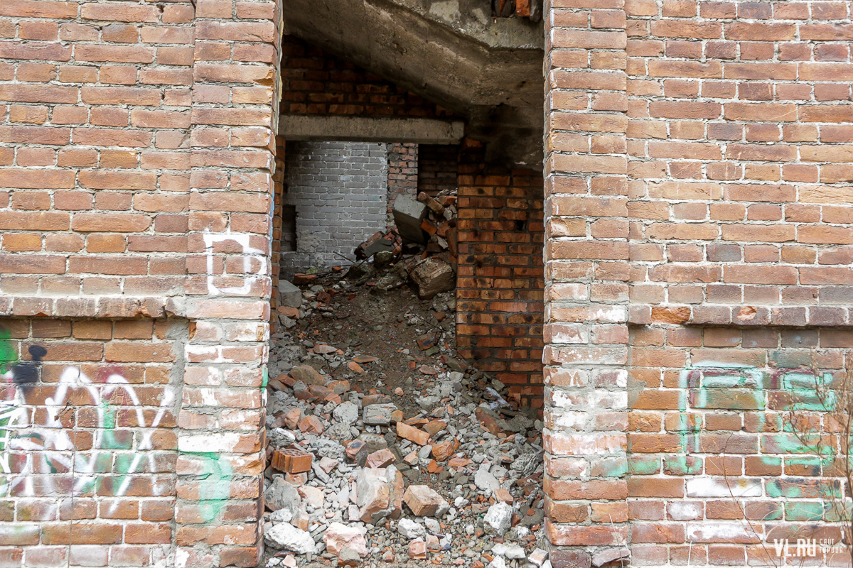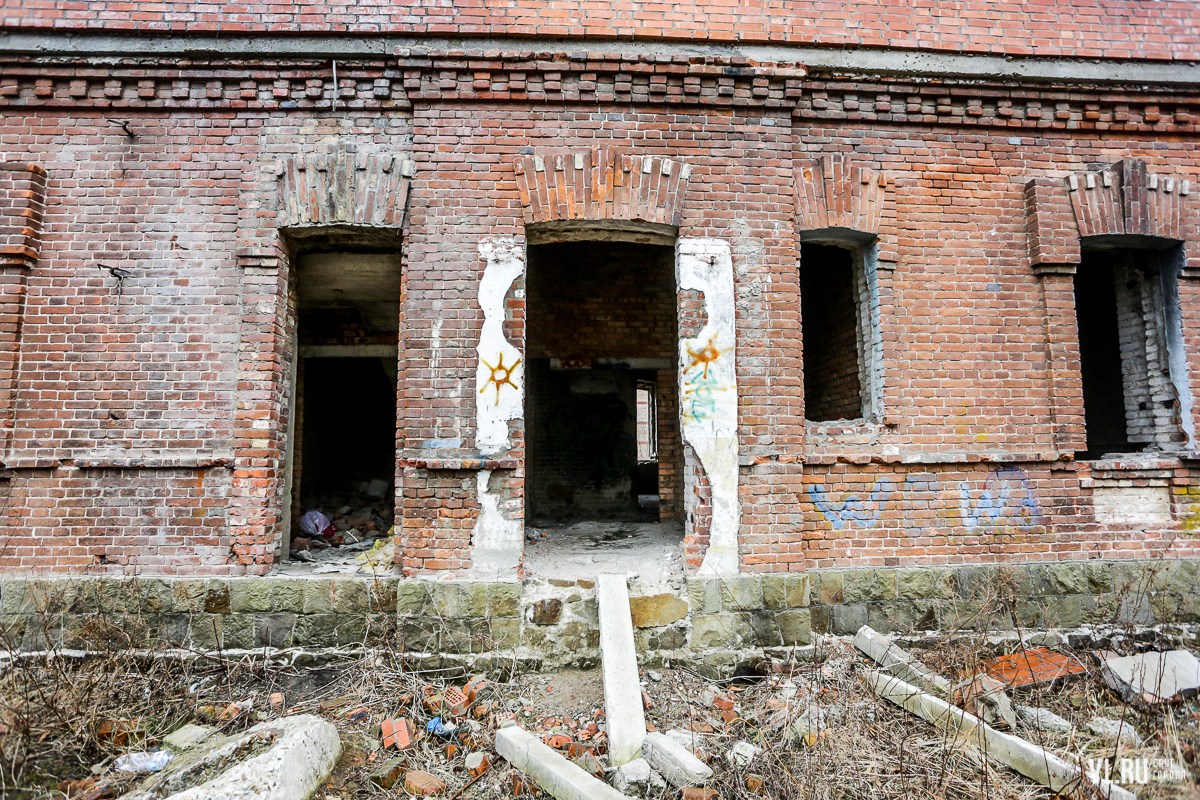 Но несколько лет назад верхние этажи словно ветром сдуло, сейчас рассыпается уже и второй этаж. Помещения внутри здания засыпаны кирпичом и мусором – не только строительным, но и бытовым. Видимо, горожане устроили здесь свалку.