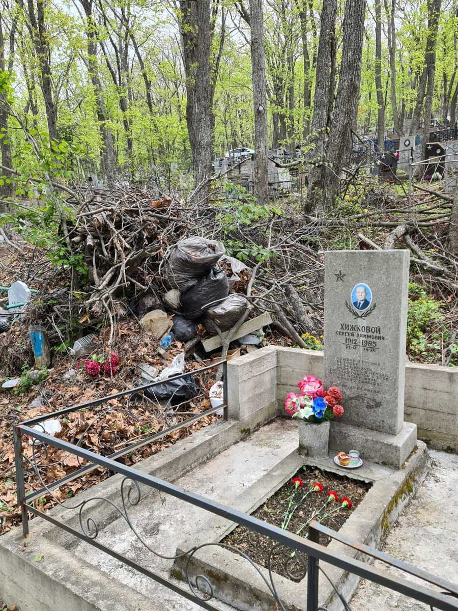 «Это могилка ветерана Великой Отечественной войны Хижкового Сергея Акимовича, прошедшего путь до Берлина, танк которого был подбит за квартал от Рейхстага. Этот памятник находится на территории городского кладбища 14-го километра. Подъезд затруднён, так как большой участок дороги имеет грунтовое покрытие, в ямах, завален мусором и ветками. Его сын, пенсионер-инвалид с больными ногами, не может навестить могилу отца, так как спуск от так называемой дороги до могилки крутой и завален мусором и ветками. На такой дорожке здоровый человек может сломать ноги. С большим трудом мы добрались и возложили цветочки к Дню Победы. Очень жаль, что у нас такое отношение к ветеранам», – писал житель города в редакцию VL.ru.