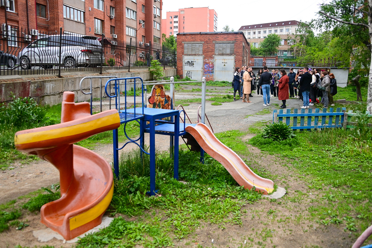 «Это место идеально подходит для детской площадки, тем более что их не хватает в районе, – говорит Надежда. – Только на улице Пестеля есть и рядом с МГУ им. Г. И. Невельского. Раньше семьи в детском саду гуляли: но теперь там забор в антитеррористических целях поставили. Поэтому инициативные жители Станюковича сделали проект площадки и пытаются его продвинуть. Но в чём проблема? Обычно такие проекты выигрывают, если детскую площадку собираются строить на придомовом участке. А этот – составной, одна его часть принадлежит муниципалитету».
