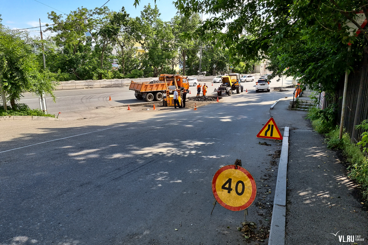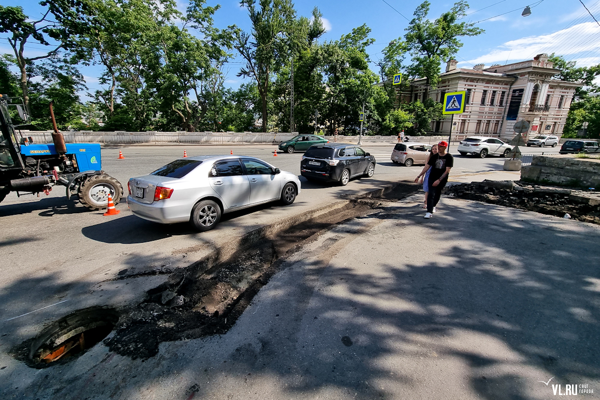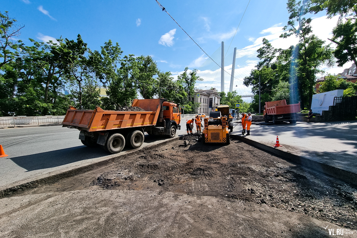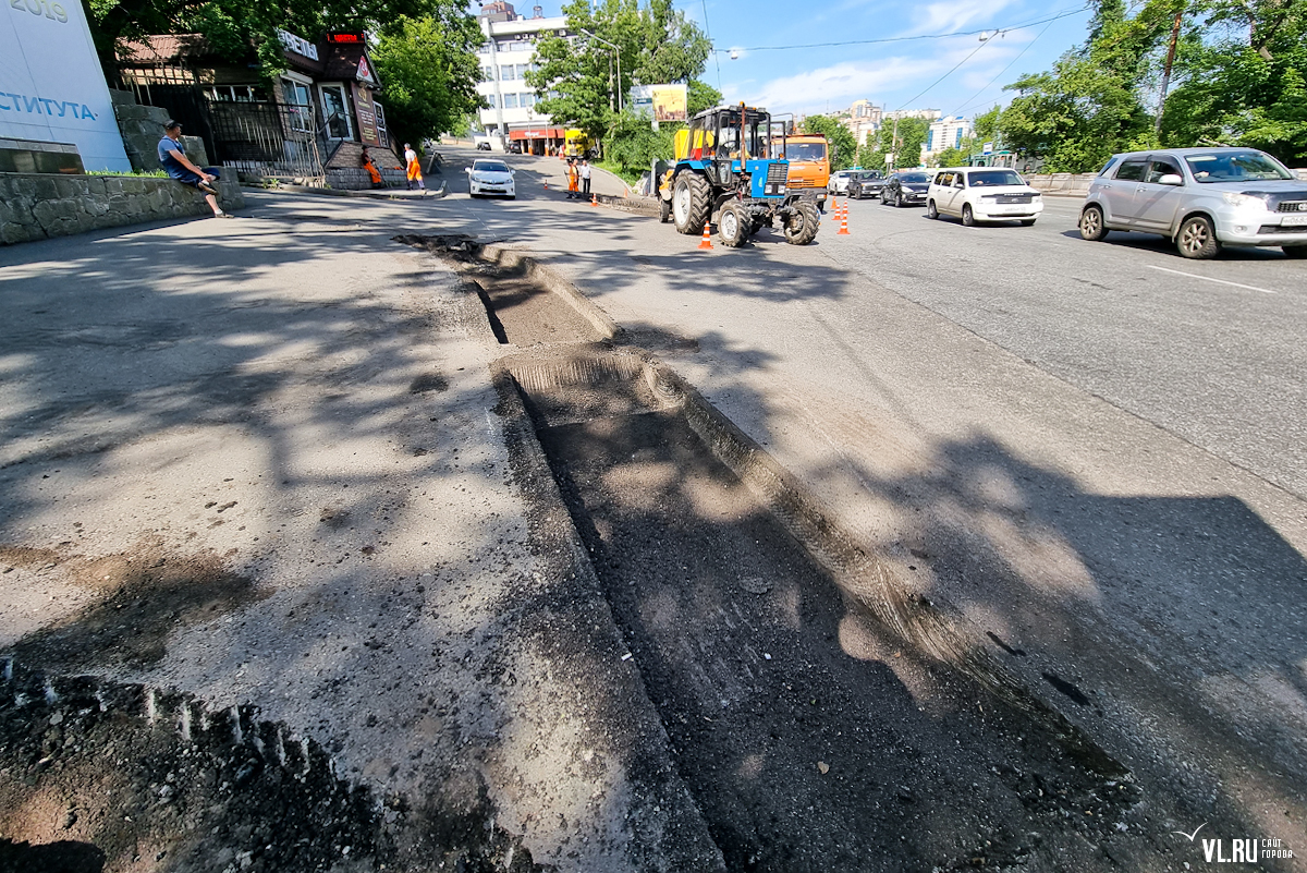 Теперь же прямо посреди дороги рабочие сняли толстый слой асфальта, обозначив будущий островок безопасности. Ещё одну полосу асфальта сняли рядом с въездом на территорию бывшего ДВГТУ. Видимо, здесь тоже появится бордюр, и машины больше не смогут парковаться.