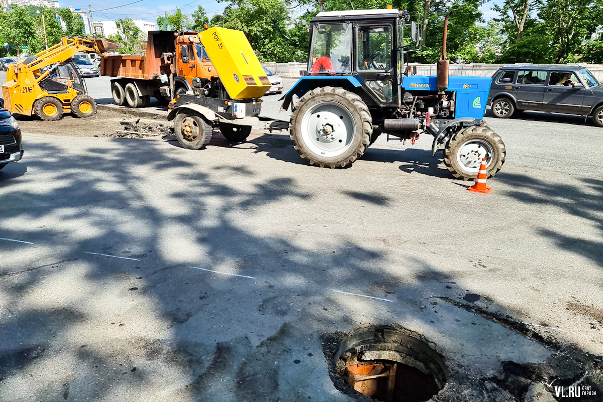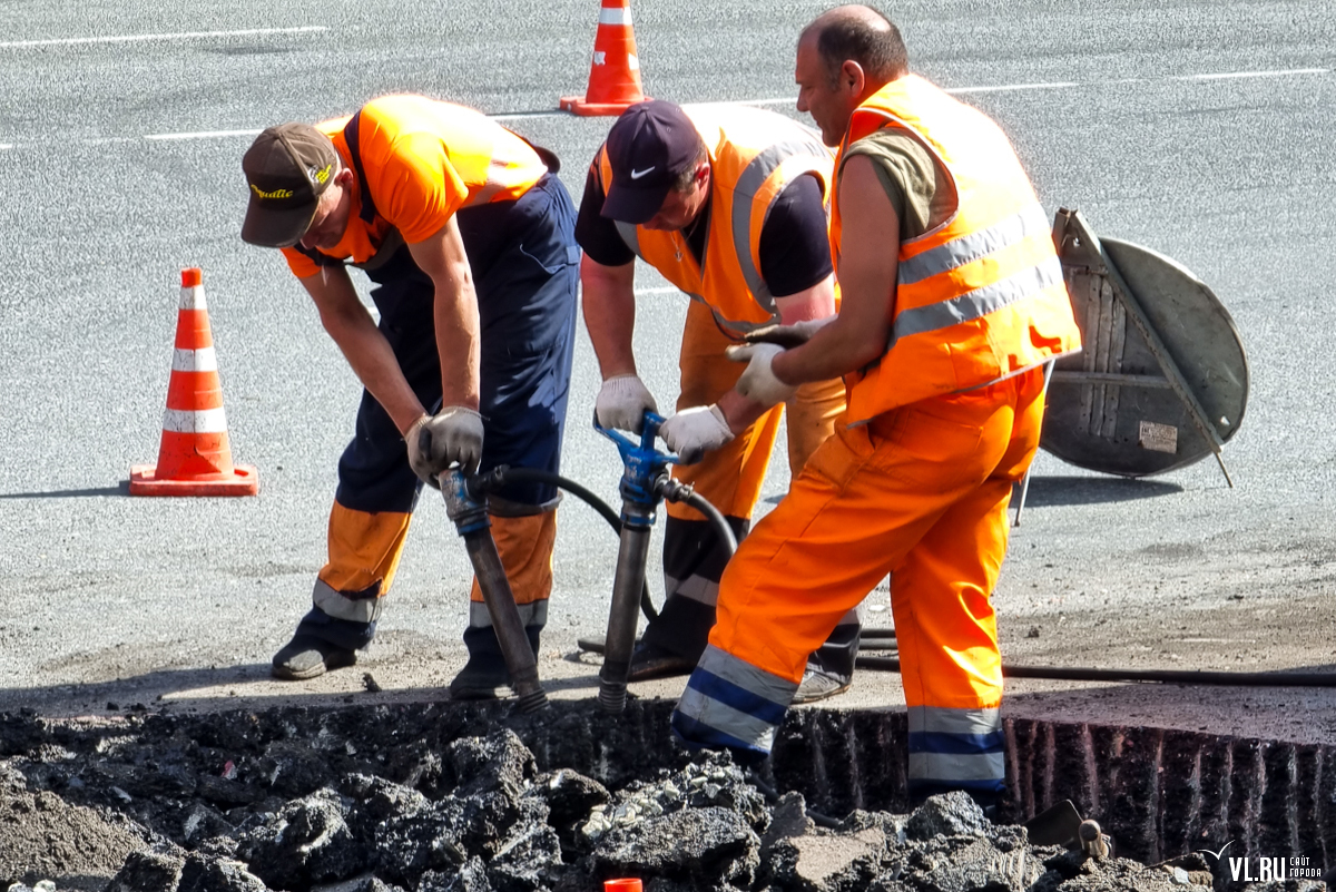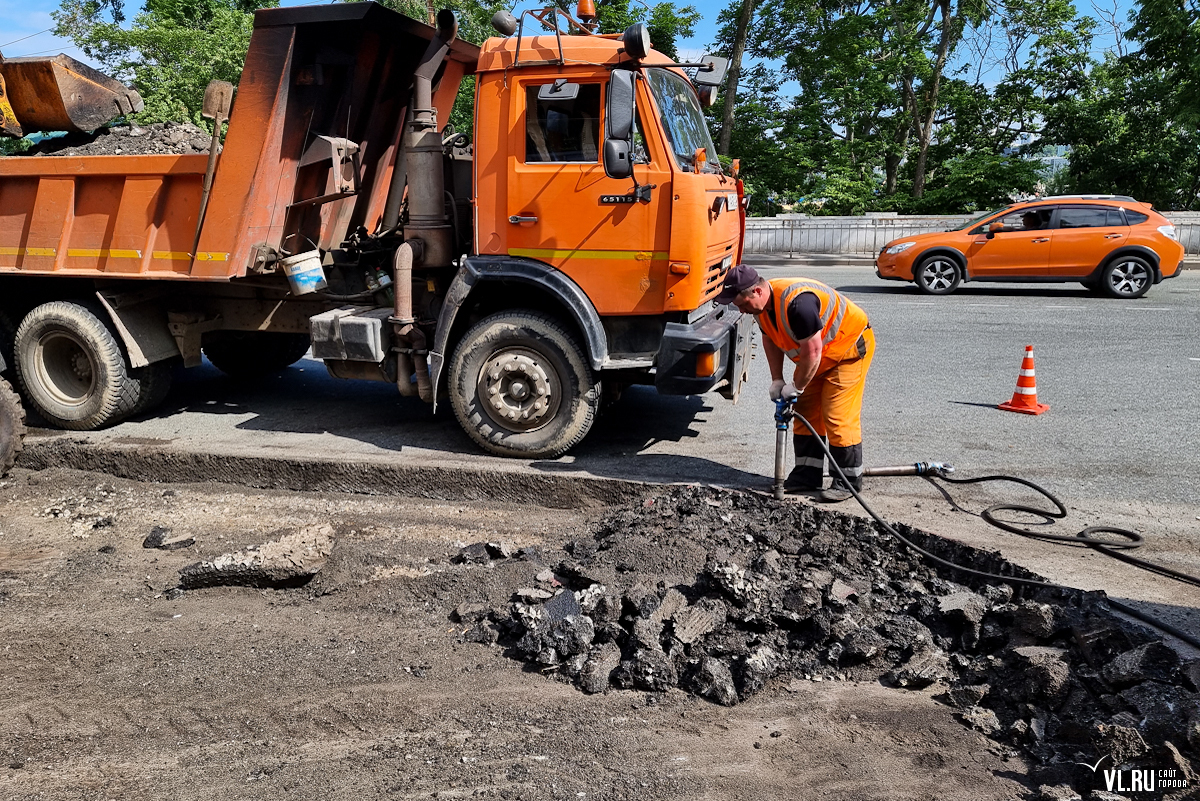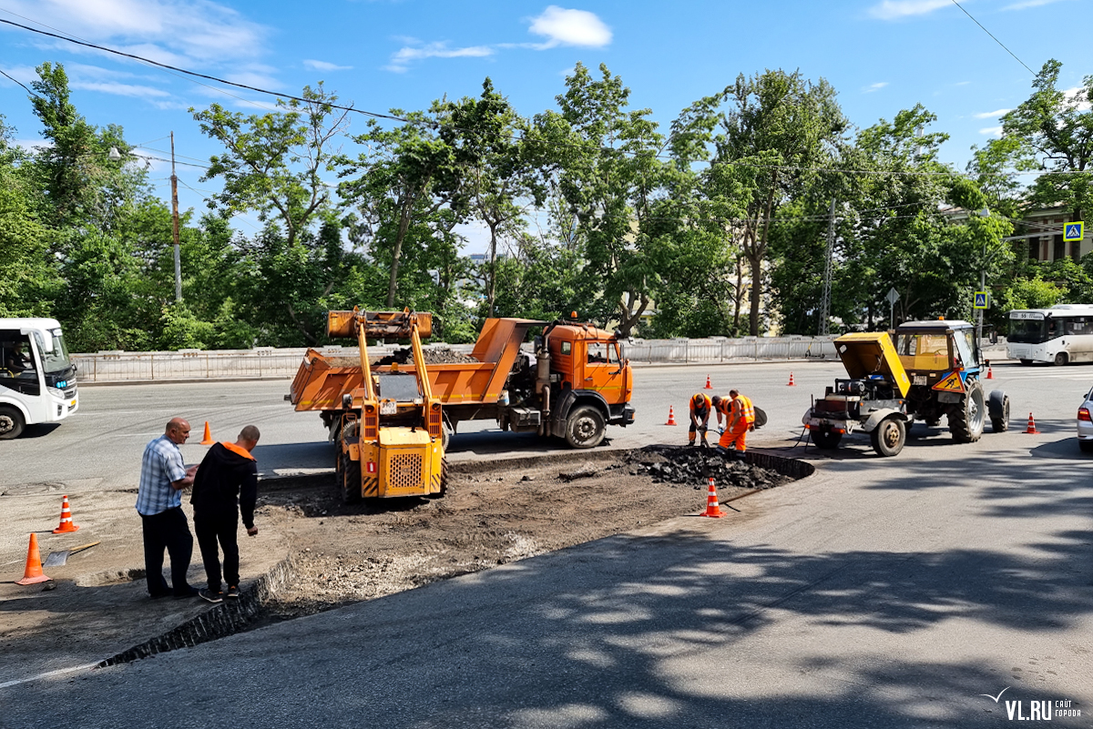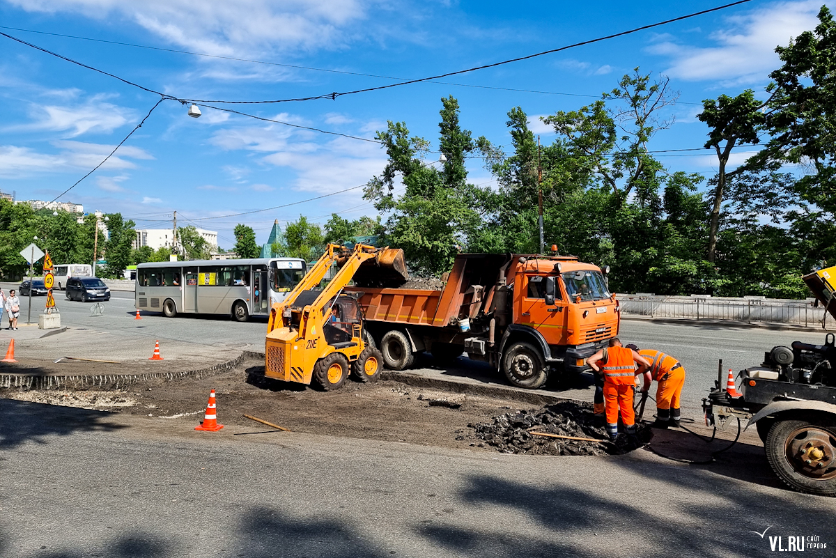 Теперь же прямо посреди дороги рабочие сняли толстый слой асфальта, обозначив будущий островок безопасности. Ещё одну полосу асфальта сняли рядом с въездом на территорию бывшего ДВГТУ. Видимо, здесь тоже появится бордюр, и машины больше не смогут парковаться.
