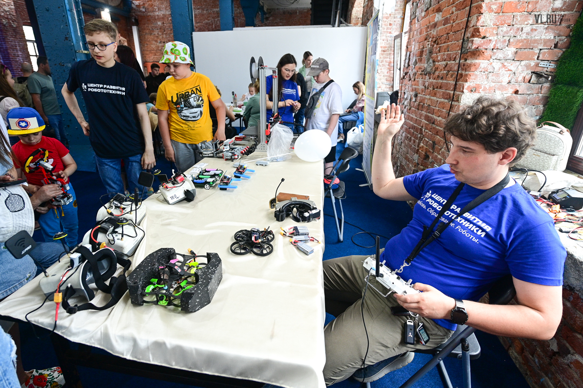 Буквально за дверью рассказывает о своих полётах лётчик-космонавт Андрей Борисенко, который провёл на орбите 337 дней. А в это время над вашей головой жужжит юркий маленький дрон – при помощи пульта и виртуальных очков машиной управляет преподаватель Центра развития робототехники Сергей Сарин. После полёта «пилот» отвечает на вопросы гостей, даёт познакомиться с моделями – все их обезопасили для помещения, закрыв лопасти.