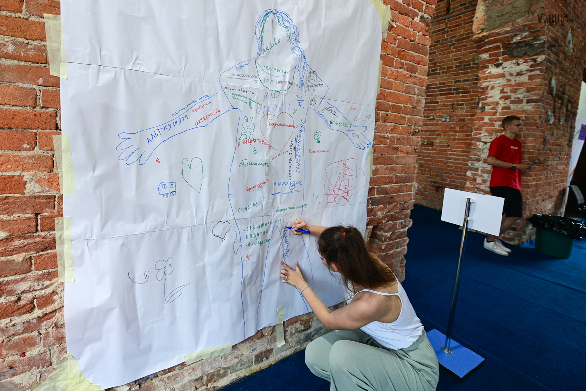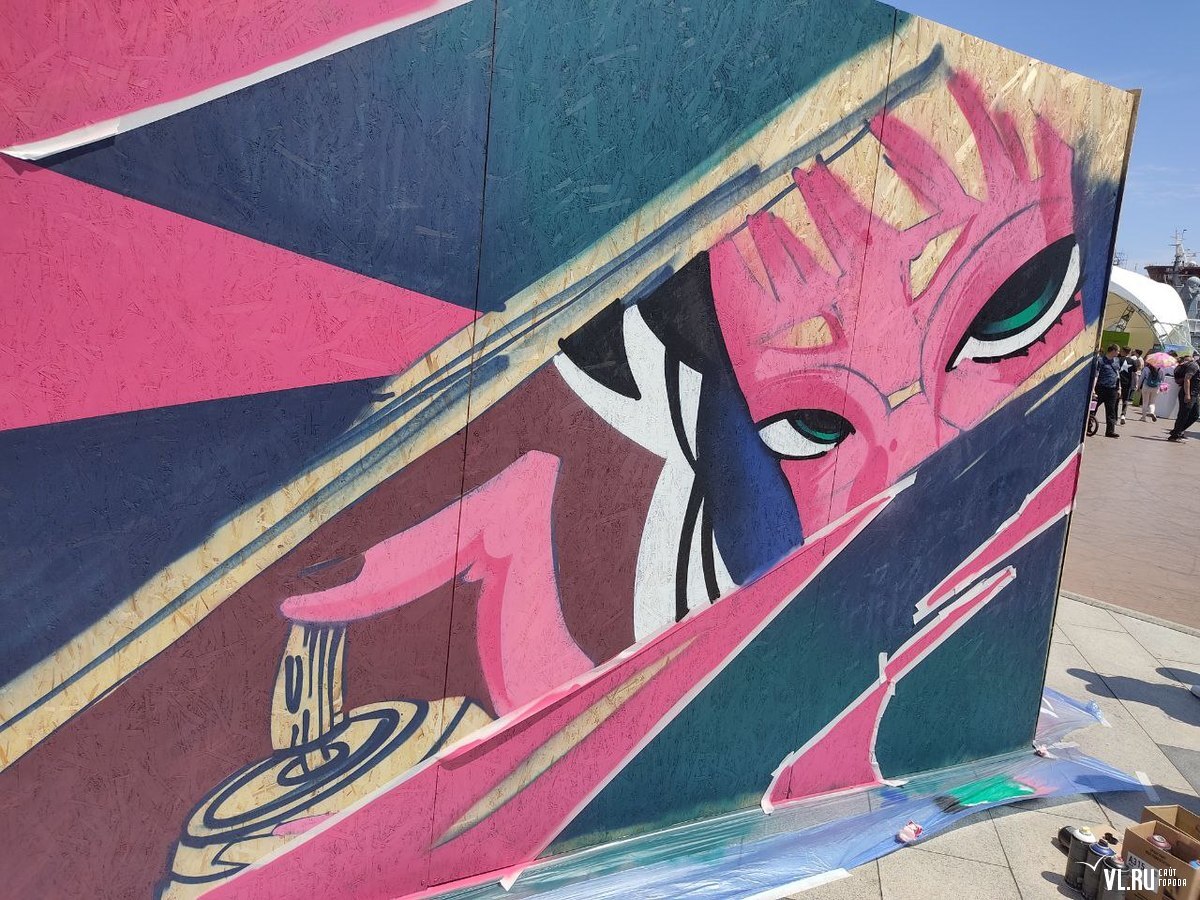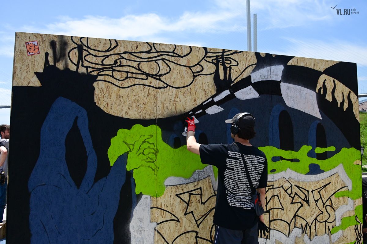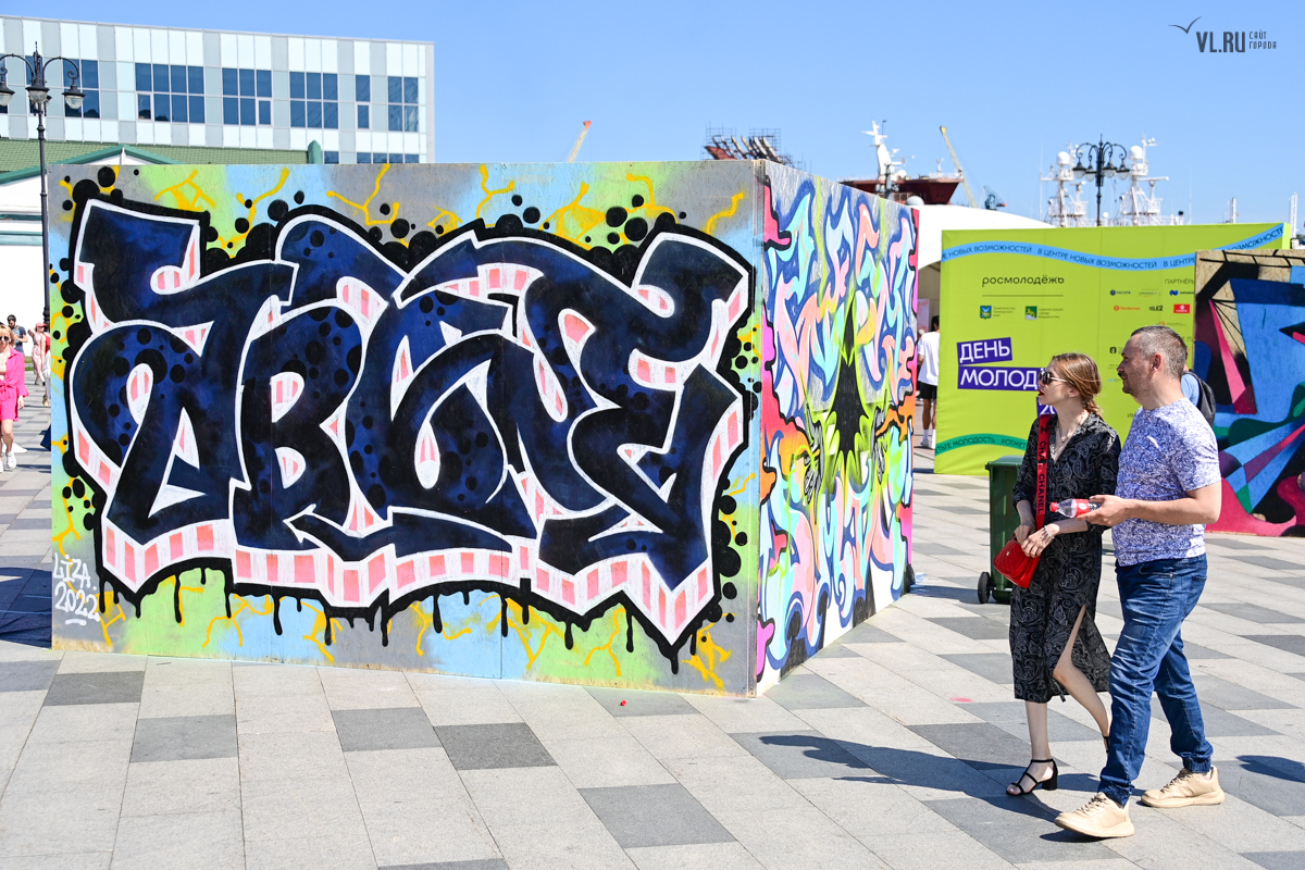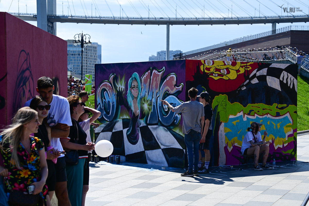 Пока спортсмены соревновались в силе и ловкости, участники соседней секции творили искусство. Специально установленные в честь Дня молодёжи «стены» уличные художники расписывали граффити. Среди трудночитаемых надписей внимание корреспондента VL.ru привлёк женский взгляд: изображение-портрет уличной художницы с баллоном краски в руке придумал и воплотил её «коллега» Сергей Мотофанов.