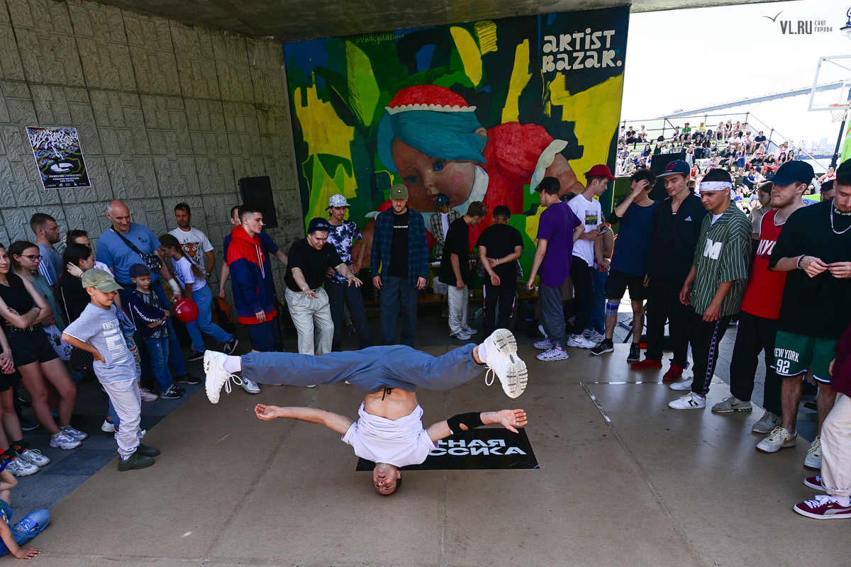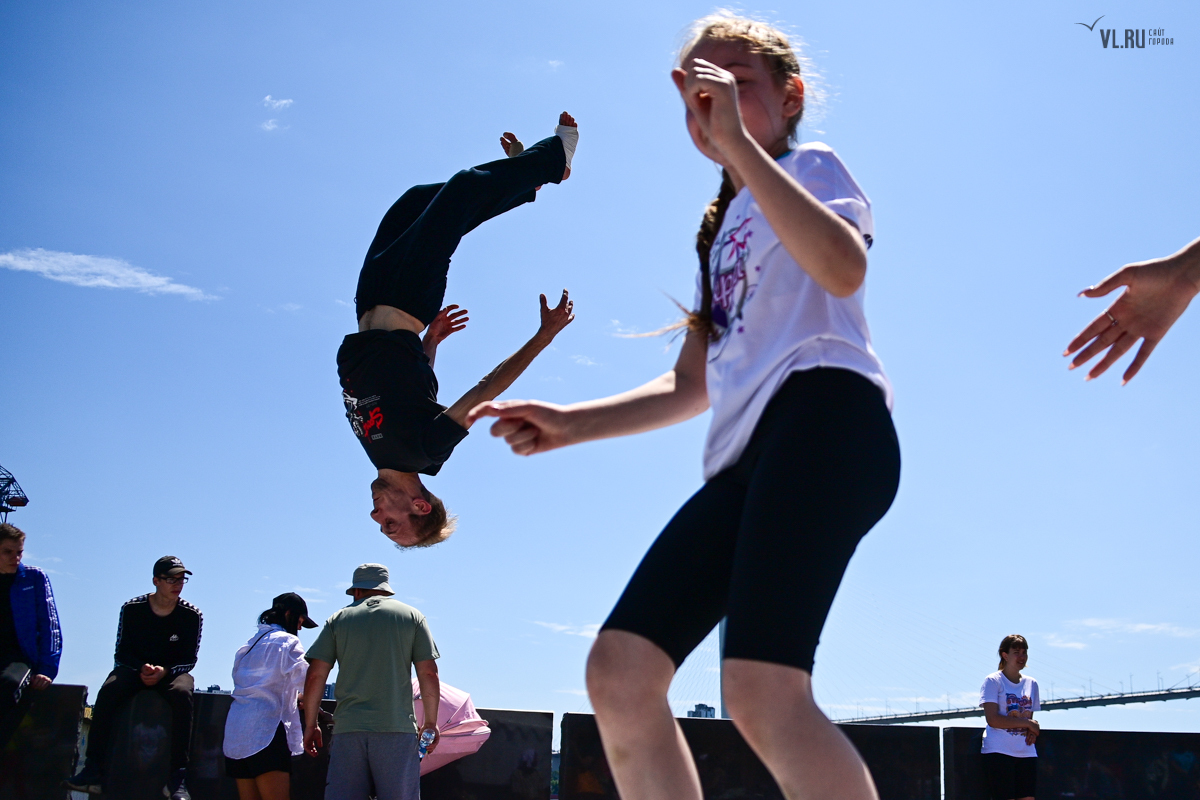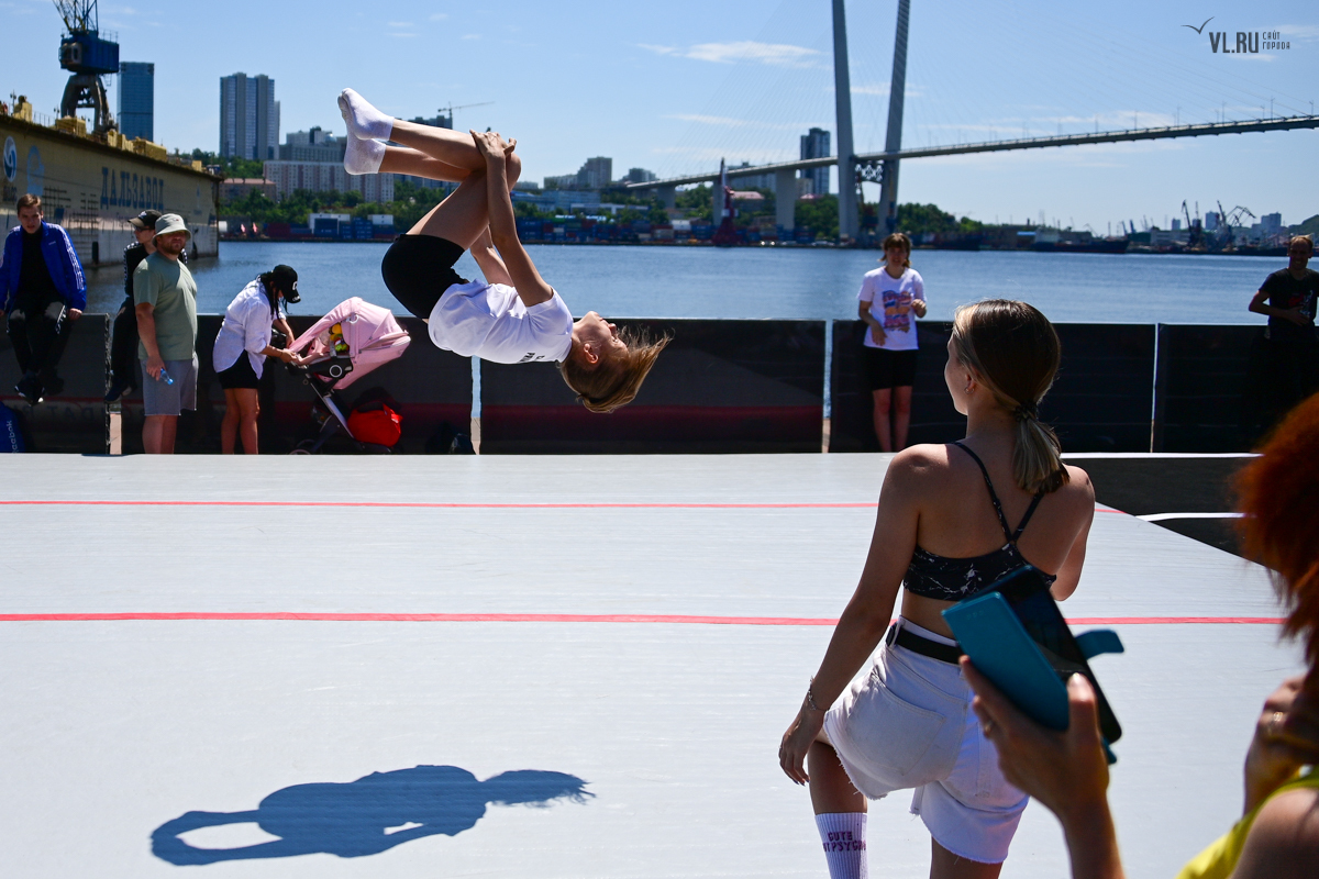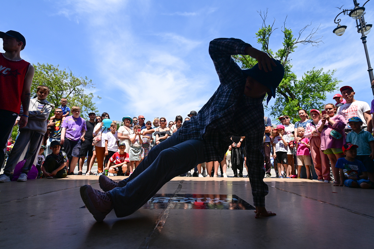 Самыми зрелищными событиями первой половины дня стали, конечно же, спортивные состязания. Любители активного образа жизни расположились в самом центре набережной сразу на нескольких площадках. Танцоры с бешеной скоростью крутились на уложенном поверх асфальта оргалите, демонстрируя «высший пилотаж» брейк-данса.