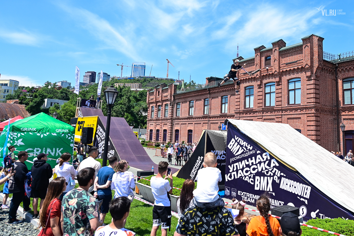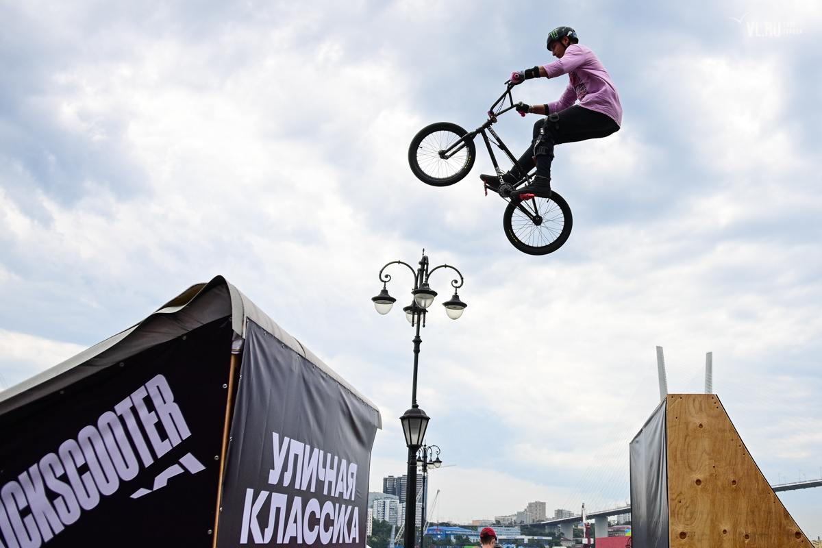 Экстремалы на самокатах и велосипедах BMX готовились к выступлениям гораздо дольше – неподалёку был установлен большой трамплин «биг-эйр», один конец которого закрепили на фургоне многотонного грузовика. Организаторы назвали эту рампу самой большой на Дальнем Востоке.