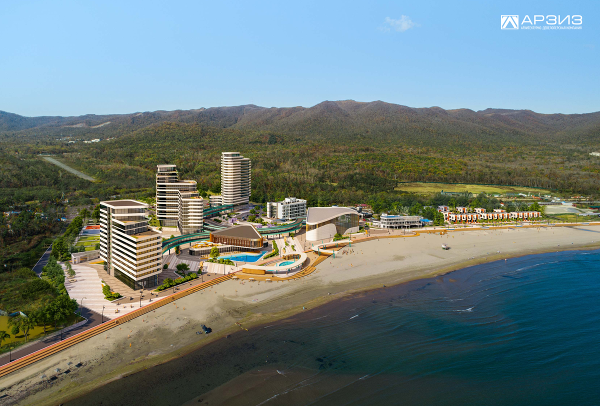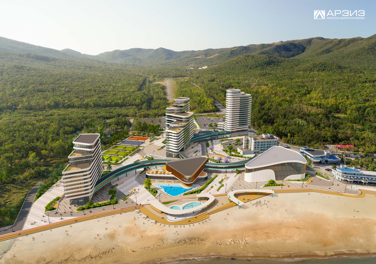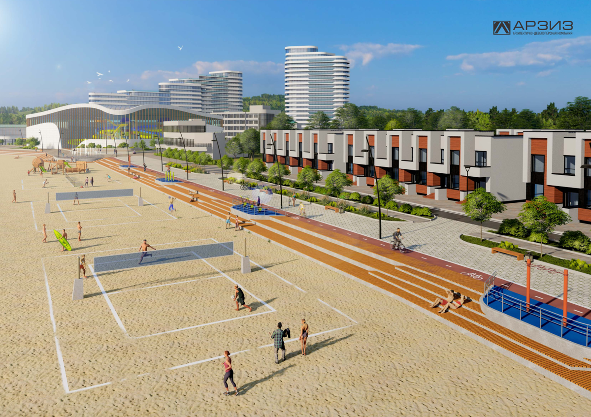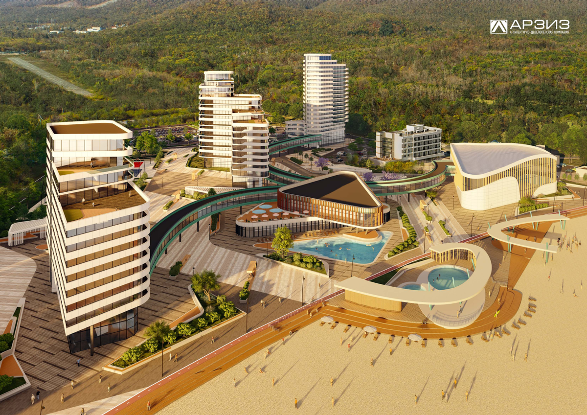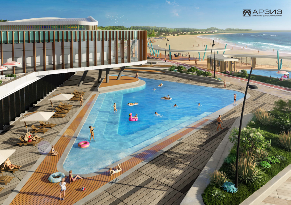Речь идёт о территории вокруг так называемого первого пляжа, на месте которой сейчас городок отдыха «Жемчужный» с 1-2-этажными домиками. Дизайнеры представили на их месте настоящий курорт с бассейнами по открытым небом, зданиями высотой до 20 этажей и многочисленными переходами между ними.