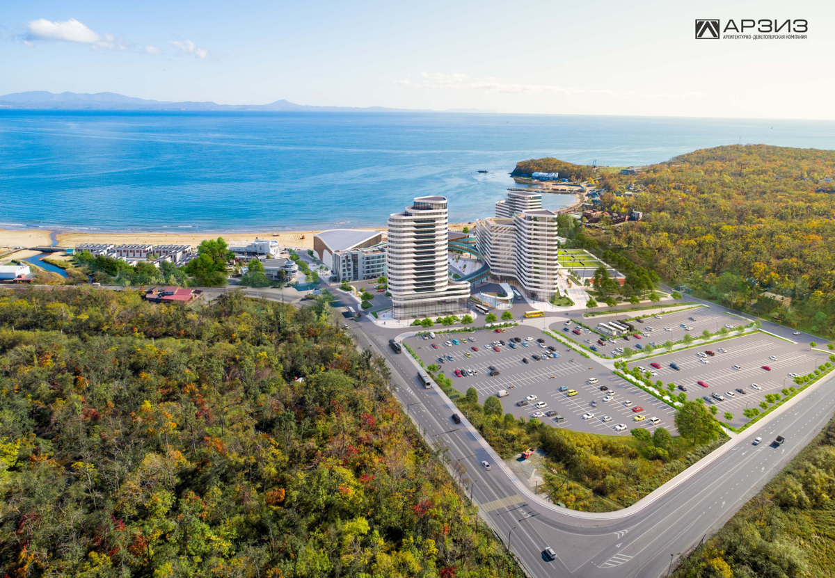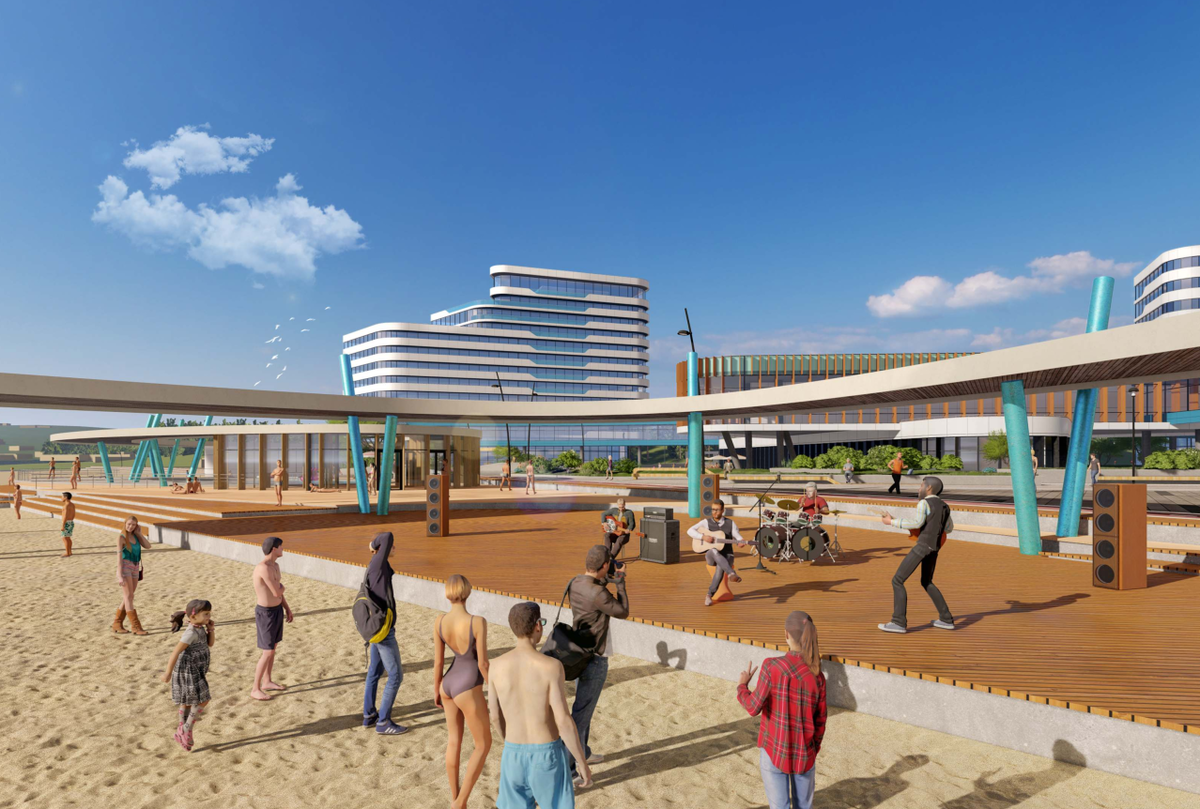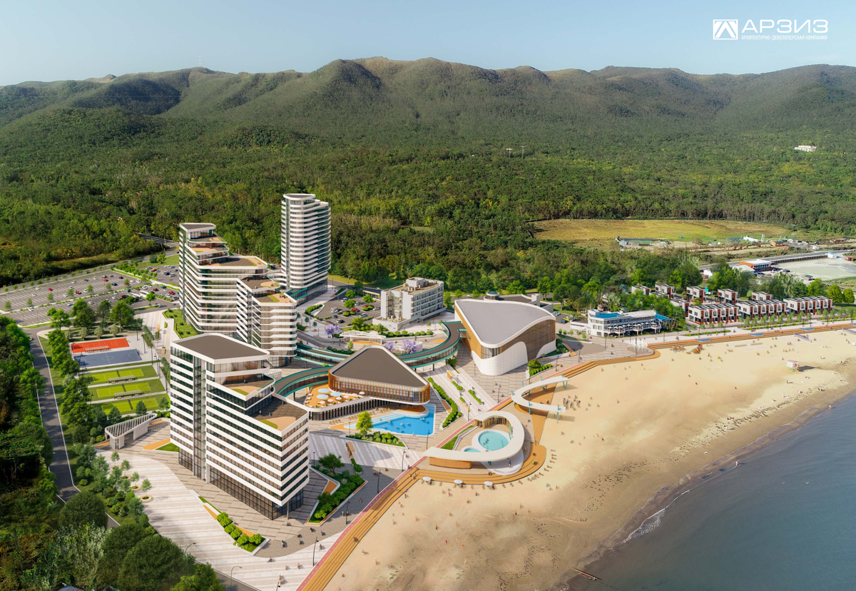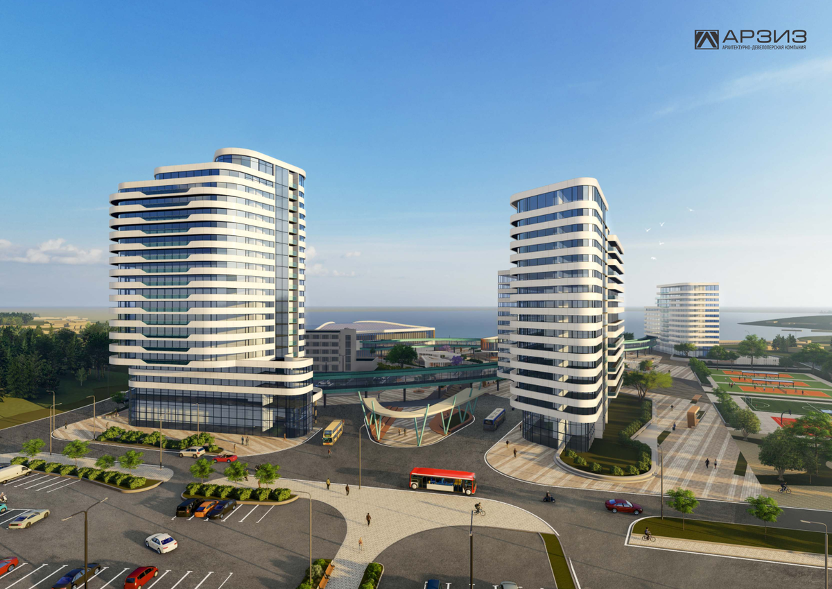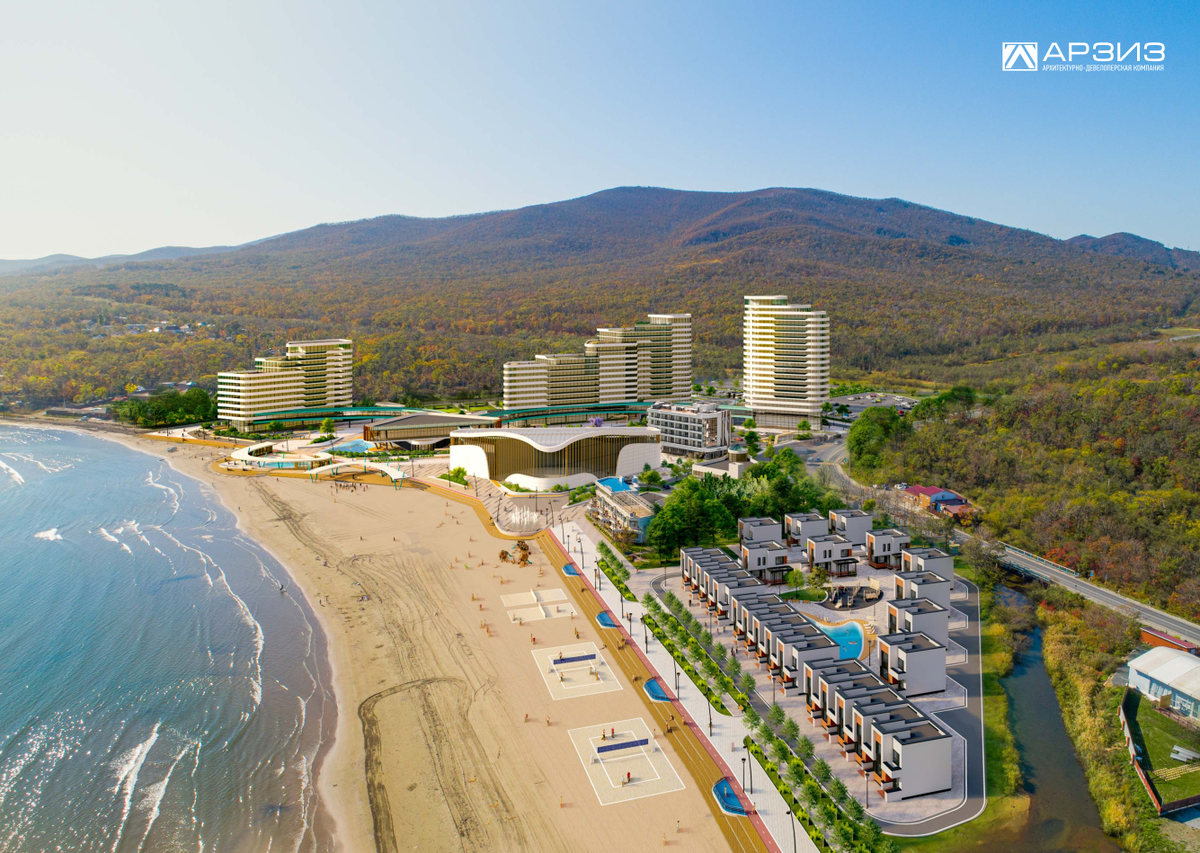 Речь идёт о территории вокруг так называемого первого пляжа, на месте которой сейчас городок отдыха «Жемчужный» с 1-2-этажными домиками. Дизайнеры представили на их месте настоящий курорт с бассейнами по открытым небом, зданиями высотой до 20 этажей и многочисленными переходами между ними.