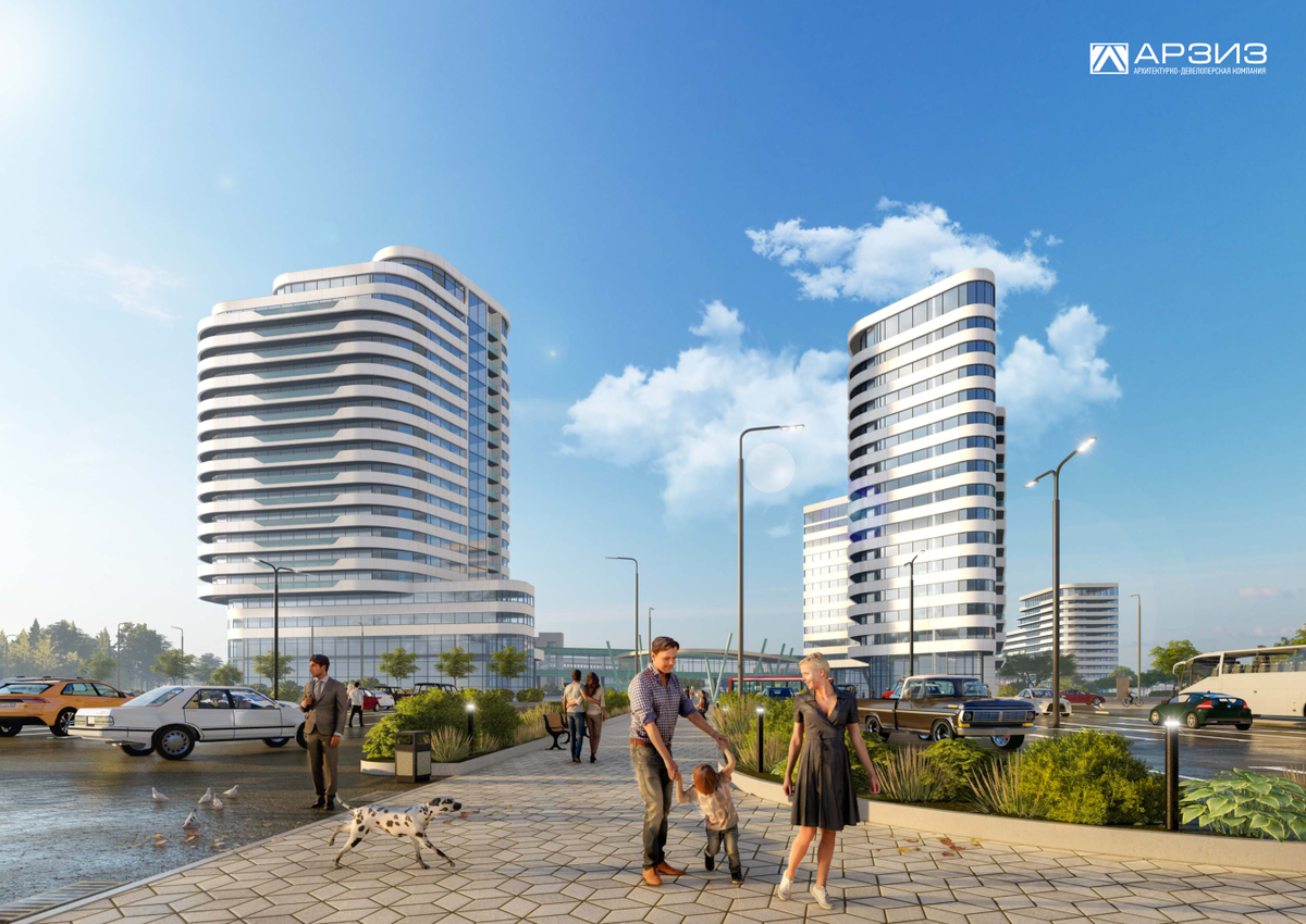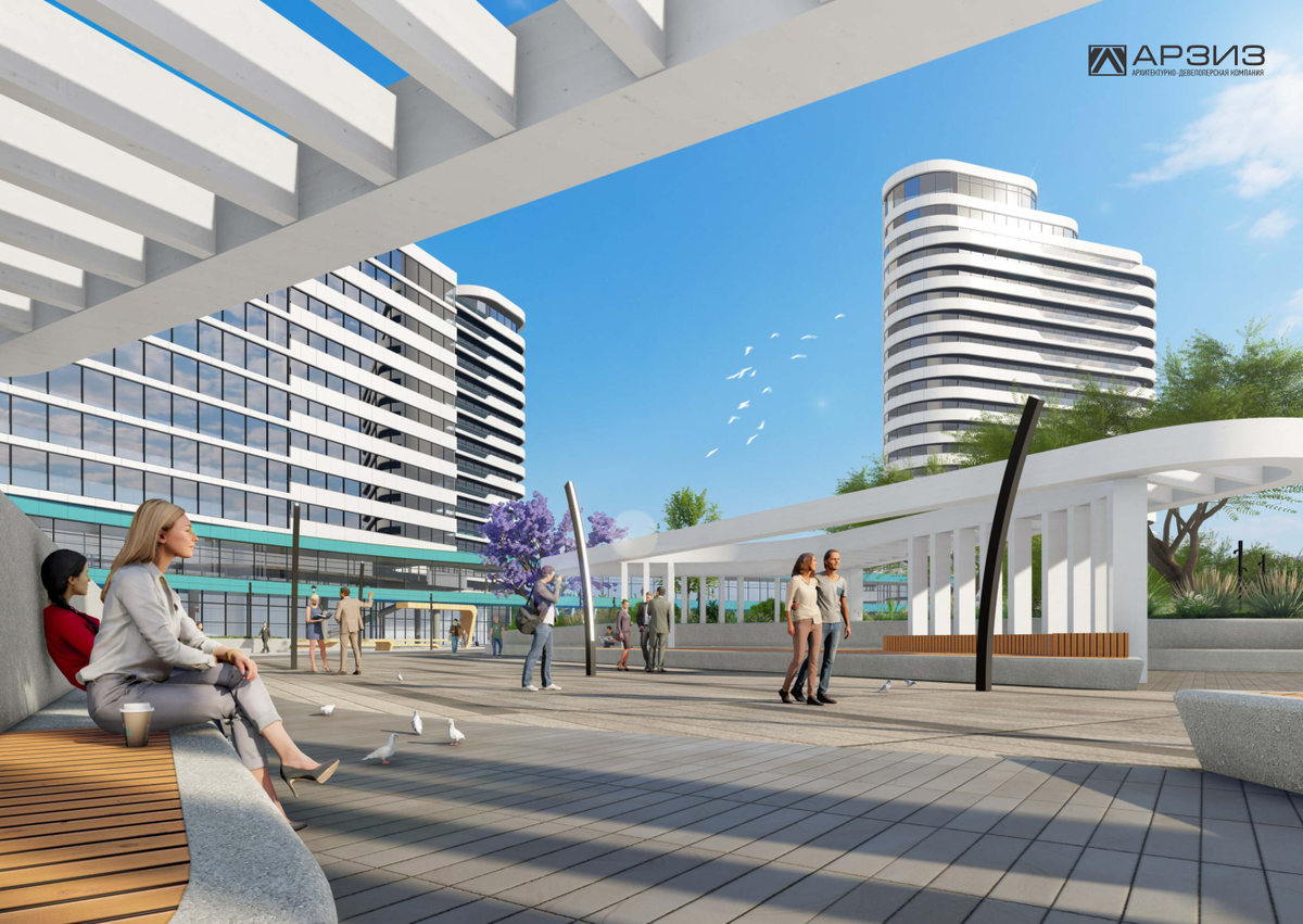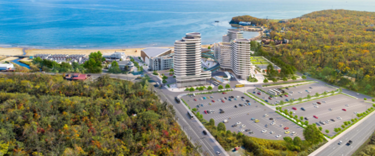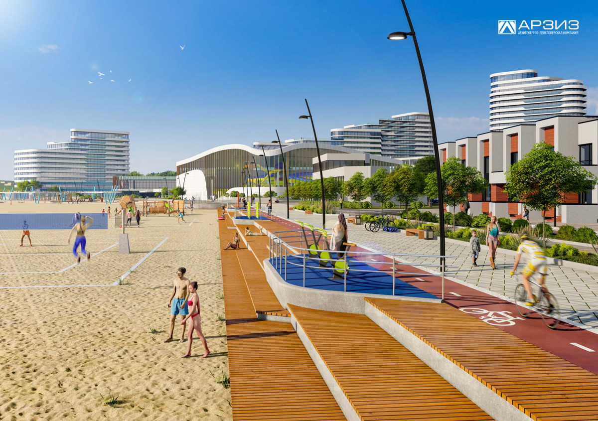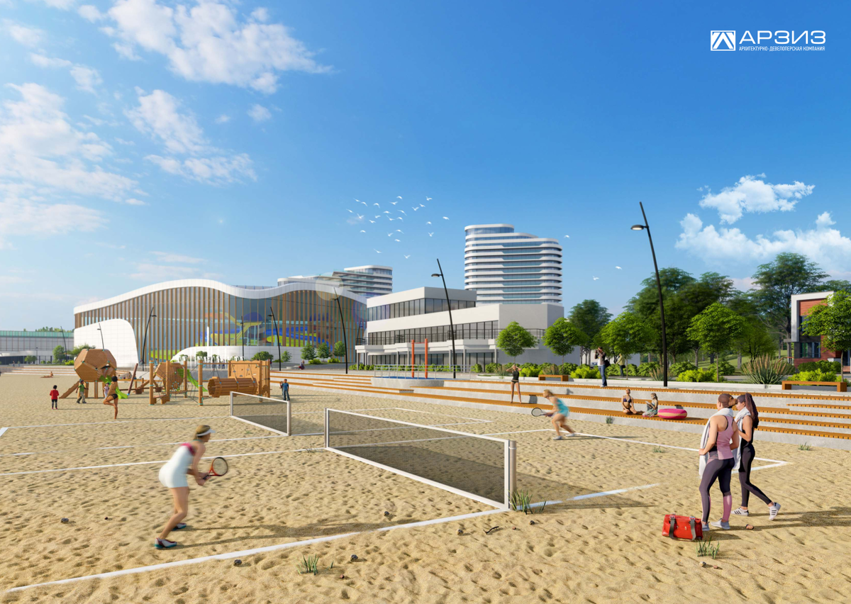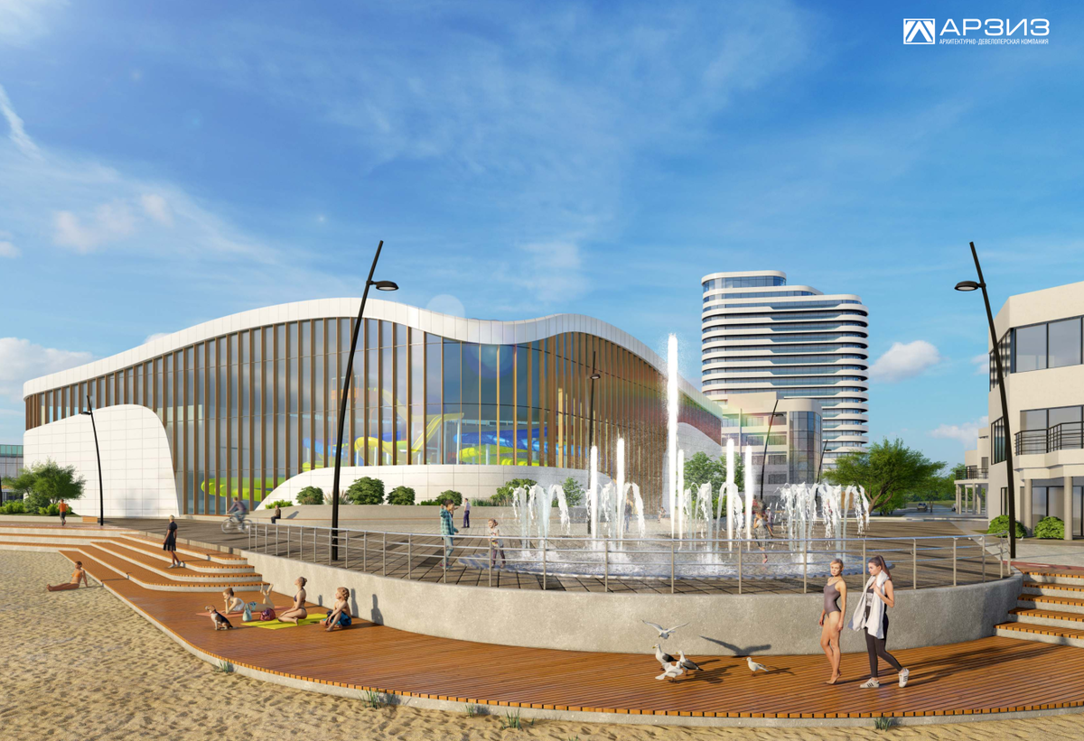Речь идёт о территории вокруг так называемого первого пляжа, на месте которой сейчас городок отдыха «Жемчужный» с 1-2-этажными домиками. Дизайнеры представили на их месте настоящий курорт с бассейнами по открытым небом, зданиями высотой до 20 этажей и многочисленными переходами между ними.