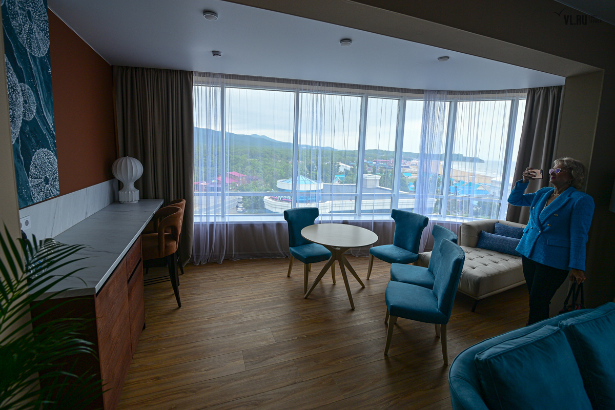 В пятиэтажном здании разместились пятьдесят номеров. Стоимость проживания в них варьируется от 5,5 до 16,5 тысячи рублей за ночь в зависимости от сезона, уровня комфорта и прочих факторов. Номера обставлены в современном «круизном» стиле – бело-голубые тона текстиля в сочетании со светлым деревом мебели напоминают палубу прогулочной яхты. По словам Людмилы Слепцовой, генерального директора ООО «Лотс», компании удалось ещё до пандемии заключить контракты с Китаем на поставку предметов интерьера и строительных материалов.