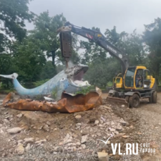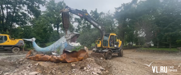 Утром во вторник, 12 июля, рабочие подрядной организации завершили демонтаж скульптуры кита в сквере на Русской. Массивную фигуру невозможно было вывезти целиком, поэтому её пришлось разрушить – для этой цели применили гидромолот. Напомним, в будущем покрытия на центральной площадке сквера декорируют образами кита, но от первоначального его «воплощения» здесь было решено избавиться.