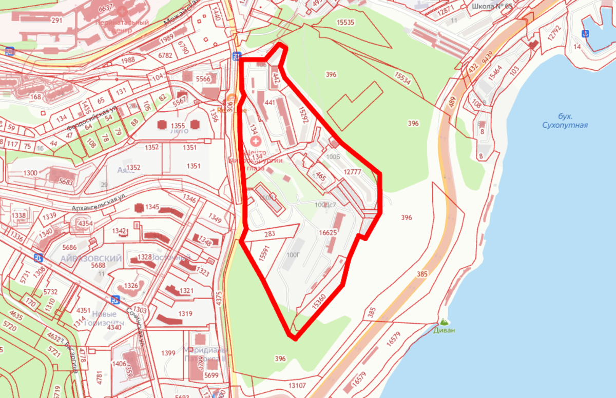 Сейчас администрация Владивостока проводит общественное обсуждение проекта планировки территории, который был выполнен по заказу застройщика. Это территория, которая занята сейчас участками 25:28:030018:16625, 25:28:030018:15358, 25:28:030018:441 и несколькими прилегающими. Отдельно стоит упомянуть, что в планируемую территорию входит участок 25:28:030018:15360, на котором располагается береговая батарея № 310 «Соболь» – памятник архитектуры, хоть и слегка потрёпанный, но с защитной зоной.