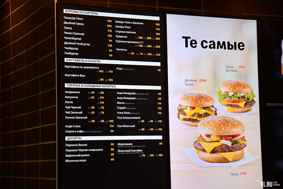 Цены в меню остались прежними, а вот часть бургеров из меню «Макдоналдса» гости не досчитались. В ресторане говорят, что некоторые позиции будут доступны позднее. И здесь всё ещё можно приобрести кока-колу, в то время как в других подобных предприятиях её уже начали заменять российскими аналогами.