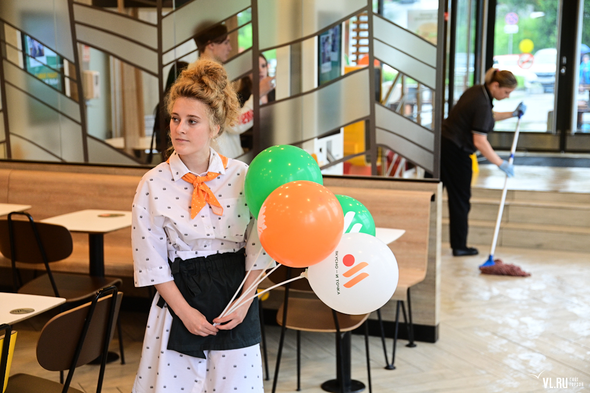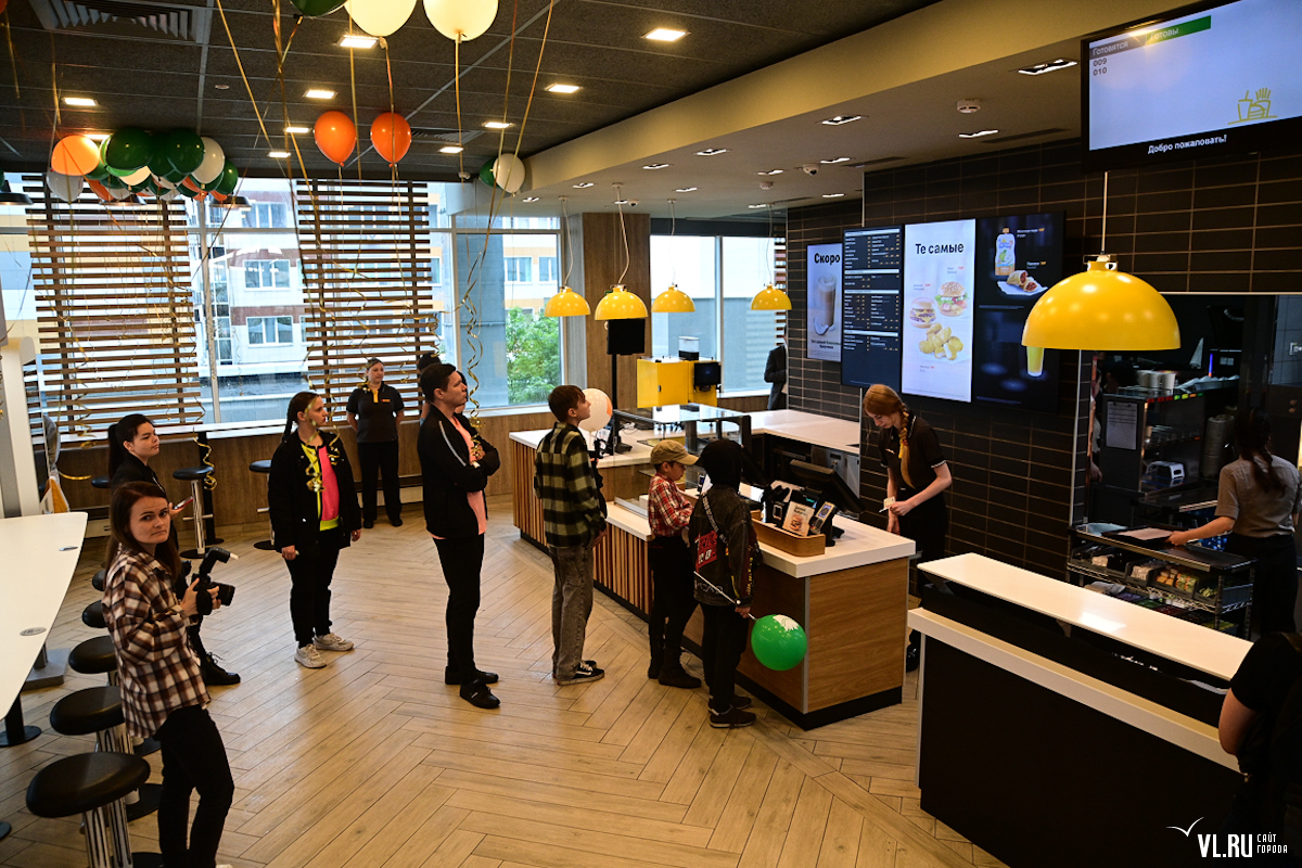 Право перерезать атласную ленту с новым логотипом предоставили представителю администрации Владивостока, управляющему заведением и двум мальчикам, которые ждали открытия «Макдональдса» с марта. После церемонии ребят угостили бургерами, картошкой фри и напитками.